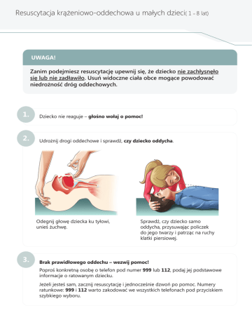 Resuscytacja krążeniowo-oddechowa u małych dzieci( 1 – 8 lat) UWAGA! Zanim podejmiesz resuscytację upewnij się, że dziecko nie zachłysnęło się lub nie zadławiło. Usuń widoczne ciała obce mogące powodować niedrożność dróg oddechowych. 1. Dziecko nie reaguje – głośno wołaj o pomoc! 2. Udrożnij drogi oddechowe i sprawdź, czy dziecko oddycha. Odegnij głowę dziecka ku tyłowi, unieś żuchwę. 3. Sprawdź, czy dziecko samo oddycha, przysuwając policzek do jego twarzy i patrząc na ruchy klatki piersiowej. Brak prawidłowego oddechu – wezwij pomoc! Poproś konkretną osobę o telefon pod numer 999 lub 112, podaj jej podstawowe informacje o ratowanym dziecku. Jeżeli jesteś sam, zacznij resuscytację i jednocześnie dzwoń po pomoc. Numery ratunkowe: 999 i 112 warto zakodować we wszystkich telefonach pod przyciskiem szybkiego wyboru. Resuscytacja krążeniowo-oddechowa u małych dzieci (1 – 8 lat) 4. Wykonaj 5 oddechów ratowniczych i ponownie sprawdź oddech. Odegnij głowę dziecka i unieś żuchwę, zaciśnij dłonią miękkie części nosa, rozchyl usta dziecka, nabierz powietrza. 5. Wykonaj powolny wdech do ust dziecka trwający ok. 1–1,5 sek., obserwuj równocześnie unoszenie się klatki piersiowej. Nabierając kolejny wdech obserwuj opadanie klatki piersiowej dziecka. Masaż serca 30 uciśnięć. około 5 cm Wykonaj 30 uciśnięć w centralnej części klatki piersiowej na głębokość około 5 cm (1/3 wymiaru przednio-tylnego) z częstotliwością 100–120 uciśnięć/min. – technika uciskania jedną lub u starszych dzieci dwoma rękami. 6. Wykonaj 2 oddechy, a po nich kolejnych 30 uciśnięć. KONTYNUUJ RESUSCYTACJĘ DO MOMENTU PRZYBYCIA POMOCY, POWROTU OZNAK ŻYCIA LUB WYCZERPANIA WŁASNYCH SIŁ. Opracowane na podstawie Wytycznych Resuscytacji European Resuscitation Council (ERC) 2010 2 ODDECHY ↓ 30 UCIŚNIĘĆ