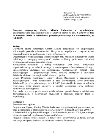 Załącznik Nr 1 do Uchwały Nr XXVIII/237/05 Rady Miejskiej w Radomsku z dnia 8 lutego 2005r. Program współpracy Gminy Miasta Radomska z organizacjami pozarządowymi oraz podmiotami o których mowa w art. 3 ustawy z dnia 24 kwietnia 2003r. o działalności poŜytku publicznego i o wolontariacie, na rok 2005. Wstęp Głównym celem samorządu Gminy Miasta Radomska jest zaspokojenie zbiorowych potrzeb mieszkańców. SłuŜy temu współpraca z organizacjami pozarządowymi i z podmiotami z nimi zrównanymi. Organizacje te współdziałając z samorządem przy realizacji określonych zadań publicznych, pomagają rozwiązywać waŜne problemy społeczności lokalnej, wzbogacając działania organów gminy. Korzyściami płynącymi z takiej współpracy jest takŜe budowanie odpowiedzialnego za siebie i za swoje otoczenie społeczeństwa obywatelskiego. Społeczeństwa dąŜącego do rozpoznania występujących potrzeb oraz poszukującego i proponującego nowe, bardziej efektywne i oszczędne działania, słuŜące realizacji zadań własnych gminy. Celem Programu współpracy Gminy Miasta Radomska z organizacjami pozarządowymi oraz podmiotami z nimi zrównanymi, które prowadzą działalność poŜytku publicznego, na rok 2005 jest określenie zasad w zakresie wspierania przez miasto inicjatyw i działań organizacji przy realizacji ustawowych zadań gminy. Jest takŜe wyrazem przekonania władz miasta, potwierdzonym wieloletnim doświadczeniem, o korzyściach płynących z realizacji róŜnych form tej współpracy. Rozdział I Postanowienia ogólne Program współpracy Gminy Miasta Radomska z organizacjami pozarządowymi oraz podmiotami o których mowa w art. 3 ustawy z dnia 24 kwietnia 2003 r. o działalności poŜytku publicznego i o wolontariacie, na rok 2005 jest waŜnym elementem polityki społeczno-finansowej Miasta. Program określa formy, zasady , a takŜe cele i priorytetowe zadania, których realizacja związana będzie z udzieleniem pomocy finansowej. 1 Obszar współpracy samorządu Miasta Radomska z organizacjami pozarządowymi obejmuje sferę zadań publicznych ujętych w art. 4 w/w ustawy, o ile zadania te są zadaniami Miasta. Uznając, w oparciu o zgłoszone przez podmioty prowadzące działalność poŜytku publicznego zadania, za rozpoznane potrzeby i oczekiwania lokalnej społeczności, uwzględniając moŜliwości finansowe Radomska w roku 2005 ustalone zostają priorytetowe obszary, w których moŜliwa jest współpraca przy realizacji zadań publicznych. Obszarami tymi są: 1. Ochrona zdrowia – przeciwdziałanie alkoholizmowi 2. Kultura i ochrona dziedzictwa narodowego 3. Kultura fizyczna i rekreacja 4. Wypoczynek dzieci i młodzieŜy 5. Pomoc społeczna 6. Współpraca zagraniczna 7. Ekologia i ochrona środowiska Rozdział II Zasady współpracy Zlecenie realizacji zadań organizacjom pozarządowym i podmiotom z nimi zrównanym, które prowadzą działalność poŜytku publicznego obejmują w pierwszej kolejności zadania z tych obszarów, które uznane zostały w Programie za priorytetowe i odbywa się po przeprowadzeniu otwartego konkursu ofert, lub jeŜeli dane zadanie moŜna zrealizować efektywniej, w drodze zakupu usług na zasadzie i w trybie określonym w ustawie o zamówieniach publicznych bądź innych ustaw, które przewidują inny sposób zlecania. Konkursy ofert będą ogłaszane i przeprowadzane w oparciu o przepisy ustawy z dnia 24 kwietnia 2003r. o działalności poŜytku publicznego i o wolontariacie oraz wydanych na jej podstawie przepisów wykonawczych. W treści ogłoszenia będą zawarte standardy realizacji zadań opłacanych ze środków miasta. Z ofertą realizacji wspólnego zadania publicznego będzie mogła wystąpić do władz miasta Radomska sama organizacja . W takim przypadku samorząd zobowiązany będzie do sprawdzenia , czy oferta odpowiada przyjętym na dany rok priorytetom oraz rozwaŜenie jej celowości. Współpraca samorządu z podmiotami odbywać się będzie na zasadach : pomocniczości, suwerenności stron, partnerstwa, efektywności uczciwej konkurencji i jawności. Kierując się zasadą pomocniczości, przy zachowaniu suwerenności stron, władze samorządowe respektować będą odrębność i suwerenność zorganizowanych wspólnot mieszkańców miasta, uznając ich prawo do samodzielnego definiowania i rozwiązywania problemów publicznych, 2 współpracując z nimi, a takŜe wspierając ich działania na zasadach i w formach przewidzianych prawem. Zgodnie z zasadą partnerstwa na zasadach i w formie przewidzianej prawem uczestniczyć będą w identyfikowaniu i definiowaniu problemów mieszkańców miasta poprzez zgłaszanie ofert, dziedzin i form współpracy, standardów usług publicznych, a takŜe, jeśli to moŜliwe, będą wykonywać te zadania. W myśl zasady efektywności miasta Radomsko dokonywać będzie wyboru najefektywniejszego sposobu wykorzystania publicznych środków finansowych, przestrzegając zasad uczciwej konkurencji. Mając na uwadze zasadę jawności samorząd udostępniać będzie współpracującym z nim podmiotom informacje o zasadach, celach i środkach finansowych zaplanowanych na realizację zadań publicznych. W zamian oczekiwać będzie udostępnienia danych dotyczących podmiotu, jego struktury, sposobu funkcjonowania, jego działalności statutowej i sytuacji finansowej. Rozdział III Współpraca Gminy Miasta Radomska z organizacjami pozarządowymi oraz z podmiotami z nimi zrównanymi prowadzącymi działalność poŜytku publicznego moŜe mieć charakter finansowy i pozafinansowy. Do form współpracy finansowej zalicza się zlecanie organizacjom i w/w podmiotom zadań publicznych, będących zadaniami własnymi gminy poprzez: - powierzenie wykonania zadań publicznych wraz z udzieleniem dotacji na finansowanie ich realizacji, - wspieranie wykonania zadań publicznych poprzez udzielenie dotacji na dofinansowanie ich realizacji. Do form współpracy pozafinansowej naleŜy: - wza