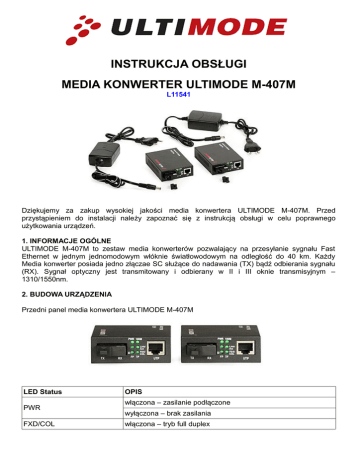 INSTRUKCJA OBSŁUGI MEDIA KONWERTER ULTIMODE M-407M L11541 Dziękujemy za zakup wysokiej jakości media konwertera ULTIMODE M-407M. Przed przystąpieniem do instalacji należy zapoznać się z instrukcją obsługi w celu poprawnego użytkowania urządzeń. 1. INFORMACJE OGÓLNE ULTIMODE M-407M to zestaw media konwerterów pozwalający na przesyłanie sygnału Fast Ethernet w jednym jednomodowym włóknie światłowodowym na odległość do 40 km. Każdy Media konwerter posiada jedno złączae SC służące do nadawania (TX) bądź odbierania sygnału (RX). Sygnał optyczny jest transmitowany i odbierany w II i III oknie transmisyjnym – 1310/1550nm. 2. BUDOWA URZĄDZENIA Przedni panel media konwertera ULTIMODE M-407M LED Status PWR FXD/COL OPIS włączona – zasilanie podłączone wyłączona – brak zasilania włączona – tryb full duplex wyłączona – tryb half-duplex włączona – połączenie zestawione poprawnie FX-LINK/ACT pulsuje – transmisja danych przez port RX wyłączona – brak połączenia włączona – połączenie zestawione poprawnie TX-LINK/ACT pulsuje – transmisja danych przez port TX wyłączona – brak połączenia SD 100M włączone – poprawnie zestawione połączenie optyczne wyłączona – brak połączenia optycznego włączona - prędkość połączenia 100Mb/s wyłączona - prędkość połączeni 10Mb/s Na przednim panelu urządzenia znajdują się: • złącza SC (pracuje z falą o długości 1310/1550nm przy nadawaniu i odbieraniu) • złącze RJ-45 • diody LED sygnalizacyjne UWAGA! Podczas pracy nie wolno patrzeć bezpośrednio w port optyczny. Do media konwertera M-407M należy podłączyć zasilanie zewnętrzne DC 5V dołączone w zestawie. 3. INSTALACJA 1. Proszę sprawdzić czy w opakowaniu znajdują się: ◦ media konwertery (para) ◦ zasilacze DC 5V ◦ instrukcja w języku polskim ◦ instrukcja w języku angielskim 2. Proszę zapoznać się szczegółowo z instrukcją urządzenia przed instalacją. 3. Używając skrętki kat.3, 4, 5 STP/UTP podłączyć urządzenie sieciowe do portu internetowego. 4. Podłącz światłowód do złącz SC. 5. Włącz zasilanie (diody kontrolne powinny się zaświecić). 4. WARUNKI BEZPIECZEŃSTWA • Nie wolno ściągać obudowy z urządzenia, • Nie wolno dotykać urządzenia mokrymi częściami ciała, • Nie wolno zasłaniać wlotów powietrza, • Nie wolno włączać urządzenia jeżeli jakikolwiek obiekt dostał się do środka, jak woda, przedmioty metalowe itp., • Nie stosować uszkodzonych lub zużytych kabli zasilania. • Prace instalacyjne powinny być wykonywane przez odpowiednio przeszkolony personel • Zabezpieczyć urządzenie przed dostępem osób niepowołanych • Jeżeli urządzenie zostanie przeniesione z miejsca chłodnego do ciepłego, w urządzeniu może skroplić się para wodna uniemożliwiająca poprawne działanie media konwertera. Przed przystąpieniem do dalszej pracy należy odczekać aż wilgoć odparuje. • Nie należy dotykać styków gniazd na obudowie urządzenia. Wyładowania elektrostatyczne mogą uszkodzić urządzenia. UWAGA! Podczas pracy nie wolno patrzeć bezpośrednio w port optyczny. 5. PARAMETRY TECHNICZNE Nazwa ULTIMODE M-407M KOD L11541 Standardy IEEE 802.3u Port LAN Port optyczny 802.3 (10Base-TX), 802.3u (100Base-TX/FX) RJ-45 UTP/STP kat. 3, 4, 5, maks. 100m Światłowód jednomoodwy 9/125μm Max 40 km Długość fali Tx 1310/1550 nm Długość fali Rx 1310/1550 nm Złącza optyczne 1x SC Moc nadawania >-10 dBm Czułość odbiornika <-32 dBm Szybkość transmsji 10/100 Mb/s Zasilanie 5V DC Temperatura pracy 0ºC ... 50ºC 6. INFORMACJE DODATKOWE PRODUCENT: DIPOL Gołaszewski Gwizdała Waśniowski Spółka Jawna POLAND, 31-587 Kraków, ul Ciepłownicza 40 www.dipol.com.pl REKLAMACJE: www.dipol.com.pl/reklamacje Firma DIPOL zastrzega sobie prawo do wprowadzania zmian w instrukcji i opisywanych urządzeniach bez uprzedniego powiadomienia. Przy opracowaniu podręcznika dołożono wszelkich starań, aby był bez błędów i aby były w nim podane wszystkie potrzebne informacje. Pomimo to firma DIPOL nie daje żadnych gwarancji, obejmujących bez ograniczeń jakiekolwiek gwarancje zastosowania do określonych celów, które by mogły wynikać z niniejszej instrukcji. Firma DIPOL nie ponosi żadnej odpowiedzialności za błędy zawarte w podręczniku, lub za przypadkowe, specjalne lub następcze szkody i straty, powstałe w wyniku przygotowania lub stosowania informacji zawartych w niniejszym podręczniku w trakcie obsługi urządzenia, lub związane z wydajnością urządzenia obsługiwanego zgodnie z tymi informacjami. Deklaracja Zgodności DIPOL Gołaszewski, Gwizdała, Waśniowski Spółka Jawna deklaruje, że następujący produkt: Produkt: Media konwerter Ultimode Model: M-023M, M-023G, M-203G, M-403M, M-207M, M-207G, M-407M, M-100G/SFP, M-102M/SFP Jest zgodny z normami: EN 55022:2010 EN 61000-3-2:2006+A1:2009+A2:2009 EN 61000-3-3:2008 EN 55024:2010 Niniejszy produkt spełnia zasadnicze wymagania dyrektywy kompatybilności elektromagnetycznej 89/336/EEC Piotr Waśniowski dyrektor