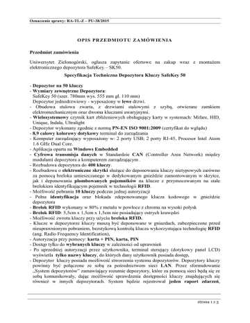 Oznaczenie sprawy: RA-TL-Z – PU-38/2015 OPIS PRZEDMIOTU ZAMÓWIENIA Przedmiot zamówienia Uniwersytet Zielonogórski, ogłasza zapytanie ofertowe na zakup wraz z montażem elektronicznego depozytora SafeKey – SK50. Specyfikacja Techniczna Depozytora Kluczy SafeKey 50 - Depozytor na 50 kluczy - Wymiary zewnętrzne Depozytora: SafeKey 50 (szer. 780mm wys. 555 mm gł. 110 mm) Depozytor jednodrzwiowy - wyposażony w lewe drzwi. - Obudowa stalowa zwarta, z drzwiami stalowymi z szybą, otwierane zamkiem elektromechanicznym oraz dwoma kluczami awaryjnymi. - Wielosystemowy czytnik kart zbliżeniowych obsługujący karty w systemach: Mifare, HID, Unique, Indala, Ultralight - Depozytor wykonany zgodnie z normą PN-EN ISO 9001:2009 (certyfikat do wglądu) - 8,9 calowy kolorowy dotykowy terminal do zarządzania - Komputer zarządzający wyposażony w: 2 porty USB; 2 porty RJ-45, Procesor Intel Atom 1.6 GHz Dual Core. - Aplikacja oparta na Windows Embedded - Cyfrowa transmisja danych w Standardzie CAN (Controller Area Network) między modułami depozytora a komputerem zarządzającym . - Rozbudowa depozytora do 400 kluczy. - Rozbudowa o elektroniczne skrytki służące do deponowania kluczy nietypowych zarówno za pomocą breloka umieszczanego w dedykowanym gnieździe zamontowanym w skrytce, jak i deponowania plombowanych pojemników na klucze z przymocowanym na stałe brelokiem identyfikującym pojemnik w technologii RFID. - Możliwość pobrania 10 kluczy podczas jednej autoryzacji - Pełna identyfikacja oraz blokada zdeponowanego klucza kodowego w gnieździe depozytora - Brelok RFID wykonany w 80% z metalu w powłoce z chromu na wysoki połysk - Brelok RFID: 5,5cm x 1,5cm x 1,5cm nie posiadający ostrych krawędzi - Możliwość zwrotu kluczy przy użyciu breloka RFID. - Klucze w depozytorze kluczy muszą być deponowane w gniazdach, zabezpieczone przed nieuprawnionym pobraniem, bezstykową kontrolą klucza wykorzystująca technologię RFID (ang. Radio Frequency Identification), - Autoryzacja przy pomocy: karta + PIN, karta, PIN - Dostęp tylko do wybranych kluczy w zależności od uprawnień - Po uprzedniej autoryzacji przez użytkownika, terminal sterujący (dotykowy panel LCD) wyświetla tylko nazwy kluczy, do których dany użytkownik posiada dostęp, - Depozytor kluczy posiada możliwość stworzenia systemu depozytorów. Depozytory kluczy powinny być połączone ze sobą za pośrednictwem sieci LAN. Przez sformułowanie „System depozytorów” zamawiający rozumie depozytory, które za pomocą sieci będą się ze sobą komunikowały, dając możliwość sprawdzenia dostępności kluczy znajdujących się również w innych depozytorach. System będzie rejestrował jeden raport zdarzeń, strona 1 z 3 Oznaczenie sprawy: RA-TL-Z – PU-38/2015 z możliwością kontroli za pośrednictwem któregokolwiek depozytora. Umożliwiać deponowanie kluczy pobranych z innego depozytora, a zwróconych do innego. - możliwość nadawania dowolnych, wielopoziomowych uprawnień dostępu do funkcji depozytora zarówno z poziomu dotykowego terminala LCD umieszczonego w depozytorze jak również z poziomu aplikacji webowej (Tylko podgląd zdarzeń, tylko nadawanie uprawnień do kluczy, tworzenie okien czasowych, zarządzanie ściśle określoną ilością kluczy/użytkowników itp.) - przydzielanie uprawnień do kluczy pozwalające użytkownikowi/grupie na pobranie przypisanych kluczy, w określonym czasie (zapewniając minimum 20 różnych okien czasowych) - rezerwacja kluczy - Kontrola włożenia klucza do pierwszego wolnego gniazda (funkcja dowolnego zwrotu klucza w dowolne gniazdo) lub konkretnie wskazanego i podświetlonego. Zapewniając system mieszany. - Klucze przyczepione do breloka RFID za pomocą stalowej kłódki z indywidualnym numerem seryjnym i kodem kreskowym. - Oprogramowanie w języku polskim - W przypadku braku zasilania możliwość mechanicznego otwarcia depozytora oraz zwolnienia kluczy - Wbudowany w oferowane depozytory system zasilania awaryjnego, zapewniający prawidłową pracę urządzeń w przypadku zaniku zasilania podstawowego. - Zapewnia możliwość pracy urządzenia na otwartych drzwiach bez konieczności ich zamykania. - zapewnia możliwość importu i eksportu danych (Imię, Nazwisko, numer karty itp.) - zapewnia gromadzenie (archiwizowanie) wszystkich zdarzeń związanych z działaniem depozytorów, - Tworzenie kopii bazy danych zapisywanych na zewnętrznym pendrive USB - Filtrowanie zgromadzonych w systemie informacji według: użytkownika, breloka(klucza), zdarzenia. - Depozytor jest urządzeniem autonomicznym. Własna baza danych, serwer www oraz inne niezbędne oprogramowanie, które zapewnia zachowanie pełnej funkcjonalności i poprawności pracy depozytora zaimplementowane w depozytorze. - Kolor depozytora - stalowoszary RAL 9007 strona 2 z 3 Oznaczenie sprawy: RA-TL-Z – PU-38/2015 Termin realizacji: 21 dni od daty zawarcia umowy. strona 3 z 3