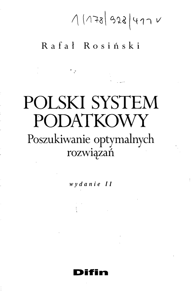 Rafał R o s i ń s k i POLSKI SYSTEM PODATKOWY Poszukiwanie optymalnych rozwiązań wydanie II Spis treści Wykaz skrótów 9 Przedmowa 11 Rozdział 1. Teoretyczne przesłanki budowy stabilnego systemu podatkowego 15 1.1. 1.2. 1.3. 1.4. Elementy konstrukcji podatków Klasyfikacja podatków Zjawisko przerzucania podatków Rola systemu podatkowego w gospodarce 1.4.1. Pojęcie i struktura systemu podatkowego 1.4.2. Bariery zmian systemu podatkowego 1.4.3. Klasyczne zasady podatkowe 1.4.4. Cechy współczesnego systemu podatkowego 1.5. Aspekty makro i mikroekonomiczne w opodatkowaniu 1.5.1. Wpływ opodatkowania na gospodarkę 1.5.2. Podatki a efektywność ekonomiczna 1.5.3. Opodatkowanie optymalne i efektywne 1.5.4. Oddziaływanie opodatkowania na przedsiębiorstwa 18 25 29 32 32 34 37 41 45 45 48 51 53 Rozdział 2. Opodatkowanie przedsiębiorstw w Polsce i w innych krajach Unii Europejskiej 55 2.1. Ogólna charakterystyka polskiego systemu podatkowego 2.2. Opodatkowanie bezpośrednie 2.2.1. Podatek dochodowy od osób fizycznych 2.2.2. Podatek dochodowy od osób prawnych 55 61 61 69 Polski system podatkowy 2.2.3. Analiza podatków PIT i CIT w Polsce i w krajach Unii Europejskiej 2.2.4. Wpływ opodatkowania bezpośredniego na funkcjonowanie przedsiębiorstw 2.3. Opodatkowanie pośrednie 2.3.1. Podatek od towarów i usług 2.3.2. Podatek akcyzowy, podatek od gier 2.3.3. Analiza podatku VAT w Polsce i w krajach v Unii Europejskiej . . . ...^ 2.3.4. Wpływ podatku VAT na funkcjonowanie przedsiębiorstw 2.4. Pozostałe obciążenia przedsiębiorstw 2.4.1. Podatki majątkowe 2.4.2. Podatek od czynności cywilnoprawnych 2.4.3. Opodatkowanie działalności rolniczej 2.4.4. Ubezpieczenia społeczne i klin podatkowy 2.4.5. Wnioski 2.5. Harmonizacja systemów podatkowych w Unii Europejskiej 91 94 95 95 98 100 103 109 110 Rozdział 3. Wpływ instrumentów podatkowych na decyzje przedsiębiorstw 113 3.1. 3.2. 3.3. 3.4. 3.5. Elementy kształtujące podstawę opodatkowania Stawki podatkowe Preferencje podatkowe Formy opodatkowania a decyzje gospodarcze przedsiębiorstw Zobowiązanie podatkowe - metoda kasowa a metoda memoriałowa 73 79 80 80 88 113 117 120 122 124 Rozdział 4. Wytyczne w konstrukcji optymalnego systemu podatkowego dla gospodarki polskiej 4.1. Warunki stabilności systemu podatkowego 4.2. Prawo bilansowe punktem wyjścia w konstrukcji systemu podatkowego 4.3. Benchmarking systemu podatkowego 4.4. Aspekt konkurencyjności przedsiębiorstw w opodatkowaniu 128 128 134 140 147 Spis treści Rozdział 5. Propozycje podatkowe ośrodków badawczych i koncepcja własna opodatkowania przedsiębiorstw 5.1. Strategia podatkowa Ministerstwa Finansów 5.2. Koncepcje podatkowe Centrum im. Adama Smitha 7 163 163 166 5.3. Propozycje podatkowe Centrum Analiz Społeczno-Ekonomicznych ». 5.4. Propozycje podatkowe przedsiębiorców 169 172 5.5. Propozycje podatkowe międzynarodowych firm doradczych 5.6. Koncepcja własna opodatkowania działalności gospodarczej 175 178 Wnioski końcowe 185 Bibliografia 189 Materiały źródłowe 189 Literatura 192 Pozostałe źródła 195 Spis rysunków 197 Spis tabel 199