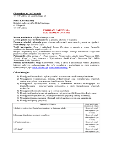 Gimnazjum nr 2 w Ustroniu 43-450 Ustroń, ul. Daszyńskiego 31 Punkt Katechetyczny Kościoła Adwentystów Dnia Siódmego ul. Długa 49 43-450 Ustroń PROGRAM NAUCZANIA ROK SZKOLNY 2015/2016 Nazwa przedmiotu: religia adwentystyczna Liczba godzin zajęć dydaktycznych: 2 godziny lekcyjne w tygodniu Forma oceniania i zaliczenia: prace pisemne, odpowiedzi ustne oraz aktywność na zajęciach Prowadzący: mgr Edward Gajda Treść kształcenia: Życie i działalność Jezusa Chrystusa w oparciu o cztery Ewangelie w odniesieniu do czasów współczesnych, c.d. Biblijne drogowskazy życia, przedstawione na kartach Starego i Nowego Testamentu – wytyczone przez Pana Jezusa Chrystusa oraz Proroków i Apostołów. Podręczniki: „Bóg jest jak…” – Praca zbiorowa – Wydawnictwo „Znaki Czasu”,Warszawa 2013; „Zasady Wiary” – Praca zbiorowa – Wydawnictwo „Znaki Czasu”, Warszawa 2007; Biblia Warszawska; Biblia Tysiąclecia. Pomoce dydaktyczne: Mapy historyczne; Filmy o życiu i działalności Jezusa Chrystusa; Internet: odkrycia archeologiczne dot. w/w zagadnień – pochodzące ze stron naukowodydaktycznych, np.: www.nadzieja.pl, www.hopehanel.org, itp. Cele edukacyjne: 1) Umiejętność rozumienia, wykorzystania i przetwarzania analizowanych tekstów. 2) Umiejętność wykorzystania pomocy dydaktycznych oraz formułowania własnych sądów opartych na rozumowaniu i analizowaniu faktów. 3) Umiejętność wykorzystania wiedzy o charakterze naukowo-edukacyjnym do identyfikowania i rozwiązywania problemów, a także formułowania własnych wniosków. 4) Umiejętność komunikowania się w języku ojczystym. 5) Umiejętność posługiwania się podstawowymi pojęciami biblijnymi i teologicznymi. 6) Umiejętność wyszukiwania, selekcjonowania i krytycznej analizy informacji. 7) Umiejętność rozpoznawania własnych potrzeb edukacyjnych oraz uczenia się. 8) Umiejętność pracy grupowej. TREŚCI NAUCZANIA 1. Lekcja organizacyjna. Zasady bezpieczeństwa w drodze do szkoły. 2. Przyroda objawieniem stwórczej mocy Boga. 3.Wniebowstąpienie… 4. Co dalej? PROPONOWANY PRZEDZIAŁ CZASU Do dwóch zajęć edukacyjnych (po 45 min) Do dwóch zajęć edukacyjnych (po 45 min) Do dwóch zajęć edukacyjnych (po 45 min) Do dwóch zajęć edukacyjnych (po 5. Jakimi ludźmi są chrześcijanie? 6. Jedność Kościoła 7. Żyjąc na polu walki. 8. Co za niesamowity Bóg. 9. Ojciec, Syn i Duch Święty. 10. Wielki Wybuch, czy Wielki Bóg. 11. Syn Boży i Syn Człowieczy. 12. Budowanie ciała Chrystusowego. 13. Woda, chleb i wino. 14. Dary dla ciebie. 15. Domownicy wiary. 16. Zasady wolności. 17. Zycie i dawanie. 18. Ciąg dalszy nastąpi. 19. Gdy koniec jest początkiem. 45 min) Do dwóch zajęć edukacyjnych (po 45 min) Do dwóch zajęć edukacyjnych (po 45 min) Do dwóch zajęć edukacyjnych (po 45 min) Do dwóch zajęć edukacyjnych (po 45 min) Do dwóch zajęć edukacyjnych (po 45 min) Do dwóch zajęć edukacyjnych (po 45 min) Do dwóch zajęć edukacyjnych (po 45 min) Do dwóch zajęć edukacyjnych (po 45 min) Do dwóch zajęć edukacyjnych (po 45 min) Do dwóch zajęć edukacyjnych (po 45 min) Do dwóch zajęć edukacyjnych (po 45 min) Do dwóch zajęć edukacyjnych (po 45 min) Do dwóch zajęć edukacyjnych (po 45 min) Do dwóch zajęć edukacyjnych (po 45 min) Do dwóch zajęć edukacyjnych (po 45 min) Osiągnięcia: 1. Rozumienie oraz możliwość zastosowania biblijnych nauk rozwiązywaniu szkolnych i pozaszkolnych problemów ucznia. 2. Korzystanie z różnych źródeł informacji dotyczących biblijnych zagadnień dostępnych przy pomocy komputera. 3. Dostrzeganie korzyści wynikających ze znajomości różnych orientacji religijnych i prezentowanie postawy tolerancji wobec inaczej wierzących. 4. Praktyczna umiejętność wykorzystania prawd Pisma Świętego w codziennym życiu. Program edukacyjny opracował: mgr Edward Gajda