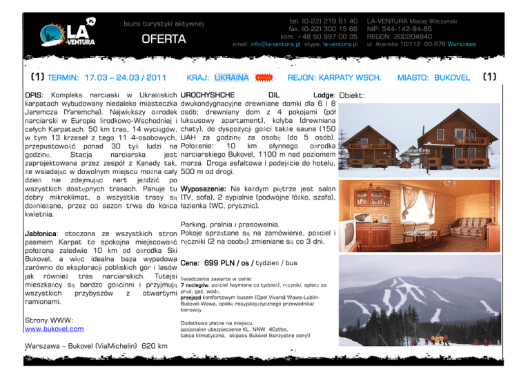 tel. (0-22) 219 61 40 fax. (0-22) 300 15 66 kom. +48 50 997 00 35 biuro turystyki aktywnej OFERTA (1) TERMIN: 17.03 – 24.03 / 2011 OPIS: Kompleks narciaski w Ukraińskich karpatach wybudowany niedaleko miasteczka Jaremcza (Yaremcha). Największy ośrodek narciarski w Europie Środkowo-Wschodniej i całych Karpatach. 50 km tras, 14 wyciągów, w tym 13 krzeseł z tego 11 4-osobowych, przepustowość ponad 30 tyś ludzi na godzinę. Stacja narciarska jest zaprojektowana przez zespół z Kanady tak, że wsiadając w dowolnym miejscu można cały dzień nie zdejmując nart jeździć po wszystkich dostępnych trasach. Panuje tu dobry mikroklimat, a wszystkie trasy są dośnieżane, przez co sezon trwa do końca kwietnia. email: [email protected] skype: la-ventura.pl KRAJ: UKRAINA UROCHYSHCHE DIL Lodge: Obiekt: dwukondygnacyjne drewniane domki dla 6 i 8 osób; drewniany dom z 4 pokojami (pół luksusowy apartament), kolyba (drewniana chaty), do dyspozycji gości także sauna (150 UAH za godzinę za osobę (do 5 osób). Położenie: 10 km słynnego ośrodka narciarskiego Bukovel, 1100 m nad poziomem morza. Droga asfaltowa i podejście do hotelu, 500 m od drogi. Wyposazenie: Na każdym piętrze jest salon (TV, sofa), 2 sypialnie (podwójne łóżko, szafa), łazienka (WC, prysznic). kierowcy Warszawa – Bukovel (ViaMichelin) 620 km ul. Atenska 10/112 03-978 Warszawa REJON: KARPATY WSCH. Parking, pralnia i prasowalnia. Jabłonica: otoczona ze wszystkich stron Pokoje sprzątane są na zamówienie, pościel i pasmem Karpat to spokojna miejscowość ręczniki (2 na osobę) zmieniane są co 3 dni. położona zaledwie 10 km od ośrodka Ski Bukovel, a więc idealna baza wypadowa Cena: 699 PLN / os / tydzień / bus zarówno do eksploracji pobliskich gór i lasów jak również tras narciarskich. Tutejsi Świadczenia zawarte w cenie: mieszkańcy są bardzo gościnni i przyjmują 7 noclegów, pościel (wymiana co tydzień), ręczniki, opłatę za wszystkich przybyszów z otwartymi prąd, gaz, wodę, przejazd komfortowym busem (Opel Vivaro) Wawa-Lublinramionami. Bukovel-Wawa, opiekę rosyjskojęzycznego przewodnika/ Strony WWW: www.bukovel.com LA-VENTURA Maciej Wilczynski NIP: 544-142-94-85 REGON: 200304840 Dodatkowo płatne na miejscu: opcjonalne ubezpieczenie KL, NNW 40zł/os, taksa klimatyczna, skipass Bukovel (korzystne ceny!) MIASTO: BUKOVEL (1) czarne: 6 km czerwone: 30 km niebieskie: 14 km Razem: 50 km