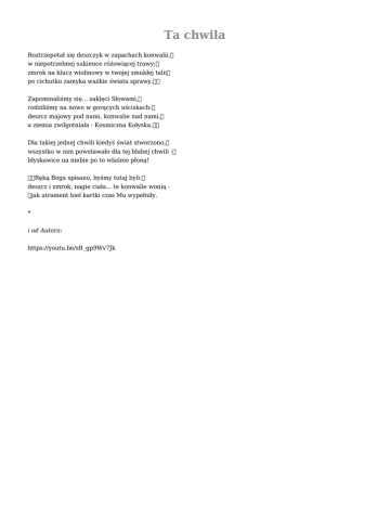 Ta chwila Roztrzepotał się deszczyk w zapachach konwalii, w niepotrzebnej sukience różowiącej trawy; zmrok na klucz wiolinowy w twojej smukłej talii po cichutku zamyka ważkie świata sprawy. Zapominaliśmy się... zaklęci Słowami, rodziliśmy na nowo w gorących uściskach: deszcz majowy pod nami, konwalie nad nami, a ziemia zwilgotniała - Kosmiczna Kołyska. Dla takiej jednej chwili kiedyś świat stworzono, wszystko w nim powstawało dla tej błahej chwili - błyskawice na niebie po to właśnie płoną! Ręką Boga spisano, byśmy tutaj byli: deszcz i zmrok, nagie ciała... te konwalie wonią jak atrament biel kartki czas Mu wypełniły. * i od Autora: https://youtu.be/sB_gp9Wv7Jk
