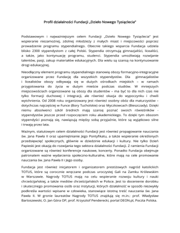 Profil działalności Fundacji „Dzieło Nowego Tysiąclecia” Podstawowym i najważniejszym celem Fundacji „Dzieło Nowego Tysiąclecia” jest wspieranie niezamożnej, zdolnej młodzieży z małych miast i miejscowości poprzez prowadzenie programu stypendialnego. Obecnie takiego wsparcia Fundacja udziela blisko 2300 stypendystom z całej Polski. Stypendia otrzymują gimnazjaliści, licealiści, a także, jako kontynuację programu, studenci. Stypendia umożliwiają rozwijanie talentów, pasji, zakup materiałów edukacyjnych. Dla wielu są szansą na kontynuowanie drogi edukacyjnej. Nieodłączny element programu stypendialnego stanowią obozy formacyjno-integracyjne organizowane przez Fundację dla wszystkich stypendystów. Dla gimnazjalistów i licealistów obozy odbywają się w dużych ośrodkach miejskich – w ramach przygotowania do życia w dużym mieście podczas studiów. W mniejszych miejscowościach organizowane są obozy dla studentów – ma być to dla nich czas nie tylko formacji duchowej i integracji, ale również okazja do wypoczynku i chwili wytchnienia. Od 2008 roku organizowany jest również osobny obóz dla maturzystów – dotychczas najczęściej w Funce (Bory Tucholskie) oraz Myczkowcach (Bieszczady). Dzięki niemu absolwenci szkół średnich mają szansę poznać swoich rówieśników stypendystów jeszcze przed rozpoczęciem roku akademickiego. To dzięki tym obozom stypendyści poznają się, nawiązują między sobą przyjaźnie, które są wyjątkowo silne i trwają przez lata. Ważnym, statutowym celem działalności Fundacji jest również propagowanie nauczania św. Jana Pawła II oraz upamiętnianie Jego Pontyfikatu, a także wspieranie określonych przedsięwzięć społecznych, głównie w dziedzinie edukacji i kultury. Nie tylko Dzień Papieski jest okazją do rozwijania tego sektora działalności Fundacji. Z ramienia Fundacji organizowane są również konferencje naukowe, koncerty. Ponadto Fundacja obejmuje patronatem ważne wydarzenia społeczno-kulturalne, które mają na cele promowanie nauczania św. Jana Pawła II i Jego osoby. Fundacja jest również inicjatorem i organizatorem prestiżowych nagród katolickich TOTUS, które są corocznie wręczane podczas uroczystej Gali na Zamku Królewskim w Warszawie. Nagrody TOTUS mają na celu wspieranie rozwoju kultury i nauki chrześcijańskiej, a także mediów chrześcijańskich w Polsce. Jest to docenienie dorobku i skutecznego promowania osób oraz instytucji, których działalność w sposób niezwykły podkreśla wartości wpisane w człowieka, stanowiące istotną treść nauczania św. Jana Pawła II. W gronie laureatów Nagrody TOTUS znajdują się m.in.: prof. Władysław Bartoszewski, O. Jan Góra OP, prof. Krzysztof Penderecki, portal DEON.pl, Poczta Polska. Od szesnastu lat Fundacja we współpracy z Ogólnopolskim Komitetem Organizacyjnym organizuje znany w całej Polsce i poza jej granicami Dzień Papieski. Obchodom towarzyszą koncerty, atrakcje w największych miastach kraju, konferencje naukowe, a także zbiórka kościelna i publiczna na fundusz stypendialny Fundacji. Fundacja wspiera również inicjatywy naukowe. Wielokrotnie była organizatorem lub współorganizatorem sympozjów, konferencji naukowych, a także konkursów akademickich. Tym samym promowane są wartości chrześcijańskie, a także nauczanie św. Jana Pawła II. Jedną z takich inicjatyw była ogólnopolska konferencja naukowa „Wielkość czy autorytet? Jan Paweł II w przekazach polskich mediów podczas Jego kanonizacji”, która odbyła się w październiku 2015 roku. Była to kontynuacja sesji z 2007 roku: „Odchodzenie Jana Pawła II do Domu Ojca w polskich mediach”. Owocem obu konferencji są obszerne publikacje, zawierające wystąpienia wszystkich prelegentów oraz wyniki prowadzonych przez nich badań. Działalność Fundacji nie byłaby możliwa, gdyby nie wsparcie i współpraca z wieloma zaprzyjaźnionymi instytucjami. Dzięki ich przychylności Fundacja ma możliwość prowadzenia programu praktyk i wolontariatu dla stypendystów w wielu prestiżowych ośrodkach, co znacznie wpływa na ich rozwój i dalszą drogę zawodową.