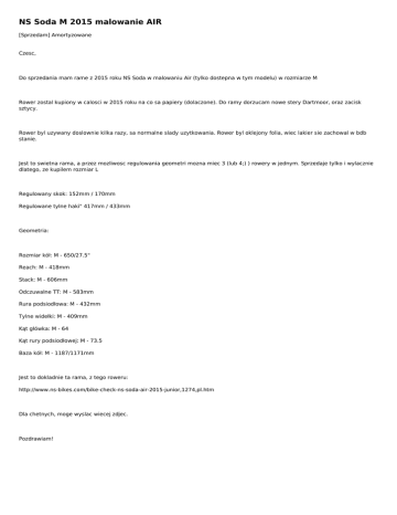 NS Soda M 2015 malowanie AIR [Sprzedam] Amortyzowane Czesc, Do sprzedania mam rame z 2015 roku NS Soda w malowaniu Air (tylko dostepna w tym modelu) w rozmiarze M Rower zostal kupiony w calosci w 2015 roku na co sa papiery (dolaczone). Do ramy dorzucam nowe stery Dartmoor, oraz zacisk sztycy. Rower byl uzywany doslownie kilka razy, sa normalne slady uzytkowania. Rower byl oklejony folia, wiec lakier sie zachowal w bdb stanie. Jest to swietna rama, a przez mozliwosc regulowania geometri mozna miec 3 (lub 4;) ) rowery w jednym. Sprzedaje tylko i wylacznie dlatego, ze kupilem rozmiar L Regulowany skok: 152mm / 170mm Regulowane tylne haki" 417mm / 433mm Geometria: Rozmiar kół: M - 650/27.5" Reach: M - 418mm Stack: M - 606mm Odczuwalne TT: M - 583mm Rura podsiodłowa: M - 432mm Tylne widełki: M - 409mm Kąt główka: M - 64 Kąt rury podsiodłowej: M - 73.5 Baza kół: M - 1187/1171mm Jest to dokladnie ta rama, z tego roweru: http://www.ns-bikes.com/bike-check-ns-soda-air-2015-junior,1274,pl.htm Dla chetnych, moge wyslac wiecej zdjec. Pozdrawiam! Informacje dodatkowe Stan Używany Oferta prywatna/sklepu Oferta prywatna Materiał wykonania Aluminium Rozmiar sterów (cale) tapered Adres ogłoszenia http://rowerowybazar.com.pl/ns-soda-m-2015-malowanie-air,o3841 Kontakt Mail: [email protected] Telefon: +48784299426 Lokalizacja Kluczborska , Krakow Małopolskie (Polska) Ogłoszenie dodano: 2016-04-24 00:57:07 Ogłoszenie wygasa: 2017-04-23 00:57:07 Powered by TCPDF (www.tcpdf.org)