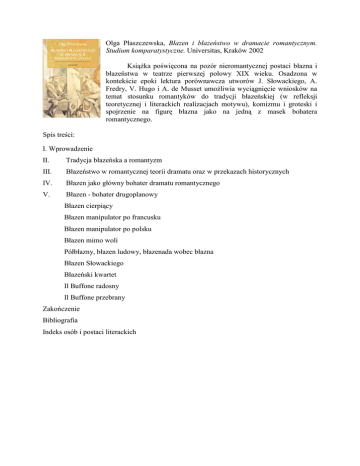 Olga Płaszczewska, Błazen i błazeństwo w dramacie romantycznym. Studium komparatystyczne. Universitas, Kraków 2002 KsiąŜka poświęcona na pozór nieromantycznej postaci błazna i błazeństwa w teatrze pierwszej połowy XIX wieku. Osadzona w kontekście epoki lektura porównawcza utworów J. Słowackiego, A. Fredry, V. Hugo i A. de Musset umoŜliwia wyciągnięcie wniosków na temat stosunku romantyków do tradycji błazeńskiej (w refleksji teoretycznej i literackich realizacjach motywu), komizmu i groteski i spojrzenie na figurę błazna jako na jedną z masek bohatera romantycznego. Spis treści: I. Wprowadzenie II. Tradycja błazeńska a romantyzm III. Błazeństwo w romantycznej teorii dramatu oraz w przekazach historycznych IV. Błazen jako główny bohater dramatu romantycznego V. Błazen - bohater drugoplanowy Błazen cierpiący Błazen manipulator po francusku Błazen manipulator po polsku Błazen mimo woli Półbłazny, błazen ludowy, błazenada wobec błazna Błazen Słowackiego Błazeński kwartet Il Buffone radosny Il Buffone przebrany Zakończenie Bibliografia Indeks osób i postaci literackich
