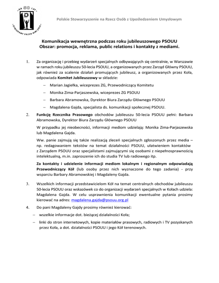 Polskie Stowarzyszenie na Rzecz Osób z Upośledzeniem Umysłowym Komunikacja wewnętrzna podczas roku jubileuszowego PSOUU Obszar: promocja, reklama, public relations i kontakty z mediami. 1. Za organizację i przebieg wydarzeń specjalnych odbywających się centralnie, w Warszawie w ramach roku jubileuszu 50-lecia PSOUU, a organizowanych przez Zarząd Główny PSOUU, jak również za scalenie działań promujących jubileusz, a organizowanych przez Koła, odpowiada Komitet Jubileuszowy w składzie: − Marian Jagiełka, wiceprezes ZG, Przewodniczący Komitetu − Monika Zima-Parjaszewska, wiceprezes ZG PSOUU − Barbara Abramowska, Dyrektor Biura Zarządu Głównego PSOUU − Magdalena Gajda, specjalista ds. komunikacji społecznej PSOUU. 2. Funkcję Rzecznika Prasowego obchodów jubileuszu 50-lecia PSOUU pełni: Barbara Abramowska, Dyrektor Biura Zarządu Głównego PSOUU W przypadku jej nieobecności, informacji mediom udzielają: Monika Zima-Parjaszewska lub Magdalena Gajda. Ww. panie zajmują się także realizacją zleceń specjalnych zgłoszonych przez media – np. redagowaniem tekstów na temat działalności PSOUU, ułatwieniem kontaktów z Zarządem PSOUU oraz specjalistami zajmującymi się osobami z niepełnosprawnością intelektualną, m.in. zaproszenie ich do studia TV lub radiowego itp. Za kontakty i udzielenie informacji mediom lokalnym i regionalnym odpowiadają Przewodniczący Kół (lub osoby przez nich wyznaczone do tego zadania) - przy wsparciu Barbary Abramowskiej i Magdaleny Gajda. 3. Wszelkich informacji przedstawicielom Kół na temat centralnych obchodów jubileuszu 50-lecia PSOUU oraz wskazówek co do organizacji wydarzeń specjalnych w Kołach udziela: Magdalena Gajda. W celu usprawnienia komunikacji ewentualne pytania prosimy kierować na adres: [email protected] 4. Do pani Magdaleny Gajdy prosimy również kierować: − wszelkie informacje dot. bieżącej działalności Koła; − linki do stron internetowych, kopie materiałów prasowych, radiowych i TV pozyskanych przez Koła, a dot. działalności PSOUU i jego Kół terenowych.