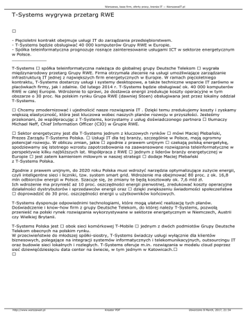 Warszawa, baza firm, oferty pracy, branża IT :: WarszawaIT.pl T-Systems wygrywa przetarg RWE - Pięcioletni kontrakt obejmuje usługi IT do zarządzania przedsiębiorstwem. - T-Systems będzie obsługiwać 40 000 komputerów Grupy RWE w Europie. - Spółka teleinformatyczna prognozuje rosnące zainteresowanie usługami ICT w sektorze energetycznym w Polsce. _____________ T-Systems spółka teleinformatyczna należąca do globalnej grupy Deutsche Telekom wygrała międzynarodowy przetarg Grupy RWE. Firma otrzymała zlecenie na usługi umożliwiające zarządzanie infrastrukturą IT jednej z największych firm energetycznych w Europie. W ramach pięcioletniego kontraktu, T-Systems dostarczy usługi i systemy desktopowe, a także techniczne wsparcie IT zarówno w placówkach firmy, jak i zdalnie. Od lutego 2014 r. T-Systems będzie obsługiwać ok. 40 000 komputerów RWE w całej Europie. Wdrożenie to sprawi, że dostawca energii zredukuje koszty operacyjne w tym obszarze o 30 proc. Na polskim rynku Grupa RWE (dawniej Stoen) obsługiwana jest przez lokalny oddział T-Systems. Chcemy zmodernizować i ujednolicić nasze rozwiązania IT . Dzięki temu zredukujemy koszty i zyskamy większą elastyczność, która jest kluczowa wobec naszych planów rozwoju w przyszłości. Jesteśmy przekonani, że współpracując z T-Systems, korzystamy z usług doświadczonego partnera tłumaczy Michael Neff, Chief Information Officer (CIO) w Grupie RWE. Sektor energetyczny jest dla T-Systems jednym z kluczowych rynków mówi Maciej Plebański, Prezes Zarządu T-Systems Polska. Usługi IT dla tej branży, szczególnie w Polsce, mają ogromny potencjał rozwoju. W obliczu zmian, jakie zgodnie z prawem unijnym czekają polską energetykę, spodziewamy się istotnego wzrostu zapotrzebowania na zaawansowane rozwiązania teleinformatyczne w perspektywie kilku najbliższych lat. Współpraca z RWE jednym z liderów branży energetycznej w Europie jest zatem kamieniem milowym w naszej strategii dodaje Maciej Plebański z T-Systems Polska. Zgodnie z prawem unijnym, do 2020 roku Polska musi wdrożyć narzędzia optymalizujące zużycie energii, czyli inteligentne sieci i liczniki, tzw. system smart grid. Wdrożenie ma obejmować 80 proc. z ok. 16,8 mln odbiorców energii w Polsce. Szacuje się, że zmiany te będą kosztowały ok. 7,6 mld zł. Ich wdrożenie ma przynieść aż 10 proc. oszczędności energii pierwotnej, zredukować koszty operacyjne działalności dystrybutorów i sprzedawców energii oraz dzięki zwiększeniu świadomości społeczeństwa doprowadzić do 30 proc. oszczędności energii u użytkowników końcowych. T-Systems dysponuje odpowiednimi technologiami, które mogą ułatwić realizację tych planów. Doświadczenie i know-how firm z grupy Deutsche Telekom, do której należy T-Systems, pozwolą przenieść na polski rynek rozwiązania wykorzystywane w sektorze energetycznym w Niemczech, Austrii czy Wielkiej Brytanii. T-Systems Polska jest obok sieci komórkowej T-Mobile jednym z dwóch podmiotów Grupy Deutsche Telekom obecnych na polskim rynku. W przeciwieństwie do młodszej spółki-siostry, T-Systems świadczy usługi wyłącznie dla klientów biznesowych, polegające na integracji systemów informatycznych i telekomunikacyjnych, outsourcingu IT oraz budowie sieci lokalnych i rozległych. T-Systems oferuje m.in. rozwiązania w modelu cloud poprzez sieć dziewięćdziesięciu data center na świecie, w tym jednym w Katowicach. http://www.warszawait.pl Kreator PDF Utworzono 8 March, 2017, 21:34