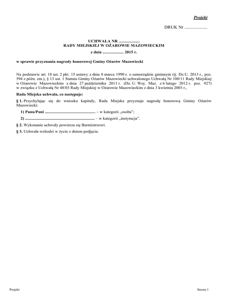 Projekt DRUK Nr .................... UCHWAŁA NR .................... RADY MIEJSKIEJ W OŻAROWIE MAZOWIECKIM z dnia .................... 2015 r. w sprawie przyznania nagrody honorowej Gminy Ożarów Mazowiecki Na podstawie art. 18 ust. 2 pkt. 15 ustawy z dnia 8 marca 1990 r. o samorządzie gminnym (tj. Dz.U. 2013 r., poz. 594 z późn. zm.), § 13 ust. 1 Statutu Gminy Ożarów Mazowiecki uchwalonego Uchwałą Nr 100/11 Rady Miejskiej w Ożarowie Mazowieckim z dnia 27 października 2011 r. (Dz. U. Woj. Maz. z 6 lutego 2012 r. poz. 927) w związku z Uchwałą Nr 48/03 Rady Miejskiej w Ożarowie Mazowieckim z dnia 3 kwietnia 2003 r., Rada Miejska uchwala, co następuje: § 1. Przychylając się do wniosku kapituły, Rada Miejska przyznaje nagrodę honorową Gminy Ożarów Mazowiecki: 1) Panu/Pani ................................................ – w kategorii „osoba”; 2) .................................................................. – w kategorii „instytucja”. § 2. Wykonanie uchwały powierza się Burmistrzowi. § 3. Uchwała wchodzi w życie z dniem podjęcia. Projekt Strona 1 UZASADNIENIE Rada Miejska w Ożarowie Mazowieckim, Uchwałą Nr 48/03 z dnia 3 kwietnia 2003 roku ustanowiła nagrodę honorową przyznawaną osobom i instytucjom zasłużonym dla rozwoju Gminy. Zgodnie z przyjętym Regulaminem prawo zgłaszania kandydatur do nagrody honorowej przysługuje: Burmistrzowi, Przewodniczącemu Rady Miejskiej, grupie 5 radnych Rady Miejskiej oraz grupie 50 mieszkańców. Kandydatury należy zgłaszać w terminie do 1 maja każdego roku. Zgłoszenia te podlegają ocenie Kapituły, która w głosowaniu tajnym dokonuje wyboru kandydatów i wnioskuje do Rady Miejskiej o przyznanie nagrody. W 2015 roku do kancelarii Urzędu Miejskiego wpłynęło 5 wniosków o przyznanie nagrody, w tym 4 zgłoszenia w kategorii „osoba” i jedno zgłoszenie w kategorii „instytucja”. Nominowani do nagrody zostali: Pan Jan Kępczyński – wniosek zgłoszony przez grupę 80 mieszkańców Gminy Ożarów Mazowiecki. Pan Jan Kępczyński jest wieloletnim i zasłużonym organizatorem i propagatorem sportu amatorskiego. Jako nauczyciel wychowania fizycznego z sukcesem krzewił sport wśród młodzieży szkolnej. Obecnie jako słuchacz Ożarowskiego Uniwersytetu Trzeciego Wieku z pasją i zaangażowaniem uczestniczy w zawodach sportowych w kategorii seniorów. Szczególne zainteresowania kieruje ku sportom zimowym oraz biegom, w tym również długodystansowym. W ostatnich latach zdobył około 250 dyplomów, medali, pucharów i innych nagród, rozsławiając równocześnie Gminę Ożarów Mazowiecki na imprezach sportowych. (wyciąg z uzasadnienia) Pani Henryka Radomska – wniosek nie wypełnia wymogów formalnych. Spośród 50 osób popierających kandydaturę, wyłącznie 28 jest mieszkańcami Gminy Ożarów Mazowiecki. Pani Agnieszka Przybyszewska - wniosek zgłoszony przez grupę 51 mieszkańców Gminy Ożarów Mazowiecki Pani Agnieszka Przybyszewska jest animatorką kultury, inicjatorką lokalnych wydarzeń kulturalnych, pomysłodawczynią i główną organizatorką Orszaku Trzech Króli – widowiska plenerowego, które od trzech lat zapisuje się w kalendarzu ożarowskich uroczystości. W ostatnim czasie Pani Agnieszka podjęła się również przedstawienia Misterium Męki Pańskiej. Ponadto p. Przybyszewska jest również wolontariuszką prowadzącą Poradnię Rodzinną przy Parafii Miłosierdzia Bożego oraz Redaktorem naczelnym Miesięcznika Misericordia. (wyciąg z uzasadnienia) Ks. Stanisław Drajczyk - wniosek zgłoszony przez grupę 129 mieszkańców Gminy Ożarów Mazowiecki Ks. Stanisław Drajczyk w 1986 r. został proboszczem parafii Rokitno. W tym samym roku rozpoczął budowę kościoła w Płochocinie. Był również aktywnym członkiem Społecznego Komitetu Budowy Szkoły w Józefowie. W 1990 r. Ksiądz adaptował kaplicę i sale katechetyczne dla potrzeb sal lekcyjnych Szkoły Podstawowej w Józefowie. W 1994 r. dzieci rozpoczęły naukę w Szkole Podstawowej w Płochocinie. Obecnie Ksiądz jest Rezydentem DPS w Pilaszkowie. Nadal jest człowiekiem o wielkim sercu i społecznej duszy. Lubi dowcipkować, co zjednuje mu uśmiech i serce. (wyciąg z uzasadnienia) Koło Gospodyń Wiejskich w Święcicach – wniosek złożony przez Burmistrza Ożarowa Mazowieckiego 50 lat temu jesienią 1964 r. ówczesna agronom Pani Ewa Ulanowska pod kierunkiem Inspektora Kół Gospodyń Wiejskich przy PZKR w Pruszkowie Emilii Szczepańskiej założyła w Święcicach Koło Gospodyń Wiejskich liczące ok. 10 kobiet. Została pierwszą przewodniczącą koła i jako pierwsza prowadziła na terenie naszej Gminy – terenową opiekę społeczną. W pierwszych latach działalności rola Koła Gospodyń polegała głównie na wzajemnej pomocy, na prowadzeniu wypożyczalni naczyń, rozprowadzaniu kurcząt, wypożyczaniu magla i szatkownika do kapusty. Lata 70-te i 80-te to dalszy bardzo dynamiczny okres działania KGW połączony ścisłą współpracą z Ochotniczą Strażą Pożarną, szkołą, Urzędem Gminy. Doszły takie formy działalności jak organizowanie wyjazdów autokarowych do dużych miast (Warszawa, Poznań, Wrocław Gdańsk), sanktuariów oraz do placówek kultury takich jak teatr, kino, muzea, targi. Odbywały się pokazy i szkolenia z zakresu racjonalnego żywienia rodziny, pieczenia ciast, dekorowania potraw i przetwórstwa. Projekt Strona 2 Program działalności jest stale dostosowywany do zmieniających się warunków zewnętrznych i wzbogacany o nowe formy działania. Do stałego kalendarza imprez, które odbywają się z udziałem pań z Koła Gospodyń jest organizacja ,,Dnia Babci i Dziadka” i ,,Wigilii dla Rolników”, udział w obchodach ,,Dni Ożarowa Mazowieckiego” oraz w ,,Gminnych Dożynkach” na które szykowane są tradycyjne potrawy oraz kiermasz wielkanocny organizowany przez Dom Kultury ,,Uśmiech” w Ożarowie Mazowieckim. Przez dwa ostatnie lata Koło G