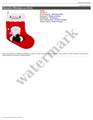 Informacje o produkcie Utworzono 08-03-2017 Skarpeta Mikołaja Lux 65cm Cena : 39,00 zł er m ar k Nr katalogowy : EKW102103A Producent : Made in China Dostępność : Dostępny Stan magazynowy : bardzo wysoki Średnia ocena : brak recenzji w at Bardzo duża skarpeta na prezenty (długość 65cm), uszyta z bardzo dobrych jakościowo materiałów, miła w dotyku. W środku zawieszka do powieszenia, całość ozdobiona wizerunkiem Świętego Mikołaja. Wygenerowano w programie www.oscGold.com