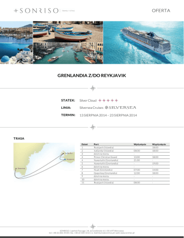 OFERTA GRENLANDIA Z/DO REYKJAVIK STATEK: Silver Cloud LINIA: Silversea Cruises TERMIN: 13 SIERPNIA 2014 – 23 SIERPNIA 2014 TRASA Dzień 1 2 3 4 4 5 6 7 8 9 10 11 Port Reykjavik (Islandia) Isafjordur (Islandia) dzień na morzu Prince Christian Sound Nanortalik (Grenlandia) Nanortalik (Grenlandia) dzień na morzu Nuuk (Grenlandia) Qaqortoq (Grenlandia) dzień na morzu dzień na morzu Reykjavik (Islandia) Wpłynięcie 08:00 13:00 21:00 07:00 12:00 08:00 SONRISO | Lipiński Passage | Al. Jero zo limskie 61 | 00-697 Warszawa tel. +48 22 206 45 00 | fax. +48 22 100 14 61 | e-mail: biuro @so nriso .pl | web: www.so nriso .pl Wypłynięcie 18:00 18:00 18:00 19:00 14:00 18:00 - OFERTA CENA Typ kabiny Vista Suite Veranda Suite Royal Suite Cena z osobę od 4 950 EUR od 6 150 EUR od 11 650 EUR Owner's Suite od 14 050 EUR CENA ZAWIERA DOTATKOWE OPŁATY zakwaterowanie w 2 - os apartamencie wybranej kategorii pełne wyżywienie: 3 posiłki, przekąski między posiłakmi, bufet o północy open bar: wybrane wina i szampany, alkohole premium, różnorodne kawy i herbaty, wodę mineralną butelkowaną, napoje bezalkoholowe oraz soki dostępne w barach i restauracjach korzystanie z mini baru w apartamencie serwis bagażowy podczas wejścia i zejścia ze statku obsługa kamerdynerska 24 godzinny serwis kabinowy korzystanie z urządzeń sportowo - rekreacyjnych dostępnych na pokładzie (baseny, jacuzzi, boiska sportowe, itp.) udział we wszystkich imprezach organizowanych na pokładzie (przedstawienia, pokazy, aukcje, animacje i inne) opłatę serwisową (napiwki) dla obsługi statku transfer pomiędzy portem a miastem (uzależniony od lokalnych przepisów) obowiązkowe opłaty portowe dojazd/przelot do portu rozpoczęcia i zakończenia rejsu transfery (lotnisko - port - lotnisko) ewentualne noclegi przed lub po rejsie wycieczki fakultatywne korzystanie z usług typu: SPA, salon piękności, pralnia itp. wydatki osobiste tj. zakupy w butikach, internet, kasyno itp. obowiązkowe ubezpieczenie turystyczne koszt wymaganych wiz ewentualna opłata paliwowa (linia w momencie wzrotu cen ropy zastrzega sobie prawo do dodania oplaty paliwowej do każdej rezerwacji) Na życzenie świadczymy dodatkowo usługi: rezerwacje hotelowe na całym świecie rezerwacje biletów lotniczych, trasferów oraz parkingu w porcie rezerwacje wycieczek fakultatywnych i innych atrakcji SONRISO | Lipiński Passage | Al. Jero zo limskie 61 | 00-697 Warszawa tel. +48 22 206 45 00 | fax. +48 22 100 14 61 | e-mail: biuro @so nriso .pl | web: www.so nriso .pl
