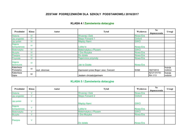 ZESTAW PODRĘCZNIKÓW DLA SZKOŁY PODSTAWOWEJ 2016/2017 KLASA 4 / Zamówienia dotacyjne Przedmiot Historia Jęz.angielski Jęz.polski Zajęcia komputerowe Matematyka Muzyka Plastyka Przyroda Zajęcia techniczne Katecheza Poświętne Katecheza Dęba Klasa Tytuł Autor Wydawca IV IV IV Wczoraj i Dziś Steps Forward 1 Między Nami Nowa Era Oxford GWO IV Lubię to Matematyka z Plusem I Gra Muzyka Do dzieła Tajemnice przyrody Nowa Era GWO Nowa Era Nowa Era Nowa Era Jak to Działa Nowa Era Zaproszeni przez Boga+ zesz. Ćwiczeń WAM IV IV IV IV IV IV wyd. zbiorowe IV Jestem chrześcijaninem Nr dopuszczenia 1627/2012 AZ-21-01/10RA-1/13 Uwagi kupują rodzice kupują rodzice KLASA 5 / Zamówienia dotacyjne Przedmiot Klasa Historia Jęz.angielski V V Jęz.polski V Zajęcia komputerowe Matematyka Muzyka Plastyka V V V Tytuł Autor Wydawca Wczoraj i Dziś Steps Forward 2 Nowa Era Oxford Między Nami GWO Lubię to Matematyka z Plusem I Gra Muzyka Nowa Era GWO Nowa Era Do dzieła Nowa Era V Nr dopuszczenia Uwagi Przyroda Zajęcia techniczne Katecheza V Tajemnice przyrody Nowa Era V Jak to Działa Nowa Era Obdarowani przez Boga+ zesz. ćwiczeń WAM V pr. zbiorowa 675/2013 kupują rodzice KLASA 6 Przedmiot Historia Jęz.angielski Jęz.polski Jęz.polski Zajęcia komputerowe Matematyka Muzyka Plastyka Przyroda Klasa VI VI VI VI VI VI VI VI VI Tytuł Autor Wydawca Grzegorz Wojciechowski A.Otwinowska-Kasztelanic, A.Walewska M.Derlukiewicz Wczoraj i dziś. Podręcznik.do historii i społeczeństwa + zeszyt ćwiczeń New Maxi Taxi 3 + zeszyt ćwiczeń Słowa na start-podręcznik do kształcenia literackiego Nowa Era PWN Nowa Era 443/3/2014 509/4/2014 127/06 M.Derlukiewicz A.Wojciechowska, A.Marcinkiewicz "Słowa na start"-podręcznik do kształcenia językowego część I i II Nowa Era 338/6/2014 G.Koba Zajecia komputerowe dla szkoły podstawowej IV-VI MIGRA 373/2011 Helena Lewicka, Marianna Kowalczyk M.Gromek , G. Kilbach W.Sygut, M.Kwiecień E.Gromek , E. Kłos Matematyka wokół nas. Podręcznik + [2 zeszyty ćwiczeń (wydanie V zmienione 2014)] I gra muzyka-podrecznik i zeszyt ucznia dla kl.IV - VI "Lubię tworzyć" podręcznik + ćwiczenie Przyrodo witaj VI + zeszyt ćwiczeń WSiP Nowa Era MAC WSiP 275/3/2014/z1 569/2012 397/3/2014 VI Katecheza Zajęcia techniczne Zbigniew Marek, Anna Walulik. VI Nr dopuszczenia Urszula Białka Przemienieni przez Boga podręcznik + zesz. ćwiczeń Zajęcia techniczne – część techniczna Seria „Odkrywamy na nowo” WAM 384/2/2011 Operon Pozytywna opinia na posiedzeniu Rady Pedagogicznej w dniu 27 czerwca 2016 r. AZ-21-01/10KR-2/12 Uwagi