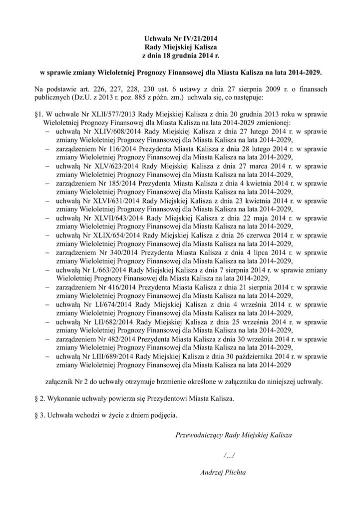 Uchwała Nr IV/21/2014 Rady Miejskiej Kalisza z dnia 18 grudnia 2014 r. w sprawie zmiany Wieloletniej Prognozy Finansowej dla Miasta Kalisza na lata 2014-2029. Na podstawie art. 226, 227, 228, 230 ust. 6 ustawy z dnia 27 sierpnia 2009 r. o finansach publicznych (Dz.U. z 2013 r. poz. 885 z późn. zm.) uchwala się, co następuje: §1. W uchwale Nr XLII/577/2013 Rady Miejskiej Kalisza z dnia 20 grudnia 2013 roku w sprawie Wieloletniej Prognozy Finansowej dla Miasta Kalisza na lata 2014-2029 zmienionej: uchwałą Nr XLIV/608/2014 Rady Miejskiej Kalisza z dnia 27 lutego 2014 r. w sprawie zmiany Wieloletniej Prognozy Finansowej dla Miasta Kalisza na lata 2014-2029, zarządzeniem Nr 116/2014 Prezydenta Miasta Kalisza z dnia 28 lutego 2014 r. w sprawie zmiany Wieloletniej Prognozy Finansowej dla Miasta Kalisza na lata 2014-2029, uchwałą Nr XLV/623/2014 Rady Miejskiej Kalisza z dnia 27 marca 2014 r. w sprawie zmiany Wieloletniej Prognozy Finansowej dla Miasta Kalisza na lata 2014-2029, zarządzeniem Nr 185/2014 Prezydenta Miasta Kalisza z dnia 4 kwietnia 2014 r. w sprawie zmiany Wieloletniej Prognozy Finansowej dla Miasta Kalisza na lata 2014-2029, uchwałą Nr XLVI/631/2014 Rady Miejskiej Kalisza z dnia 23 kwietnia 2014 r. w sprawie zmiany Wieloletniej Prognozy Finansowej dla Miasta Kalisza na lata 2014-2029, uchwałą Nr XLVII/643/2014 Rady Miejskiej Kalisza z dnia 22 maja 2014 r. w sprawie zmiany Wieloletniej Prognozy Finansowej dla Miasta Kalisza na lata 2014-2029, uchwałą Nr XLIX/654/2014 Rady Miejskiej Kalisza z dnia 26 czerwca 2014 r. w sprawie zmiany Wieloletniej Prognozy Finansowej dla Miasta Kalisza na lata 2014-2029, zarządzeniem Nr 340/2014 Prezydenta Miasta Kalisza z dnia 4 lipca 2014 r. w sprawie zmiany Wieloletniej Prognozy Finansowej dla Miasta Kalisza na lata 2014-2029, uchwałą Nr L/663/2014 Rady Miejskiej Kalisza z dnia 7 sierpnia 2014 r. w sprawie zmiany Wieloletniej Prognozy Finansowej dla Miasta Kalisza na lata 2014-2029, zarządzeniem Nr 416/2014 Prezydenta Miasta Kalisza z dnia 21 sierpnia 2014 r. w sprawie zmiany Wieloletniej Prognozy Finansowej dla Miasta Kalisza na lata 2014-2029, uchwałą Nr LI/674/2014 Rady Miejskiej Kalisza z dnia 4 września 2014 r. w sprawie zmiany Wieloletniej Prognozy Finansowej dla Miasta Kalisza na lata 2014-2029, uchwałą Nr LII/682/2014 Rady Miejskiej Kalisza z dnia 25 września 2014 r. w sprawie zmiany Wieloletniej Prognozy Finansowej dla Miasta Kalisza na lata 2014-2029, zarządzeniem Nr 482/2014 Prezydenta Miasta Kalisza z dnia 30 września 2014 r. w sprawie zmiany Wieloletniej Prognozy Finansowej dla Miasta Kalisza na lata 2014-2029, uchwałą Nr LIII/689/2014 Rady Miejskiej Kalisza z dnia 30 października 2014 r. w sprawie zmiany Wieloletniej Prognozy Finansowej dla Miasta Kalisza na lata 2014-2029 załącznik Nr 2 do uchwały otrzymuje brzmienie określone w załączniku do niniejszej uchwały. § 2. Wykonanie uchwały powierza się Prezydentowi Miasta Kalisza. § 3. Uchwała wchodzi w życie z dniem podjęcia. Przewodniczący Rady Miejskiej Kalisza /…/ Andrzej Plichta Uzasadnienie do uchwały Nr IV/21/2014 Rady Miejskiej Kalisza z dnia 18 grudnia 2014 r. w sprawie zmiany Wieloletniej Prognozy Finansowej dla Miasta Kalisza na lata 2014-2029. W niniejszej uchwale wprowadzono następujące zmiany w załączniku Nr 2: na podstawie wniosku nr KPM.3026.5.2013 p.o. Dyrektora Kancelarii Prezydenta Miasta w przedsięwzięciu pn. Działając razem osiągniemy więcej – współpraca Jednostek Samorządu Terytorialnego dla rozwoju Aglomeracji Kalisko-Ostrowskiej zmniejsza się limit wydatków w 2014 r. i zwiększa się limit 2015 r. w związku z podpisanym aneksem do umowy, stosownie do wniosku nr KPM.3026.2.2014 p.o. Dyrektora Kancelarii Prezydenta Miasta skreśla się przedsięwzięcie pn. Promocja Miasta Kalisza poprzez lokowanie produktu w filmie fabularnym i serialu „Kajtuś Czarodziej” w związku z odstąpieniem od realizacji przedsięwzięcia, zgodnie z wnioskiem nr MOPS.DFK.MK.3011.55.2014 Dyrektora Miejskiego Ośrodka Pomocy Społecznej w przedsięwzięciu pn. Innowacje dla integracji cyfrowej – przeciwdziałanie wykluczeniu cyfrowemu na terenie K@lisza zmniejsza się łączne nakłady finansowe, limit wydatków w 2014 r. oraz limit zobowiązań w związku z zakończeniem realizacji w/w projektu oraz podpisaniem aneksu zmniejszającego wartość projektu, zgodnie z wnioskiem nr MOPS.DFK.MK.3011.56.2014 Dyrektora Miejskiego Ośrodka Pomocy Społecznej w przedsięwzięciu pn. Innowacje dla integracji cyfrowej – przeciwdziałanie wykluczeniu cyfrowemu na terenie K@lisza – utrzymanie trwałości projektu zmniejsza się łączne nakłady finansowe, limit wydatków w latach 2014-2016 oraz limit zobowiązań w związku z niższą niż planowano ceną za dostarczanie sygnału Internetu do gospodarstw domowych biorących udział w projekcie, stosownie do wniosku nr WE.301.0008.2014 Naczelnika Wydziału Edukacji wprowadza się nowe przedsięwzięcie związane z programami realizowanymi z udziałem środków, o których mowa w art. 5 ust. 1 pkt 2 i 3, pn. Zanieczyszczenie! Znajdź rozwiązanie! w celu zainteresowania uczniów sferą nauk ścisłych poprzez znajdowanie rozwiązań problemów ekologicznych z jakimi boryka się współczesny świat. Okres realizacji zadania obejmuje lata 2014-2016, łączne nakłady finansowe stanowią kwotę 89.822,79 zł. Zgodnie z podpisana umową program obejmuje wizyty uczniów i nauczycieli Zespołu Szkół Nr 7 do europejskich państw (Hiszpania, Francja, Chorwacja, Czechy) oraz przyjęcie w Kaliszu gości z w/w krajów, na podstawie wniosku nr WFK.031.1.112.2014 Dyrektora Zarządu Dróg Miejskich w przedsięwzięciu pn. Przedłużenie ul. Obozowej od Urzędu Celnego do ul. Zachodniej zwiększa się limit 2016 i jednocześnie wydłuża się okres realizacji do 2016 r. Ponadto urealnia się łączne nakłady finansowe i limit zobowiązań, w nawiązaniu do wniosku nr WFK.031.1.104.2014 Dyr