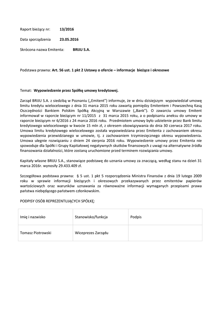 Raport bieżący nr: 13/2016 Data sporządzenia 23.05.2016 Skrócona nazwa Emitenta: BRIJU S.A. Podstawa prawna: Art. 56 ust. 1 pkt 2 Ustawy o ofercie – informacje bieżące i okresowe Temat: Wypowiedzenie przez Spółkę umowy kredytowej. Zarząd BRIJU S.A. z siedzibą w Poznaniu („Emitent”) informuje, że w dniu dzisiejszym wypowiedział umowę limitu kredytu wielocelowego z dnia 31 marca 2015 roku zawartą pomiędzy Emitentem i Powszechną Kasą Oszczędności Bankiem Polskim Spółką Akcyjną w Warszawie („Bank”). O zawarciu umowy Emitent informował w raporcie bieżącym nr 11/2015 z 31 marca 2015 roku, a o podpisaniu aneksu do umowy w raporcie bieżącym nr 6/2016 z 24 marca 2016 roku. Przedmiotem umowy było udzielenie przez Bank limitu kredytowego wielocelowego w kwocie 15 mln zł, z okresem obowiązywania do dnia 30 czerwca 2017 roku. Umowa limitu kredytowego wielocelowego została wypowiedziana przez Emitenta z zachowaniem okresu wypowiedzenia przewidzianego w umowie, tj. z zachowaniem trzymiesięcznego okresu wypowiedzenia. Umowa ulegnie rozwiązaniu z dniem 24 sierpnia 2016 roku. Wypowiedzenie umowy przez Emitenta nie spowoduje dla Spółki i Grupy Kapitałowej negatywnych skutków finansowych z uwagi na alternatywne źródła finansowania działalności, które zostaną uruchomione przed terminem rozwiązania umowy. Kapitały własne BRIJU S.A., stanowiące podstawę do uznania umowy za znaczącą, według stanu na dzień 31 marca 2016r. wynosiły 29.433.409 zł. Szczegółowa podstawa prawna: § 5 ust. 1 pkt 5 rozporządzenia Ministra Finansów z dnia 19 lutego 2009 roku w sprawie informacji bieżących i okresowych przekazywanych przez emitentów papierów wartościowych oraz warunków uznawania za równoważne informacji wymaganych przepisami prawa państwa niebędącego państwem członkowskim. PODPISY OSÓB REPREZENTUJĄCYCH SPÓŁKĘ: Imię i nazwisko Stanowisko/funkcja Tomasz Piotrowski Wiceprezes Zarządu Podpis