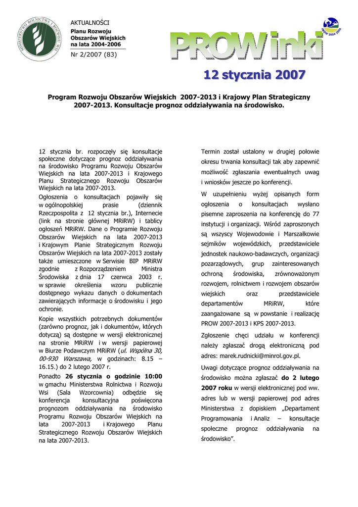 12 stycznia 2007 - Ministerstwo Rolnictwa i Rozwoju Wsi