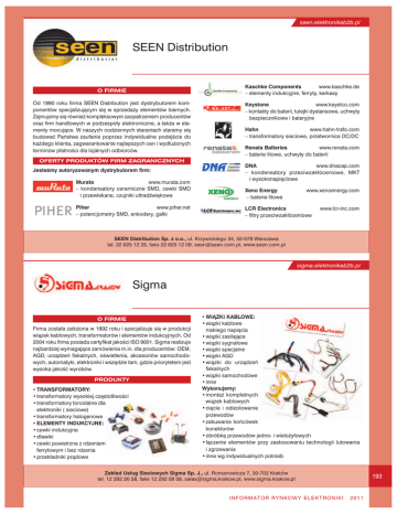 seen.elektronikab2b.pl SEEN Distribution Kaschke Components www.kaschke.de – elementy indukcyjne, ferryty, karkasy OFIRMIE Od 1990 roku firma SEEN Distribution jest dystrybutorem komponentów specjalizującym się w sprzedaży elementów biernych. Zajmujemy się również kompleksowym zaopatrzeniem producentów oraz firm handlowych wpodzespoły elektroniczne, a także w elementy mocujące. Wnaszych codziennych staraniach staramy się budować Państwa zaufanie poprzez indywidualne podejście do każdego klienta, zagwarantowanie najlepszych cen iwydłużonych terminów płatności dla lojalnych odbiorców. OFERTY PRODUKTÓW FIRM ZAGRANICZNYCH Jesteśmy autoryzowanym dystrybutorem firm: Murata www.murata.com – kondensatory ceramiczne SMD, cewki SMD iprzewlekane, czujniki ultradźwiękowe Piher www.piher.net – potencjometry SMD, enkodery, gałki Keystone www.keyelco.com – kontakty do baterii, tulejki dystansowe, uchwyty bezpiecznikowe ibateryjne Hahn www.hahn-trafo.com – transformatory sieciowe, przetwornice DC/DC Renata Batteries www.renata.com – baterie litowe, uchwyty do baterii DNA www.dnacap.com – kondensatory przeciwzakłóceniowe, MKT iwysokonapięciowe Xeno Energy – baterie litowe www.xenoenergy.com LCR Electronics – filtry przeciwzakłóceniowe www.lcr-inc.com SEEN Distribution Sp. zo.o., ul. Krzywickiego 34, 02-078 Warszawa tel. 22 625 12 25, faks 22 625 12 09, [email protected], www.seen.com.pl sigma.elektronikab2b.pl Sigma OFIRMIE Firma została założona w1992 roku ispecjalizuje się wprodukcji wiązek kablowych, transformatorów ielementów indukcyjnych. Od 2004 roku firma posiada certyfikat jakości ISO 9001. Sigma realizuje najbardziej wymagające zamówienia m.in. dla producentów: OEM, AGD, urządzeń fiskalnych, oświetlenia, akcesoriów samochodowych, automatyki, elektroniki iwszędzie tam, gdzie priorytetem jest wysoka jakość wyrobów. PRODUKTY TRANSFORMATORY: • transformatory wysokiej częstotliwości • transformatory toroidalne dla elektroniki ( sieciowe) • transformatory halogenowe ELEMENTY INDUKCYJNE: • cewki indukcyjne • dławiki • cewki powietrzne zrdzeniem ferrytowym ibez rdzenia • przekładniki prądowe WIĄZKI KABLOWE: • wiązki kablowe niskiego napięcia • wiązki zasilające • wiązki sygnałowe • wiązki specjalne • wiązki AGD • wiązki do urządzeń fiskalnych • wiązki samochodowe • inne Wykonujemy: • montaż kompletnych wiązek kablowych • cięcie i odizolowanie przewodów • zakuwanie końcówek konektorów • obróbkę przewodów jedno- iwielożyłowych • łączenie elementów przy zastosowaniu technologii lutowania izgrzewania • inne wg indywidualnych potrzeb Zakład Usług Sieciowych Sigma Sp. J., ul. Romanowicza 7, 30-702 Kraków tel. 12292 26 58, faks 12292 08 58, [email protected], www.sigma.krakow.pl I N F O R M AT O R R Y N KO W Y E L E K T R O N I K I 193 2011