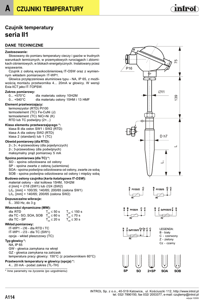 A CZUJNIKI TEMPERATURY Czujnik temperatury seria II1 Zastosowanie: Stosowany do pomiaru temperatury cieczy i gazów w trudnych warunkach termicznych, w przemys³owych ruroci¹gach i zbiornikach cinieniowych, w blokach energetycznych. Instalowany przez wspawanie. Czujnik z os³on¹ wysokocinieniow¹ IT-OSW oraz z wymiennym wk³adem pomiarowym IT-WP1. G³owica przy³¹czeniowa aluminiowa typu - NA, IP 65, z mo¿liwoci¹ monta¿u przetwornika 4... 20mA w g³owicy. W wersji Exia IICT jako IT-TOPSW. 75 DANE DANE TECHNICZNE TECHNICZNE P16 ∅11 139 Zakres pomiarowy: 0... +570°C dla materia³u os³ony 10H2M 0... +540°C dla materia³u os³ony 15HM i 13 HMF Element przetwarzaj¹cy: termorezystor (RTD) Pt100 termoelement (TC) Fe-CuNi (J) termoelement (TC) NiCr-Ni (K) RTD lub TC podwójny (2×...) Klasa elementu przetwarzaj¹cego *: klasa B dla os³on SW1 i SW2 (RTD) klasa A dla os³ony SW2 (RTD) klasa 2 (standard) lub 1 (TC) D h7 L Obwód pomiarowy (dla RTD): 2-; 3-; 4-przewodowy (dla pojedynczych) 2-; 3-przewodowy (dla podwójnych) maksymalny pr¹d pomiarowy 5 mA L Spoina pomiarowa (dla TC) *: SO - spoina odizolowana od os³ony SP - spoina zwarta z os³on¹ (uziemiona) SOA - spoina podwójna odizolowana od os³ony, zwarte ze sob¹ SOB - spoina podwójna odizolowana od os³ony i miêdzy sob¹ Budowa os³ony czujnika (karta katalogowa IT-OSW): materia³ os³ony - stal kot³owa 15HM, 10H2M d [mm] = ∅18 (SW1) lub ∅24 (SW2) L/L1 [mm] = 100/35; 140/65; 200/65 (os³ona SW1) L/L1 [mm] = 140/65; 200/65 (os³ona SW2) Dopuszczalne wibracje: 5... 350 Hz, do 3 g W³asnoci dynamiczne (MW): dla RTD T05 ≤ 50 s dla TC - SO, SOA, SOB T05 ≤ 60 s dla TC - SP T05 ≤ 20 s T09 ≤ 150 s T09 ≤ 70 s T09 ≤ 30 s Wk³ad pomiarowy: IT-WP1 - ∅6 - dla RTD i TC IT-WP1 - ∅3 - dla TC (SW1) opcja - wk³ad p³aszczowy (TC) LEGENDA: B - bia³y C - czerwony Z - zielony Cz - czarny Typ g³owicy *: NA, IP 65 GW - g³owica zamykana na wkrêt GZ - g³owica zamykana na zatrzask temperatura pracy g³owicy: 150°C (z przetwornikiem 60°C) Przetwornik temperatury w g³owicy (opcja) *: 4... 20 mA - podaæ zakres (TL-TH) * Inne parametry na ¿yczenie (po uzgodnieniu) A114 SP SO 2×SP SOA SOB INTROL Sp. z o.o., 40-519 Katowice, ul. Ko ściusz ki 112, http://www.introl.pl tel. 032/ 7890150, fax 032/ 2053377, e-mail: [email protected] edycja 1/2005 CZUJNIKI TEMPERATURY A Dopuszczalne cinienie: Typ Materia³ os³ony os³ony czujnika czujnika 15HM D³ugoæ os³ony czujnika L 100 140 Dopuszczalne obci¹¿enie para lub gaz V ≤ 60 m/s woda V ≤ 5 m/s temperatura cinienie przep³yw cinienie przep³yw P [MPa] [m/s] P [MPa] [m/s] T [°C] 15,7 540 13,7 200 SW1-A 13,4 100 10H2M 140 13,8 570 11,5 200 SW2-B 15HM 10H2M 100 140 200 25 60 5 44 540 15,7 570 13,4 SPOSÓB OZNACZANIA I ZAMAWIANIA KODY ZAMÓWIENIA CZUJNIK TEMPERATURY IT - II1 - / / - - - - - - Element przetwarzaj¹cy: (2×) Pt100, J lub K Klasa elementu: B, A, 1 lub 2 Obwód pomiarowy lub typ spoiny: 2, 3, 4 (przew.), SP, SO, SOA lub SOB Materia³ os³ony: 10H2M, 15HM rednica os³ony d [mm]: 18, 24 D³ugoæ os³ony L [mm]: 100, 140, 200 Typ zamkniêcia g³owicy: GW, GZ Zakres przetwornika: (TL-TH) Wk³ad wymienny TC p³aszczowy: P Przyk³ad kodu zamówienia: IT-II1-K/2/SO-10H2M-18-100-GZ-(0-500)-P - oznacza czujnik z termoelementem typu K, klasa 2, spoina odizolowana, materia³ os³ony 10H2M, d³ugoæ os³ony L = 100 mm, g³owica zamykana na zatrzask, przetwornik 4... 20 mA w g³owicy z zakresem (0-500°C). INTROL Sp. z o.o., 40-519 Katowice, ul. Ko ściusz ki 112, http://www.introl.pl tel. 032/ 7890150 , fax 032/ 2053377, e-mail: [email protected] edycja 1/2005 A115