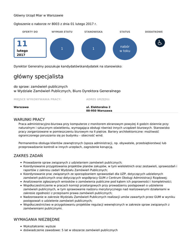 Główny Urząd Miar w Warszawie Ogłoszenie o naborze nr 8003 z dnia 01 lutego 2017 r. OFERTY DO WYMIAR ETATU STANOWISKA STATUS 1 1 nabór w toku 11 lutego 2017 DODATKOWE Dyrektor Generalny poszukuje kandydatów\kandydatek na stanowisko: główny specjalista do spraw: zamówień publicznych w Wydziale Zamówień Publicznych, Biuro Dyrektora Generalnego MIEJSCE WYKONYWANIA PRACY: ADRES URZĘDU: Warszawa ul. Elektoralna 2 00-950 Warszawa WARUNKI PRACY Praca administracyjno-biurowa przy komputerze z monitorem ekranowym powyżej 4 godzin dziennie przy naturalnym i sztucznym oświetleniu, wymagająca obsługi również innych urządzeń biurowych. Stanowisko pracy zorganizowane w pomieszczeniu biurowym na II piętrze. Bariery architektoniczne: możliwość ograniczonego poruszania się po budynku – obecność wind. Permanentna obsługa klientów zewnętrznych (spoza administracji, np. obywatele, przedsiębiorstwa) lub przeprowadzanie kontroli w innych urzędach, zagrożenie korupcją. ZAKRES ZADAŃ Prowadzenie spraw związanych z udzielaniem zamówień publicznych; Koordynowanie przygotowania projektów planów zakupów, w tym wieloletnich oraz zestawień, sprawozdań i raportów z zakresu zadań Wydziału Zamówień Publicznych; Koordynowanie prac związanych ze sporządzaniem sprawozdań dla UZP, dotyczących udzielonych zamówień publicznych oraz dotyczących współpracy GUM z Centrum Obsługi Administracji Rządowej; Analizowanie zgłaszanych wniosków o zamówienia publiczne pod kątem ich poprawności i kompletności; Współuczestniczenie w pracach komisji przetargowych przy prowadzeniu postępowań o udzielenie zamówień publicznych, w tym sprawowanie nadzoru merytorycznego nad realizowanymi działaniami w zakresie zgodności z przepisami prawa zamówień publicznych; Nadzorowanie w zakresie Wydziału Zamówień Publicznych realizacji umów zawartych przez GUM w wyniku postępowań o udzielenie zamówień publicznych; Współuczestnictwo w przygotowaniu projektów regulacji wewnętrznych w zakresie spraw związanych z zamówieniami publicznymi. WYMAGANIA NIEZBĘDNE Wykształcenie: wyższe doświadczenie zawodowe: 5 lat w obszarze zamówień publicznych Przeszkolenie w zakresie ustawy Prawo zamówień publicznych; Znajomość języka angielskiego w stopniu komunikatywnym; Znajomość ustaw: Prawo zamówień publicznych, Prawo o miarach, o finansach publicznych, o prawie autorskim i prawach pokrewnych; Podstawowa znajomość kpa, kc, ksh; Posiadanie obywatelstwa polskiego Korzystanie z pełni praw publicznych Nieskazanie prawomocnym wyrokiem za umyślne przestępstwo lub umyślne przestępstwo skarbowe WYMAGANIA DODATKOWE doświadczenie zawodowe: 1 rok w administracji publicznej DOKUMENTY I OŚWIADCZENIA NIEZBĘDNE Życiorys/CV i list motywacyjny Kopie dokumentów potwierdzających spełnienie wymagania niezbędnego w zakresie wykształcenia Kopie dokumentów potwierdzających spełnienie wymagania niezbędnego w zakresie doświadczenia zawodowego / stażu pracy Kopie dokumentów potwierdzających spełnienie wymagania niezbędnego w zakresie przeszkolenia w zakresie ustawy Prawo zamówień publicznych; Kopie dokumentów potwierdzających spełnienie wymagania niezbędnego w zakresie znajomości języka angielskiego (np. kopia certyfikatu językowego, zaświadczenia o ukończeniu kursu językowego, oświadczenie kandydata o poziomie znajomości języka angielskiego). Oświadczenie o posiadaniu obywatelstwa polskiego albo kopia dokumentu potwierdzającego posiadanie polskiego obywatelstwa Oświadczenie o wyrażeniu zgody na przetwarzanie danych osobowych do celów naboru Oświadczenie o korzystaniu z pełni praw publicznych Oświadczenie o nieskazaniu prawomocnym wyrokiem za umyślne przestępstwo lub umyślne przestępstwo skarbowe DOKUMENTY I OŚWIADCZENIA DODATKOWE kopia dokumentu potwierdzającego niepełnosprawność - w przypadku kandydatek/kandydatów, zamierzających skorzystać z pierwszeństwa w zatrudnieniu w przypadku, gdy znajdą się w gronie najlepszych kandydatek/kandydatów Kopie dokumentów potwierdzających spełnienie wymagania dodatkowego w zakresie doświadczenia zawodowego / stażu pracy TERMINY I MIEJSCE SKŁADANIA DOKUMENTÓW Dokumenty należy złożyć do: 11 lutego 2017 r. Decyduje data: stempla pocztowego / osobistego dostarczenia oferty do urzędu Miejsce składania dokumentów: Główny Urząd Miar Biuro Dyrektora Generalnego ul. Elektoralna 2 00-950 Warszawa lub składać w Recepcji GUM w godz. 8.00 – 16.00 z dopiskiem „Oferta pracy na stanowisko głównego specjalisty w Wydziale Zamówień Publicznych – nie otwierać”. INNE INFORMACJE: W miesiącu poprzedzającym datę upublicznienia ogłoszenia wskaźnik zatrudnienia osób niepełnosprawnych w urzędzie, w rozumieniu przepisów o rehabilitacji zawodowej i społecznej oraz zatrudnianiu osób niepełnosprawnych, nie wynosi co najmniej 6%. Nasz urząd jest pracodawcą równych szans i wszystkie aplikacje są rozważane z równą uwagą bez względu na płeć, wiek, niepełnosprawność, rasę, narodowość, przekonania polityczne, przynależność związkową, pochodzenie etniczne, wyznanie, orientację seksualną czy też jakąkolwiek inną cechę prawnie chronioną. Weryfikacja spełniania przez kandydatów wymagań formalnych dokonana zostanie na podstawie dokumentów wymienionych w części "dokumenty i oświadczenia niezbędne". W związku z tym podkreślamy, że kompletne aplikacje to takie, które zawierają wszystkie wymagane dokumenty i własnoręcznie podpisane oświadczenia. Przekazanie dokumentów wymienionych w części "dokumenty i oświadczenia dodatkowe" nie jest obowiązkowe, jednak będą one podstawą przeprowadzenia oceny spełniania wymagań dodatkowych przez kandydatów. Zachęcamy do składania ofert osoby niepełnosprawne, które spełniają wymagania określone w niniejszym ogłoszeniu. Kandydaci proszeni są o podanie numeru telefonu oraz adresu poczty elektronicznej. 