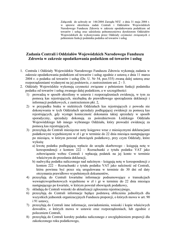 Załącznik do uchwały nr 146/2004 Zarządu NFZ z dnia 31 maja 2004 r. w sprawie określenia zadań Centrali i Oddziałów Wojewódzkich Narodowego Funduszu Zdrowia w zakresie opodatkowania podatkiem od towarów i usług oraz udzielenia pełnomocnictwa dyrektorom Oddziałów Wojewódzkich do wykonywania przez Oddziały czynności związanych z pełnieniem funkcji podatnika podatku od towarów i usług Zadania Centrali i Oddziałów Wojewódzkich Narodowego Funduszu Zdrowia w zakresie opodatkowania podatkiem od towarów i usług 1. Centrala i Oddziały Wojewódzkie Narodowego Funduszu Zdrowia wykonują zadania w zakresie opodatkowania podatkiem od towarów i usług zgodnie z ustawą z dnia 11 marca 2004 r. o podatku od towarów i usług (Dz. U. Nr 54, poz.535) zwaną dalej ustawą oraz rozporządzeniami wydanymi na jej podstawie, z zastrzeżeniem ust. 2 - 5. 2. Oddziały Wojewódzkie wykonują czynności związane z pełnieniem funkcji podatnika podatku od towarów i usług zwanego dalej podatkiem, a w szczególności: 1) prowadzą w sposób określony w ustawie i rozporządzeniach ewidencję, w tym za pomocą kas rejestrujących, niezbędną do prawidłowego sporządzenia deklaracji i informacji podatkowych, z zastrzeżeniem pkt. 2, 2) w przypadku braku w niektórych Oddziałach kas rejestrujących z powodu nie dokonywania w tych Oddziałach sprzedaży podlegającej ewidencji za pomocą kas rejestrujących, gdy wystąpi konieczność dokonania takiej sprzedaży w sposób sporadyczny, sprzedaży dokonują za pośrednictwem Łódzkiego Oddziału Wojewódzkiego lub innego wybranego Oddziału, który prowadzi ewidencję za pomocą kas rejestrujących, 3) przesyłają do Centrali miesięczne noty księgowe wraz z miesięcznymi deklaracjami podatkowymi wypełnionymi w zł i gr w terminie do 22 dnia miesiąca następującego po miesiącu, w którym powstał obowiązek podatkowy, przy czym Oddziały, które wykażą: a) kwotę podatku podlegającą wpłacie do urzędu skarbowego - księgują notę w korespondencji z kontem 222 – Rozrachunki z tytułu podatku VAT jako zobowiązanie wobec Centrali i wpłacają podatek na jej konto w terminie właściwym do przesłania deklaracji, b) nadwyżkę podatku naliczonego nad należnym - księgują notę w korespondencji z kontem 222 – Rozrachunki z tytułu podatku VAT jako należność od Centrali, która powinna być przez nią uregulowana w terminie do 30 dni od daty otrzymania prawidłowo wypełnionych dokumentów, 4) przesyłają do Centrali kwartalne informacje podsumowujące o transakcjach wewnątrzwspólnotowych wypełnione w zł i gr w terminie do 22 dnia miesiąca następującego po kwartale, w którym powstał obowiązek podatkowy, 5) składają do Centrali wnioski do aktualizacji zgłoszenia rejestracyjnego, 6) przesyłają do Centrali informacje będące podstawą obliczenia jednolitych dla wszystkich jednostek organizacyjnych Funduszu proporcji, o których mowa w art. 90 i 91 ustawy, 7) przesyłają do Centrali inne informacje, zawiadomienia, wnioski i kopie właściwych dowodów, o których mowa w ustawie oraz rozporządzeniach, lub zgodnie z poleceniem Centrali, 8) przesyłają do Centrali korekty podatku naliczonego z uwzględnieniem proporcji dla zakończonego roku podatkowego, 9) przesyłają do Centrali inne korekty deklaracji, informacji, zawiadomień, wniosków lub innych dokumentów niezwłocznie po stwierdzeniu w nich jakichkolwiek błędów, 10) odbierają od dostawców faktury, zbiorcze zestawienia recept na leki i wyroby medyczne podlegające refundacji oraz inne dowody zakupu, zawierające w szczególności dane o NFZ: a) odbiorca i płatnik dowodu - nazwa, siedziba i adres Oddziału, b) nabywca - Narodowy Fundusz Zdrowia z siedzibą w Warszawie, ul. Grójecka 186, 02-390 Warszawa, NIP: 526-26-84-574 (a przy wewnątrzwspólnotowym nabyciu towarów lub usług: PL 526-26-84-574), 11) wystawiają odbiorcom faktury i inne dowody sprzedaży (dostawy), zawierające w szczególności dane o NFZ: a) wystawca dowodu - nazwa, siedziba i adres Oddziału, b) dostawca - Narodowy Fundusz Zdrowia z siedzibą w Warszawie, ul. Grójecka 186, 02-390 Warszawa, NIP: 526-26-84-574 (a przy wewnątrzwspólnotowej dostawie towarów lub usług: PL 526-26-84-574), 12) wykonują bez polecenia Centrali inne przewidziane prawem czynności w celu prawidłowego rozliczenia podatku za Oddział, 13) złożą za kwiecień 2004 r. (w przypadku rozliczeń miesięcznych) lub za okres styczeń – kwiecień 2004 r. (w przypadku rozliczeń kwartalnych) ostatnią deklarację podatkową za Oddział wraz z odpowiednią pisemną informacją do urzędu skarbowego kierowanego przez naczelnika właściwego dla Oddziału. Wraz z deklaracją należy: a) uregulować podatek należny wobec urzędu skarbowego - w przypadku wystąpienia zobowiązań z tytułu podatku, b) przesłać do Centrali notę księgową obciążającą ją podatkiem naliczonym w przypadku wystąpienia należności z tytułu podatku. Potwierdzone za zgodność z oryginałem kopie złożonych deklaracji należy przesłać do Centrali. 3. Noty księgowe, deklaracje podatkowe, informacje, zawiadomienia, wnioski oraz ich korekty przesyłane są do Centrali w formie pisemnej, a w przypadku opracowania przez Centralę wzoru – także elektronicznej. Dokumenty w formie pisemnej powinny być podpisane przez Dyrektora Oddziału lub Zastępcę Dyrektora ds. Ekonomiczno – Finansowych oraz Naczelnika Wydziału – Głównego Księgowego. 4. Centrala wykonuje czynności związane z pełnieniem funkcji podatnika podatku od towarów i usług, a w szczególności: 1) w zakresie opodatkowania Centrali – określone w ust. 2, 2) w zakresie opodatkowania Narodowego Funduszu Zdrowia: a) wydaje bieżące wyjaśnienia i zalecenia związane z prawidłowym rozliczeniem podatku. W imieniu Centrali czynności te wykonuje Dyrektor Departamentu Księgowości – Główny Księgowy z urzędu lub na wniosek Oddziału. Wnioski i