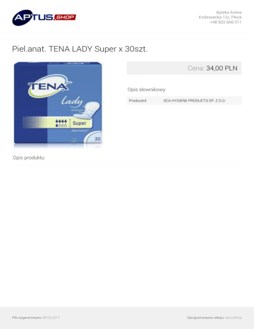 Apteka Avena Królewiecka 12c, Płock +48 502 666 011 Piel.anat. TENA LADY Super x 30szt. Cena: 34,00 PLN Opis słownikowy Producent SCA HYGIENE PRODUCTS SP. Z O.O. Opis produktu Plik wygenerowano: 08-03-2017 Powered by TCPDF (www.tcpdf.org) Oprogramowanie sklepu: AptusShop