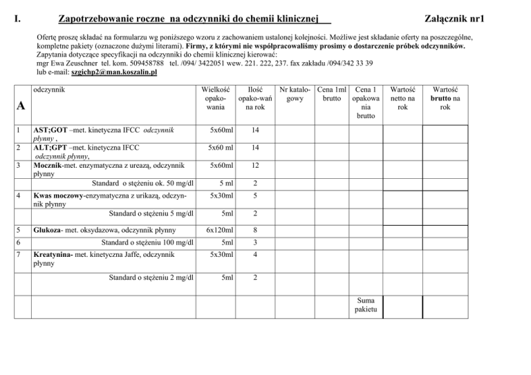 Zapotrzebowanie roczne na odczynniki do chemii klinicznej