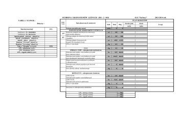 OCHRONA EKOSYSTEMÓW LEŚNYCH (501 - 2 - 043) O.O."Turbacz" 2013-2014 rok PLAN KOSZTÓW TABELA STAWEK : Oddz. wydz. Dotyczy : Stawka/wartość Godzinowa dla robotników Godzinowa dla kierowców Spirale-pakuły założenie (akord ha) Spirale przekładanie (akord ha) Spirale zdjęcie (akord ha) Repelent "Cervacol" (akord ha) Repelent "Cervastop" (akord ha) Tuby z "Tek-polu" (szt/godz) LPS - jednokonny (godz) LPS - dwukonny (godz) LPS - ciągnik rolniczy (godz) ZUL pcl pcl Opis planowanych zamierzeń Jesienne poszukiwania zasnui OGRANICZENIE SZKODNIKÓW WTÓRNYCH Wyłożenie pułapek naturalnych do obserwacji rójki kornika drukarza Obsługa pułapek do obserwacji rójki zasnui i brudnicy. Obsługa pułapek feromonowych (kornik 320, drwalnik 10 szt): LPS-y w tym dziale Jedn. Ilość Rbg. osoby 0 0 szt 40 80 szt 50 200 szt 690 4 223 rbg 64 64 rbg 32 32 ha 0,0 akord ha 146,8 akord ha 0,0 akord szt 0 akord rbg 0 0 ha 1,0 akord XXX INNE SPIRALE, TUBY - zabezpieczenia mechaniczne Zabezpieczanie pędów wierzchołkowych jodeł przez założenie spiral Zabezpieczanie pędów wierzchołkowych jodeł przez przełożenie założonych wcześniej spiral. Zdjęcie spiral na powierzchniach wycofanych z zabezpieczania. Zabezpieczanie tubami pojedynczych drzewek liściastych. Inne sposoby zabezp. mechanicznego REPELENTY - zabezpieczanie chemiczne CERVACOL Zabezpieczanie pędów wierzchołkowych CERVACOL Zabezpieczanie przeciw spałowaniu LPS-y w tym dziale ha 10,0 akord rbg 6 6 Inne prace w zabezpieczeniu młodników rbg 0 0 LPS - zaprzęg 1-konny LPS - zaprzęg 2-konny LPS - ciągnik rolniczy rbg. rbg. rbg. Stawka jedn. Koszt netto netto Uwagi OCHRONA EKOSYSTEMÓW LEŚNYCH (501 - 2 - 043) Oddz. wydz. pcl pcl Opis planowanych zamierzeń Jesienne poszukiwania zasnui OGRANICZENIE SZKODNIKÓW WTÓRNYCH Wyłożenie pułapek naturalnych do obserwacji rójki kornika drukarza Obsługa pułapek do obserwacji rójki zasnui i brudnicy. Obsługa pułapek feromonowych (kornik 180, drwalnik 10 szt): LPS-y w tym dziale INNE SPIRALE, TUBY - zabezpieczenia mechaniczne Zabezpieczanie pędów wierzchołkowych jodeł przez założenie spiral Zabezpieczanie pędów wierzchołkowych jodeł przez przełożenie założonych wcześniej spiral. Zdjęcie spiral na powierzchniach wycofanych z zabezpieczania. Zabezpieczanie tubami pojedynczych drzewek liściastych. Inne sposoby zabezp. mechanicznego Jedn. O.O."Kudłoń" PLAN KOSZTÓW Ilość Rbg. osoby 0 0 szt 20 40 szt 20 80 szt 380 2 326 rbg 64 64 rbg 32 32 ha 0,0 akord ha 55,2 akord ha 0,0 akord szt 0 akord rbg 0 0 ha 68,0 akord REPELENTY - zabezpieczanie chemiczne CERVACOL Zabezpieczanie pędów wierzchołkowych CERVACOL Zabezpieczanie przeciw spałowaniu LPS-y w tym dziale ha 14,0 akord rbg 20 20 Inne prace w zabezpieczeniu młodników rbg 0 0 LPS - zaprzęg 1-konny LPS - zaprzęg 2-konny LPS - ciągnik rolniczy rbg. rbg. rbg. Stawka jedn. Koszt netto netto 2013-2014 rok Uwagi OCHRONA EKOSYSTEMÓW LEŚNYCH (501 - 2 - 043) Oddz. wydz. pcl pcl Opis planowanych zamierzeń Jesienne poszukiwania zasnui OGRANICZENIE SZKODNIKÓW WTÓRNYCH Wyłożenie pułapek naturalnych do obserwacji rójki kornika drukarza Obsługa pułapek do obserwacji rójki zasnui i brudnicy. Obsługa pułapek feromonowych (kornik 195, drwalnik 10 szt): LPS-y w tym dziale INNE SPIRALE, TUBY - zabezpieczenia mechaniczne Zabezpieczanie pędów wierzchołkowych jodeł przez założenie spiral Zabezpieczanie pędów wierzchołkowych jodeł przez przełożenie założonych wcześniej spiral. Zdjęcie spiral na powierzchniach wycofanych z zabezpieczania. Zabezpieczanie tubami pojedynczych drzewek liściastych. Inne sposoby zabezp. mechanicznego Jedn. O.O."Suchora" PLAN KOSZTÓW Ilość Stawka jedn. netto Rbg. osoby 0 0 szt 40 80 szt 40 160 szt 410 2 263 rbg 64 64 rbg 32 32 ha 0,0 akord ha 57,8 akord ha 3,0 akord szt 0 akord rbg 0 0 ha 55,4 akord REPELENTY - zabezpieczanie chemiczne CERVACOL Zabezpieczanie pędów wierzchołkowych CERVACOL Zabezpieczanie przeciw spałowaniu LPS-y w tym dziale ha 14,0 akord rbg 20 20 Inne prace w zabezpieczeniu młodników rbg 0 0 LPS - zaprzęg 1-konny LPS - zaprzęg 2-konny LPS - ciągnik rolniczy rbg. rbg. rbg. Koszt netto 2013-2014 rok Uwagi OCHRONA EKOSYSTEMÓW LEŚNYCH (501 - 2 - 043) Oddz. wydz. pcl pcl Opis planowanych zamierzeń Jesienne poszukiwania zasnui OGRANICZENIE SZKODNIKÓW WTÓRNYCH Wyłożenie pułapek naturalnych do obserwacji rójki kornika drukarza Obsługa pułapek do obserwacji rójki zasnui i brudnicy. Obsługa pułapek feromonowych (kornik 125, drwalnik 5 szt): LPS-y w tym dziale INNE SPIRALE, TUBY - zabezpieczenia mechaniczne Zabezpieczanie pędów wierzchołkowych jodeł przez założenie spiral Zabezpieczanie pędów wierzchołkowych jodeł przez przełożenie założonych wcześniej spiral. Zdjęcie spiral na powierzchniach wycofanych z zabezpieczania. Zabezpieczanie tubami pojedynczych drzewek liściastych. Inne sposoby zabezp. mechanicznego Jedn. O.O."Jaworzyna" PLAN KOSZTÓW Ilość Stawka jedn. netto Rbg. osoby 0 0 szt 10 20 szt 20 80 szt 260 1 331 rbg 64 64 rbg 16 16 ha 0,5 akord ha 11,7 akord ha 0,0 akord szt 0 akord rbg 0 0 ha 0,0 akord REPELENTY - zabezpieczanie chemiczne CERVACOL Zabezpieczanie pędów wierzchołkowych CERVACOL Zabezpieczanie przeciw spałowaniu LPS-y w tym dziale ha 0,0 akord rbg 0 0 Inne prace w zabezpieczeniu młodników rbg 0 0 LPS - zaprzęg 1-konny LPS - zaprzęg 2-konny LPS - ciągnik rolniczy rbg. rbg. rbg. Koszt netto 2013-2014 rok Uwagi OCHRONA EKOSYSTEMÓW LEŚNYCH (501 - 2 - 043) Oddz. wydz. pcl pcl Opis planowanych zamierzeń Jesienne poszukiwania zasnui OGRANICZENIE SZKODNIKÓW WTÓRNYCH Wyłożenie pułapek naturalnych do obserwacji rójki kornika drukarza Obsługa pułapek do obserwacji rójki zasnui i brudnicy. Obsługa pułapek feromonowych (kornik 150, drwalnik 5 szt): LPS-y w tym dziale INNE SPIRALE, TUBY - zabezpieczenia mechaniczne Zabezpieczanie pędów wierzchołkowych jodeł przez założenie spiral Zabezpie
