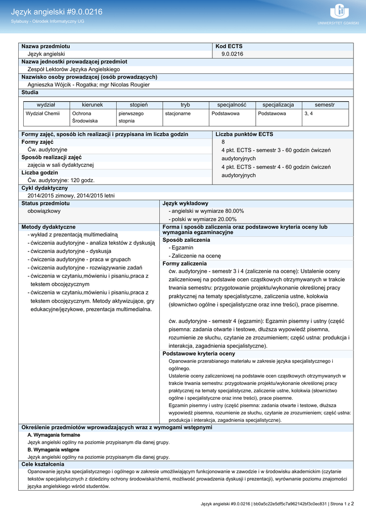 Język angielski #9.0.0216 Sylabusy - Ośrodek Informatyczny UG Nazwa przedmiotu Język angielski Nazwa jednostki prowadzącej przedmiot Zespół Lektorów Języka Angielskiego Nazwisko osoby prowadzącej (osób prowadzących) Agnieszka Wójcik - Rogatka; mgr Nicolas Rougier Studia wydział Wydział Chemii kierunek Ochrona Środowiska Kod ECTS 9.0.0216 stopień pierwszego stopnia tryb stacjonarne specjalność Podstawowa specjalizacja Podstawowa semestr 3, 4 Formy zajęć, sposób ich realizacji i przypisana im liczba godzin Liczba punktów ECTS Formy zajęć 8 Ćw. audytoryjne 4 pkt. ECTS - semestr 3 - 60 godzin ćwiczeń Sposób realizacji zajęć audytoryjnych zajęcia w sali dydaktycznej 4 pkt. ECTS - semestr 4 - 60 godzin ćwiczeń Liczba godzin audytoryjnych Ćw. audytoryjne: 120 godz. Cykl dydaktyczny 2014/2015 zimowy, 2014/2015 letni Status przedmiotu Język wykładowy obowiązkowy - angielski w wymiarze 80.00% - polski w wymiarze 20.00% Metody dydaktyczne Forma i sposób zaliczenia oraz podstawowe kryteria oceny lub wymagania egzaminacyjne - wykład z prezentacją multimedialną - ćwiczenia audytoryjne - analiza tekstów z dyskusją Sposób zaliczenia - Egzamin - ćwiczenia audytoryjne - dyskusja - Zaliczenie na ocenę - ćwiczenia audytoryjne - praca w grupach Formy zaliczenia - ćwiczenia audytoryjne - rozwiązywanie zadań ćw. audytoryjne - semestr 3 i 4 (zaliczenie na ocenę): Ustalenie oceny - ćwiczenia w czytaniu,mówieniu i pisaniu,praca z zaliczeniowej na podstawie ocen cząstkowych otrzymywanych w trakcie tekstem obcojęzycznym trwania semestru: przygotowanie projektu/wykonanie określonej pracy - ćwiczenia w czytaniu,mówieniu i pisaniu,praca z praktycznej na tematy specjalistyczne, zaliczenia ustne, kolokwia tekstem obcojęzycznym. Metody aktywizujące, gry (słownictwo ogólne i specjalistyczne oraz inne treści), prace pisemne. edukacyjne/językowe, prezentacja multimedialna. ćw. audytoryjne - semestr 4 (egzamin): Egzamin pisemny i ustny (część pisemna: zadania otwarte i testowe, dłuższa wypowiedź pisemna, rozumienie ze słuchu, czytanie ze zrozumieniem; część ustna: produkcja i interakcja, zagadnienia specjalistyczne). Podstawowe kryteria oceny Opanowanie przerabianego materiału w zakresie języka specjalistycznego i ogólnego. Ustalenie oceny zaliczeniowej na podstawie ocen cząstkowych otrzymywanych w trakcie trwania semestru: przygotowanie projektu/wykonanie określonej pracy praktycznej na tematy specjalistyczne, zaliczenie ustne, kolokwia (słownictwo ogólne i specjalistyczne oraz inne treści), prace pisemne. Egzamin pisemny i ustny (część pisemna: zadania otwarte i testowe, dłuższa wypowiedź pisemna, rozumienie ze słuchu, czytanie ze zrozumieniem; część ustna: produkcja i interakcja, zagadnienia specjalistyczne). Określenie przedmiotów wprowadzających wraz z wymogami wstępnymi A. Wymagania formalne Język angielski ogólny na poziomie przypisanym dla danej grupy. B. Wymagania wstępne Język angielski ogólny na poziomie przypisanym dla danej grupy. Cele kształcenia Opanowanie języka specjalistycznego i ogólnego w zakresie umożliwiającym funkcjonowanie w zawodzie i w środowisku akademickim (czytanie tekstów specjalistycznych z dziedziny ochrony środowiska/chemii, możliwość prowadzenia dyskusji i prezentacji), wyrównanie poziomu znajomości języka angielskiego wśród studentów. Język angielski #9.0.0216 | bb0a5c22e5df5c7a962142bf3c0ec831 | Strona 1 z 2 Język angielski #9.0.0216 Sylabusy - Ośrodek Informatyczny UG Treści programowe Elementy wybranych zagadnień specjalistycznych z danej dziedziny (ochrona środowiska): 1. Środowisko wodne i lądowe. 2. Żródła energii i znieczyszczeń. 3. Atomy, pierwistki, równania chemiczne. 4. Związki chemiczne: substancje i związki chemiczne oraz ich zastosowanie. 5. Metale i tworzywa sztuczne: ich właściwości i zastosowanie. 6. Globalne ociepletnie. 7. Świat flory i fauny. 8. Alternatywne źródła energii. 9. Problemy globalizacji. Wykaz literatury A. Literatura wymagana do ostatecznego zaliczenia zajęć (zdania egzaminu): Wybrane zagadnienia z : - Kelly, Keith. Science. Oxford: Macmillan, 2008. - Domański, Piotr. English in Science and Technology. Warszawa: WNT, 1996. - Podręcznik wiodący z zakresu General English. - Matreriały własne, przygotowywane przez nauczyciela, popularno-naukowe materiały prasowe pochodzące z Internetu (np. www.bbc.co.uk/sn/, www.sciencedaily.com/news, www.usgs.org, www.youtube.com). B. Literatura uzupełniająca - Słownik naukowo-techniczny polsko-angielski, WNT. - Słownik naukowo-techniczny angielsko-polski, WNT. Efekty uczenia się Wiedza K_U06posługuje się terminologią z zakresu ochrony Student potrafi posługiwać się poznanym słownictwem specjalistycznym oraz środowiska oraz nomenklaturą poszczególnych dyscyplin z swobodnie wypowiadać się na wybrany temat. nią związanych; Umiejętności Student potrafi zastosować wiedzę w praktyce opisując omawiane zagadnienia K_U13samodzielnie przygotowuje i wygłasza prezentację ochrony środowiska, posiada następujące umiejętności : rozumienie tekstu szczegółowych zagadnień z zakresu ochrony środowiska pisanego i mówionego, umiejętności konwersacyjne, pisemne, ma znajomość oraz uczestniczy w ukierunkowanej dyskusji z podstawowej terminologii z omawianej dziedziny. wykorzystaniem języka naukowego; K_U14rozpoznaje i podejmuje próby rozwiązania, w postaci Kompetencje społeczne (postawy) Student potrafi pracować zarówno samodzielnie jak i w grupie. Potrafi samodzielnie udokumentowanego opracowania, problemów jakości wyrażać opinię i prowadzić dyskusję. Student dąży do opanowania przerabianego środowiska i życia człowieka oraz zrównoważonego materiału, wykazuje kreatywność w zadaniach projektowych, potrafi podejść rozwoju; logicznie do przedstawianych problemów oraz angażuje się w pracę grupy. K_U15ma umiejętności językowe w zakre