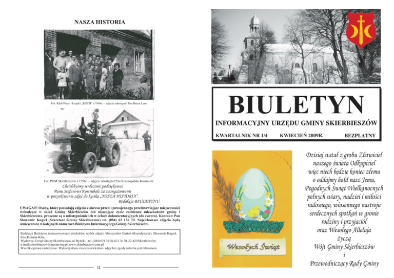 NASZA HISTORIA Fot. Klub Prasy i ksi¹¿ki „RUCH” z 1968r. – zdjêcie udostêpni³ Pan Baran Leon KWARTALNIK NR 1/4 Fot. POM Skierbieszów z 1956r. – zdjêcie udostêpni³ Pan Krasnopolski Kazimierz Chcielibyœmy serdecznie podziêkowaæ Panu Stefanowi Kostrubale za zaanga¿owanie w pozyskiwanie zdjêæ do k¹cika „NASZA HISTORIA”. Redakcja BIULETYNU UWAGA!!! Osoby, które posiadaj¹ zdjêcia z okresu przed i powojennego przedstawiaj¹ce miejscowoœci wchodz¹ce w sk³ad Gminy Skierbieszów lub ukazuj¹ce ¿ycie codzienne mieszkañców gminy i Skierbieszowa, proszone s¹ o udostêpnianie ich w celach dokumentacyjnych (do zwrotu). Kontakt: Pan S³awomir Kugiel (Sekretarz Gminy Skierbieszów) tel. (084) 62 136 70. Najciekawsze zdjêcia bêd¹ umieszczane w kolejnych numerach Biuletynu Informacyjnego Gminy Skierbieszów. Redakcja Biuletynu (opracowywanie artyku³ów, wybór zdjêæ): Mieczys³aw Bartoñ (Koordynator), S³awomir Kugiel, Ewa Dziama-Kloc. Wydawca: Urz¹d Gminy Skierbieszów, ul. Rynek 1, tel. (084) 621 36 08, 621 36 70, 22-420 Skierbieszów, e-mail: [email protected], www.skierbieszow.com.pl Wszelkie prawa zastrze¿one. Wykorzystanie znaczenia tekstów i zdjêæ bez zgody autorów jest zabronione. 12 KWIECIEÑ 2009R. Dzisiaj wsta³ z grobu Zbawiciel naszego œwiata Odkupiciel wiêc niech bêdzie koniec z³emu o oddajmy ho³d nasz Jemu. Pogodnych Œwi¹t Wielkanocnych pe³nych wiary, nadziei i mi³oœci radosnego, wiosennego nastroju serdecznych spotkañ w gronie rodziny i przyjació³ oraz Weso³ego Alleluja ¿ycz¹ Wójt Gminy Skierbieszów i Przewodnicz¹cy Rady Gminy WARSZATY TERAPII ZAJÊCIOWEJ 50-LECIE MA£¯EÑSTWA Dnia 17 lutego 2009 roku nast¹pi³o uroczyste otwarcie i poœwiêcenie Warsztatów Terapii Zajêciowej w Lipinie Starej. Uroczystoœæ rozpoczê³a siê Msz¹ Œwiêt¹ w Koœciele pod wezwaniem œw. Izydora w Wysokim, w której udzia³ wziêli Pracownicy i Uczestnicy Warsztatu, Mieszkañcy wsi Lipina Stara oraz zaproszeni Goœcie. Po Mszy Œwiêtej wszyscy udali siê do budynku Warsztatu, gdzie nast¹pi³o przeciêcie wstêgi. Zaproszeni Goœcie po wys³uchaniu wyst¹pieñ okolicznoœciowych zwiedzali pomieszczenia pracowni Warsztatu, podziwiali pierwsze zbiory prac wykonanych przez Uczestników WTZ, czêstowali siê kaw¹, herbat¹ i ciastem przygotowanym przez Uczestników i Pracowników placówki. Panowa³a mi³a i przyjazna atmosfera. Rocznica œlubu to wzruszaj¹ca uroczystoœæ. O¿ywaj¹ wspomnienia, wracaj¹ chwile i obrazy mieni¹ce siê swoistym blaskiem. Tak by³o równie¿ 24 lutego bie¿¹cego roku. Uroczystoœæ rozpoczê³a siê Msz¹ Œwiêt¹ odprawion¹ przez Ks. Proboszcza Janusza Dudzicza w koœciele pod wezwaniem Wniebowziêcia Najœwiêtszej Maryi Panny w Skierbieszowie. Po uroczystej Mszy wszyscy udali siê do Gminnego Oœrodka Kultury w Skierbieszowie, gdzie 28 parom ma³¿eñskim wrêczono pami¹tkowe medale i listy gratulacyjne. Uroczystoœæ rozpoczê³a Pani Jadwiga Wójcik. Odznaczenia w imieniu Prezydenta Rzeczpospolitej Polskiej wrêcza³ Pan S³awomir Zawiœlak – Pose³ RP. Gratulacje i ¿yczenia d³ugich lat w zdrowiu i kolejnych piêknych rocznic Drogim Jubilatom z³o¿yli równie¿: Pan Mieczys³aw Bartoñ – Wójt Gminy Skierbieszów, Pan Stanis³aw Szozda – Przewodnicz¹cy Rady Gminy, Ks. Proboszcz Janusz Dudzicz, Pan S³awomir Kugiel – Sekretarz Gminy Skierbieszów. Podczas uroczystoœci nie mog³o zabrakn¹æ toastu wzniesionego lampk¹ szampana, a z myœl¹ o Jubilatach przygotowano tak¿e specjalny koncert w wykonaniu Chóru Zorza ze Skierbieszowa pod kierownictwem Pani Jadwigi Wójcik. Ca³oœæ dope³nia³y kwiaty i nastrojowa muzyka. Atmosfera by³a szczególna, bowiem obecni byli tak¿e cz³onkowie rodzin. Z³otym jubilatom ¿yczymy dalszych szczêœliwych lat, pe³nych zdrowia i spokoju, a oto wykaz par obchodz¹cych 50-lecie po¿ycia ma³¿eñskiego: 1) Buczak Henryk i Danuta 2) Chachor Feliks i Irena 3) Charczuk Czes³aw i Zofia 4) Daniec Gustaw i Teodozja 5) Franaszczuk Jan i Marianna 6) Futyma Stanis³aw i Anna 7) Gruszka Stanis³aw i Wanda 8) Hereta Franciszek i Helena 9) Hunicz Jan i Janina 10) Jasina Jan i Maria 11) Juszczak Witold i Stefania 12) Kwiatkowski Zenon i Maria Maria Karaszewska Fot. Uroczyste przeciêcie wstêgi przez Pana Henryka Mateja Starostê Zamojskiego Fot. Przemawiali: Pan Mieczys³aw Bartoñ Wójt Gminy Skierbieszów i Pan Stanis³aw Kopciowski Radny Gminy Skierbieszów 2 13) 14) 15) 16) 17) 18) 19) 20) 21) 22) 23) 24) 25) 26) 27) Kl. VIa: Mo³doch Marta, Kropornicka Klaudia, Wodyk Monika, Klimczuk Ma³gorzata, Drzewicka Natalia, Koñczewski Jan i Zofia Kropornicki Stanis³aw i Jadwiga Majdan Jan i Wies³awa Mazurek W³adys³aw i Janina Miêtkiewicz Adolf i Adela Muda Józef i Helena Muda Mieczys³aw i Bogus³awa Olszewski Karol i Salomea Polikowski Ryszard i Zofia Pszenniak Gustaw i Zofia Szafarski Boles³aw i Leokadia Szewera Boles³aw i Krystyna Szynkaruk Tadeusz i Janina Wichrowski Edward i Teofila Zab³ocki Kazimierz i Krystyna Kl. VIb: Prokop Justyna, Pawluk Patrycja, Kozak Piotr, Wojtasiuk Bart³omiej, Przy tej okazji wszyscy obejrzeli przedstawienie kabaretowe p.t. „Z ¿ycia pewnej klasy…” w wykonaniu uczniów szko³y podstawowej. Uroczystoœæ zosta³a przygotowana pod kierunkiem nauczycieli – El¿biety Niemczuk, Urszuli Prokop, Edyty Wojtasiuk.. oraz Doroty Terleckiej (oprawa muzyczna) i Ireny Piekut (dekoracje) . Wyró¿nionym uczniom i ich rodzicom serdecznie gratulujemy. KAGANEK OŒWIATY Jolanta Sawicka SZKOLNI PRYMUSI W Szkole Podstawowej im. Ignacego Moœcickiego w Skierbieszowie ju¿ od kilku lat organizowana jest uroczystoœæ pod has³em DZIEÑ PRYMUSA. Celem jej jest wyró¿nienie uczniów, którzy na koniec I semestru uzyskali œredni¹ ocen klasyfikacyjnych powy¿ej 4,75 oraz wzorow¹ lub bardzo dobr¹ ocenê zachowania. Tegoroczna uroczystoœæ odby³a siê 9 marca w sali widowiskowej Gminnego Oœrodka Kultury w Skierbieszowie. Udzia³ w