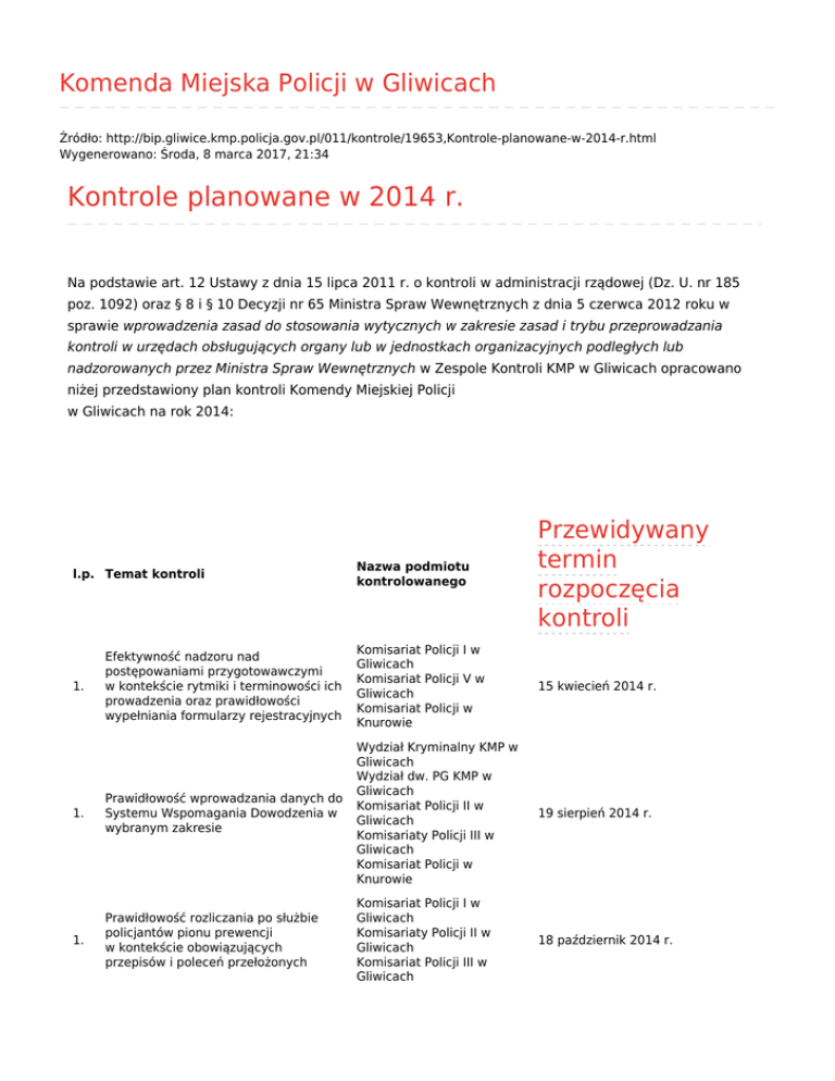 Kontrole planowane w 2014 r. - Komenda Miejska Policji w Gliwicach