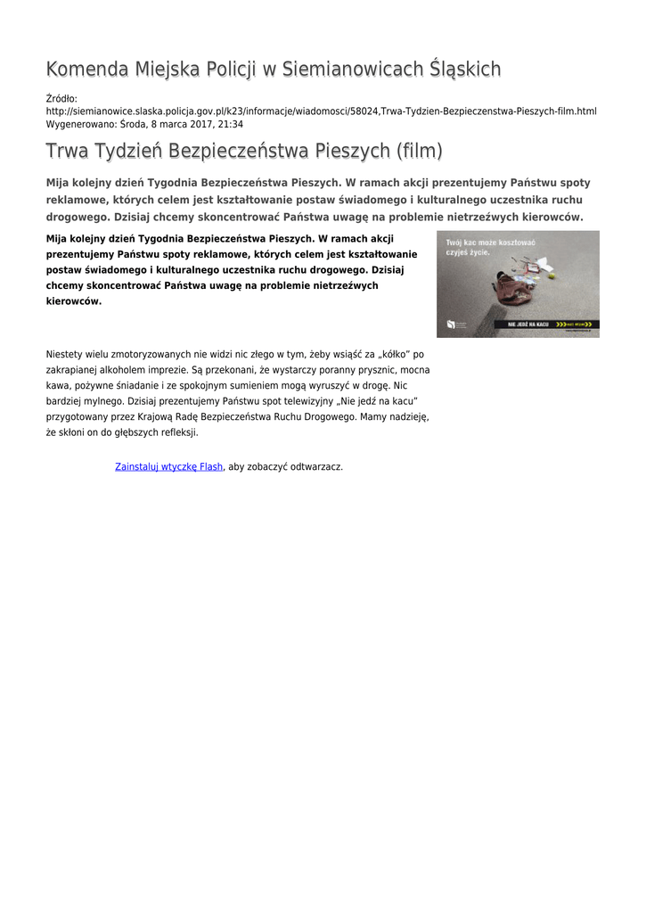 Komenda Miejska Policji w Siemianowicach Śląskich Źródło: http://siemianowice.slaska.policja.gov.pl/k23/informacje/wiadomosci/58024,Trwa-Tydzien-Bezpieczenstwa-Pieszych-film.html Wygenerowano: Środa, 8 marca 2017, 21:34 Trwa Tydzień Bezpieczeństwa Pieszych (film) Mija kolejny dzień Tygodnia Bezpieczeństwa Pieszych. W ramach akcji prezentujemy Państwu spoty reklamowe, których celem jest kształtowanie postaw świadomego i kulturalnego uczestnika ruchu drogowego. Dzisiaj chcemy skoncentrować Państwa uwagę na problemie nietrzeźwych kierowców. Mija kolejny dzień Tygodnia Bezpieczeństwa Pieszych. W ramach akcji prezentujemy Państwu spoty reklamowe, których celem jest kształtowanie postaw świadomego i kulturalnego uczestnika ruchu drogowego. Dzisiaj chcemy skoncentrować Państwa uwagę na problemie nietrzeźwych kierowców. Niestety wielu zmotoryzowanych nie widzi nic złego w tym, żeby wsiąść za „kółko” po zakrapianej alkoholem imprezie. Są przekonani, że wystarczy poranny prysznic, mocna kawa, pożywne śniadanie i ze spokojnym sumieniem mogą wyruszyć w drogę. Nic bardziej mylnego. Dzisiaj prezentujemy Państwu spot telewizyjny „Nie jedź na kacu” przygotowany przez Krajową Radę Bezpieczeństwa Ruchu Drogowego. Mamy nadzieję, że skłoni on do głębszych refleksji. Zainstaluj wtyczkę Flash, aby zobaczyć odtwarzacz. pobierz film - 2.94 MB Ocena: 0/5 (0) Tweetnij
