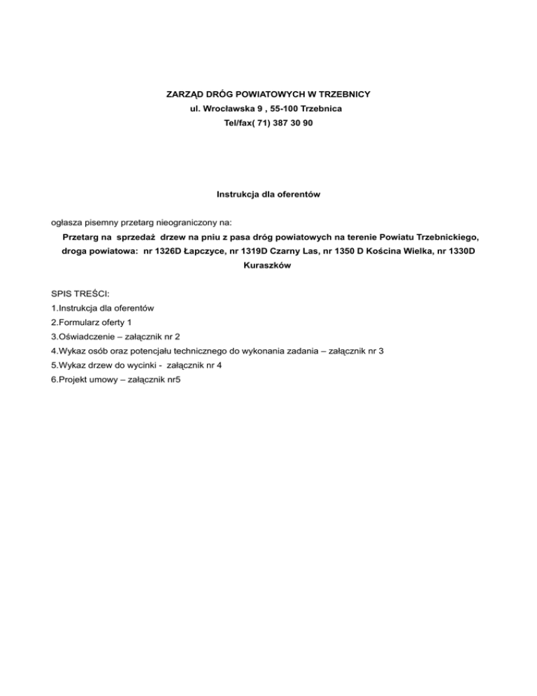 ZARZĄD DRÓG POWIATOWYCH W TRZEBNICY ul. Wrocławska 9 , 55-100 Trzebnica Tel/fax( 71) 387 30 90 Instrukcja dla oferentów ogłasza pisemny przetarg nieograniczony na: Przetarg na sprzedaż drzew na pniu z pasa dróg powiatowych na terenie Powiatu Trzebnickiego, droga powiatowa: nr 1326D Łapczyce, nr 1319D Czarny Las, nr 1350 D Kościna Wielka, nr 1330D Kuraszków SPIS TREŚCI: 1.Instrukcja dla oferentów 2.Formularz oferty 1 3.Oświadczenie – załącznik nr 2 4.Wykaz osób oraz potencjału technicznego do wykonania zadania – załącznik nr 3 5.Wykaz drzew do wycinki - załącznik nr 4 6.Projekt umowy – załącznik nr5 Trzebnica dnia 15.02.2016r. INSTRUKCJA DLA OFERENTÓW Zarząd Dróg Powiatowych w Trzebnicy, ul. Wrocławska 9, 55-100 Trzebnica Tel/Fax: (71) 387 30 90,zaprasza na udział w przetargu na: Przetarg na sprzedaż drzew na pniu z pasa dróg powiatowych na terenie Powiatu Trzebnickiego, droga powiatowa nr 1326D Łapczyce, nr 1319D Czarny Las, nr 1350 D Kościna Wielka, nr 1330D Kuraszków 1.TRYB UDZIELENIA ZAMÓWIENIA 1.1.Niniejsze postępowanie prowadzone jest zgodnie z Regulaminem Przetargu pisemnego nieograniczonego na „sprzedaż drzew na pniu” rosnących w pasie drogowym dróg powiatowych w Powiecie Trzebnickim, będącym załącznikiem do Uchwały nr 126/12 Zarządu Powiatu Trzebnickiego z dnia 03.10.2012r. w sprawie upoważnienia Dyrektora Zarządu Dróg Powiatowych w Trzebnicy do sprzedaży drzew na pniu rosnących w pasie dróg powiatowych. 2. OPIS PRZEDMIOTU PRZETARGU 2.1. Przedmiotem przetargu jest sprzedaż drzew (ze względu na stan zdrowotny, zakwalifikowane jako drzewo opałowe) rosnących w pasach drogowych dróg powiatowych zarządzanych przez Zarząd Dróg Powiatowych w Trzebnicy. Szacunkowa ilość pozyskanego drewna to 44,66 m3. Wartość sprzedaży dla wszystkich części 2 652,80 złote brutto słownie: dwa tysiące sześćset pięćdziesiąt dwa 80/100 Tabela 2.2 Szacunkowa ilość L.p pozyskanego Termin realizacji wycinki Rodzaj drzewa drewna m3 Ilość sztuk do wycinki Łapczyce- Gmina Żmigród, 1 2 3 20,04 Do 15.04.2016r. Lipa 11 szt. Czarny Las- Gmina Żmigród, droga powiatowa nr 1319D 3,88 Do 15.04.2016r Dąb, Olcha 2 szt. Wilkowa - Gmina Prusice, droga powiatowa numer 1330D 11,29 Do 15.05.2016r Lipa 7 szt. 1,46 Do 15.05.2016r Lipa 1szt. 5,95 Do 15.05.2016r Lipa 4szt. 2,04 Do 15.05.2016r Akacja, Klon, 14szt. droga powiatowa numer 1326D 4 Krościna Wielka - Gmina Prusice, droga powiatowa numer 1350D Kuraszków – Gmina Oborniki 5 Śląskie, droga powiatowa numer 1330D ul. Spacerowa w miejscowości 6 Kryniczno –Gmina Wisznia Mała Jesion 2.3. Kupujący wycina wszystkie drzewa na wszystkich odcinkach dróg ( bez możliwości podziału części) na własny koszt i odbiera własnym transportem (z własnym załadunkiem) z miejsca pozyskania. Lokalizację, numerację, ilość, średnicę, określa załącznik nr 4 do niniejszej Instrukcji. 2.4. Podana w szczegółowym wykazie drzew ilość m3 drzew zawarta w załączniku nr 4 jest wartością szacunkową i w przypadku stwierdzenia ich różnic po wycince nie może być przedmiotem zamiany ceny zaoferowanej przez Kupującego. 2.5. Każdy Oferent przed złożeniem oferty ma obowiązek na własną odpowiedzialność i ryzyko dokonać oględzin przedmiotu sprzedaży i dokonać własnych ob miarów w celu przygotowania swojej oferty przetargowej. 2.6. Zakres prac obejmuje: –oznakowanie i zabezpieczenie miejsca prowadzonej wycinki pod względem BHP i bezpieczeństwa ruchu –ścięcie drzewa –wywóz gałęzi –oczyszczenie terenu z pozostałości po ścince –frezowanie pni w miejscach wyznaczonych (§5 ust.6 umowy ) –wycinka krzaków będących w obrębie wycinanych drzew 3. WYMAGANY TERMIN WYKONANIA ZAMÓWIENIA 3.1. Termin rozpoczęcia wykonywania zamówienia następuje z dniem podpisania przez Sprzedającego umowy. 3.2. Terminy wycinki drzew do dnia 30.03.2016r. dla wszystkich części 3.3 Termin uporządkowania terenu po wycince dla wszystkich części od 1- 5 do dnia 10.04.2016r. 4. WADIUM 4.1. Wadium nie jest wymagane 5.INFORMACJE O SPOSOBIE POROZUMIEWANIA SIĘ SPRZEDAJĄCEGO Z KUPUJĄCYMI 5.1.Kupujący ze sprzedającym mogą porozumiewać pisemnie telefonicznie, (71) 38 73 090 lub pisemnie. Osobą uprawnioną do kontaktów z oferentami jest: Agnieszka Grzelińska od poniedziałku do piątku w godzinach 7.00 -15.00 5.2.Wnioski, zawiadomienia oraz informacje do czasu otwarcia ofert Sprzedający i Kupujący przekazują pisemnie; drogą elektroniczną 5.3.W toku badania i oceny ofert Sprzedający może żądać od Kupujących wyjaśnień, dotyczących treści złożonych ofert. 6. OPIS SPOSOBU PRZYGOTOWANIA OFERTY 6.1.Ofertę należy przygotować na formularzu ofertowym stanowiącym załączniki nr 1 6.2.Do oferty Kupujący dołączy wszystkie dokumenty wymagane w pkt. 7 niniejszej Instrukcji. 6.3.Oferent przed przygotowaniem oferty ma obowiązek obejrzeć wszystkie oferowane do sprzedaży drzewa. 6.4.W sprawach związanych z przetargiem uprawniony do kontaktów z oferentami jest pracownik Zarządu Dróg Powiatowych w Trzebnicy , Agnieszka Grzelińska tel. (71) 3873090 od poniedziałku do piątku w godzinach od 7.00-15.00 6.5. Oferta powinna być sporządzona w języku polskim, z zachowaniem formy pisemnej pod rygorem nieważności, oznaczona nazwą i adresem oferenta oraz podpisana, łącznie z wszystkimi dokumentami i załącznikami. 6.6. Każdy Oferent może złożyć tylko jedną ofertę. 6.7. Oferta powinna być umieszczona w zamkniętej kopercie gwarantującej zachowanie poufności jej treści i zabezpieczającej jej nienaruszalność do terminu otwarcia ofert oraz oznakowana w sposób następujący: Przetarg na sprzedaż drzew na pniu z pasa dróg powiatowych na terenie Powiatu Trzebnickiego, droga powiatowa: nr 1326D Łapczyce, nr 1319D Czarny Las, nr 1350 D Kościna Wielka, nr 1330D Kuraszków ZDP w Trzebnicy ul. Wrocławska 9, 55-100 Trzebnica Nie otwierać przed dniem 01.03.