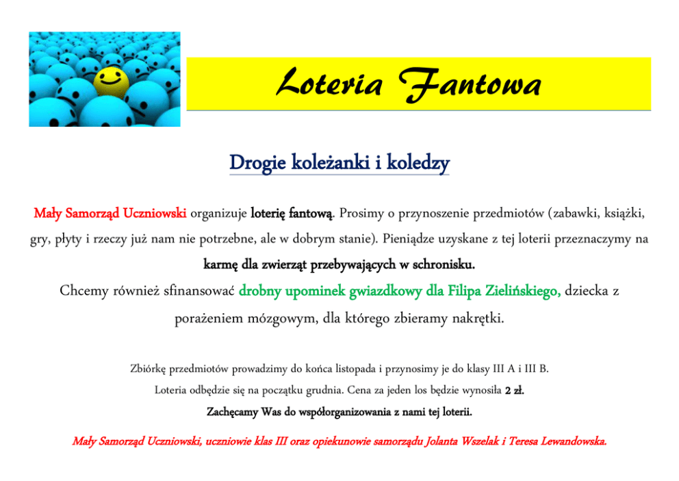 Loteria Fantowa Drogie koleżanki i koledzy Mały Samorząd Uczniowski organizuje loterię fantową. Prosimy o przynoszenie przedmiotów (zabawki, książki, gry, płyty i rzeczy już nam nie potrzebne, ale w dobrym stanie). Pieniądze uzyskane z tej loterii przeznaczymy na karmę dla zwierząt przebywających w schronisku. Chcemy również sfinansować drobny upominek gwiazdkowy dla Filipa Zielińskiego, dziecka z porażeniem mózgowym, dla którego zbieramy nakrętki. Zbiórkę przedmiotów prowadzimy do końca listopada i przynosimy je do klasy III A i III B. Loteria odbędzie się na początku grudnia. Cena za jeden los będzie wynosiła 2 zł. Zachęcamy Was do współorganizowania z nami tej loterii. Mały Samorząd Uczniowski, uczniowie klas III oraz opiekunowie samorządu Jolanta Wszelak i Teresa Lewandowska.