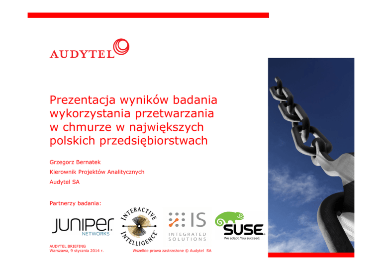 Prezentacja wyników badania wykorzystania przetwarzania w chmurze w największych polskich przedsiębiorstwach Grzegorz Bernatek Kierownik Projektów Analitycznych Audytel SA Partnerzy badania: AUDYTEL BRIEFING Warszawa, 9 stycznia 2014 r. Wszelkie prawa zastrzeżone © Audytel SA Plan prezentacji • Metodyka badania • Charakterystyka badanej grupy organizacji • Wyniki i główne obserwacje Strategia przetwarzania w chmurze Wykorzystywane modele chmury Obecność i plany wykorzystania różnych form przetwarzania w chmurze Obawy i motywacje Ocena dostawców rozwiązań i usług cloud • Podsumowanie AUDYTEL BRIEFING Warszawa, 9 stycznia 2014 r. Wszelkie prawa zastrzeżone © Audytel SA 2 Badanie Audytela • Sprawdzona metodyka badawcza – Wykorzystanie metodyki Meta Group Inc – Kontynuacja projektów dotyczących outsourcingu ICT oraz bezpieczeństwa IT – Porządkuje infrastrukturę i funkcje ICT według wartości dodanej. • Wysokiej jakości baza respondentów – Dyrektorzy działów i departamentów IT, – Dyrektorzy Techniczni / Operacyjni, – Kierownicy IT największych polskich organizacji. • Partnerzy merytoryczni – Juniper – Integrated Solutions – Interactive Intelligence – Novell AUDYTEL BRIEFING Warszawa, 9 stycznia 2014 r. Wszelkie prawa zastrzeżone © Audytel SA 3 Struktura badanej grupy Statystyka z przychodów badanych organizacji w 2012 r. Statystyka z branż AUDYTEL BRIEFING Warszawa, 9 stycznia 2014 r. Wszelkie prawa zastrzeżone © Audytel SA • Średni przychód w bazie badanych organizacji przekraczał 5 mld zł rocznie. • Prawię połowę ankietowanych stanowiły organizacje, których przychody nie przekraczały 500 mln zł rocznie. • Średni przychód w tym segmencie wynosił ok 110 mln zł. • Największą grupę ankietowanych stanowiły firmy produkcyjne oraz z sektora utilities. • Łącznie w pogłębionych analizach uwzględniono 56 organizacji. 4 Respondenci Stanowiska osób udzielających odpowiedzi w badaniu • Prawie połowę wywiadów przeprowadzono z kadrą dyrektorską, głównie działów IT. • Co piąty ankietowany był Kierownikiem działu IT. • Najwięcej ankietowanych firm (40%) zatrudniało od 1 do 5 tys. pracowników (średnio 2,4 tys.). • Zatrudnianie powyżej 5 tys. pracowników zadeklarowało 7,3% organizacji (średnio 11,3 tys. osób). • W dziale IT pracowało średnio 60 osób, w dziale telekomunikacji - 3 osoby. Statystyka z zatrudnienia AUDYTEL BRIEFING Warszawa, 9 stycznia 2014 r. Wszelkie prawa zastrzeżone © Audytel SA 5 Wyposażenie IT Średnia liczba urządzeń abonenckich i systemów serwerowych w badanych organizacjach Kategoria Co czwarta wykorzystywana aplikacja dostarczana jest w modelu chmurowym. • Średnia powierzchnia wykorzystywanej powierzchni datacenter przekracza 200 m2, z czego 30 m2 kupowanych jest u wyspecjalizowanych dostawców usług kolokacji. Średnia Komputery typu desktop 1 377 Notebooki 992 Terminale wirtualne (np. Citrix) 126 Tablety / palmtopy (z dostępem do firmowych danych i/lub aplikacji) 339 Smartfony (z dostępem do firmowych danych i/lub aplikacji) 242 Serwery (wirtualne i fizyczne) 311 AUDYTEL BRIEFING Warszawa, 9 stycznia 2014 r. • Wszelkie prawa zastrzeżone © Audytel SA 6 Strategia przetwarzania w chmurze Odsetek organizacji deklarujących utrzymywanie sformalizowanej dokumentacji AUDYTEL BRIEFING Warszawa, 9 stycznia 2014 r. Wszelkie prawa zastrzeżone © Audytel SA • Tylko co dwudziesta z ankietowanych organizacji miała sformalizowaną strategię przetwarzanie w chmurze. • Co 5 firma analizowała koszty i korzyści wdrożenia architektury chmurowej (zwykle firmy takie decydowały się potem na jej zastosowanie). • Taki sam odsetek firm monitoruje ryzyka związane z przetwarzaniem w chmurze. 7 Model chmury Odsetek organizacji wykorzystujących dany model realizacji przetwarzania w chmurze • Przeważającym modelem realizacji chmury jest chmura prywatna. • W korzystaniu z chmury prywatnej dominuje model „zrób to sam”. • Wykorzystanie usług w chmurze publicznej jest bardzo małe. Pytanie: jaki jest podstawowy model realizacji chmury w Państwa organizacji? Podstawa: wszystkie analizowane organizacje AUDYTEL BRIEFING Warszawa, 9 stycznia 2014 r. Wszelkie prawa zastrzeżone © Audytel SA 8 Obecność i plany wykorzystania różnych form przetwarzania w chmurze (1) Obecność i plany wykorzystania typów rozwiązań chmurowych (odsetek organizacji) • Najbardziej popularnym elementem przetwarzania w chmurze są wirtualne maszyny / serwery - ich wykorzystanie deklaruje co trzeci ankietowany • W swoich planach respondenci najczęściej wskazywali rozwiązania związane z komunikacją (CaaS, ang. Communications as a Service) oraz zarządzaniem obiegiem informacji i dokumentów w organizacji – co 10 ankietowany, który wcześniej nie korzystał dotychczas z cloud. Pytanie: jakie typy przetwarzania w chmurze wykorzystywane są w Państwa organizacji? Podstawa: wszystkie analizowane organizacje AUDYTEL BRIEFING Warszawa, 9 stycznia 2014 r. Wszelkie prawa zastrzeżone © Audytel SA 9 Obecność i plany wykorzystania różnych form przetwarzania w chmurze (2) Liczba wykorzystywanych usług przetwarzania w chmurze (odsetek organizacji) • 30% badanych organizacji wykorzystuje więcej niż 5 rozwiązań (systemowych lub aplikacji) z zakresu przetwarzania w chmurze • Organizacje oczekują po wdrożeniu przetwarzania w chmurze oszczędności na poziomie 20% w stosunku do dotychczasowych kosztów. • Realnie udaj się te plany zrealizować tylko w połowie. Pytanie: jakie typy przetwarzania w chmurze wykorzystywane są w Państwa organizacji? Podstawa: wszystkie analizowane organizacje AUDYTEL BRIEFING Warszawa, 9 stycznia 2014 r. Wszelkie prawa zastrzeżone © Audytel SA 10 Motywacje do wykorzystania cloud computingu Średnia ocena motywacji • Główne motywacje dotyczące wdrożenia cloud w organizacjach związane są z oszczędnością 