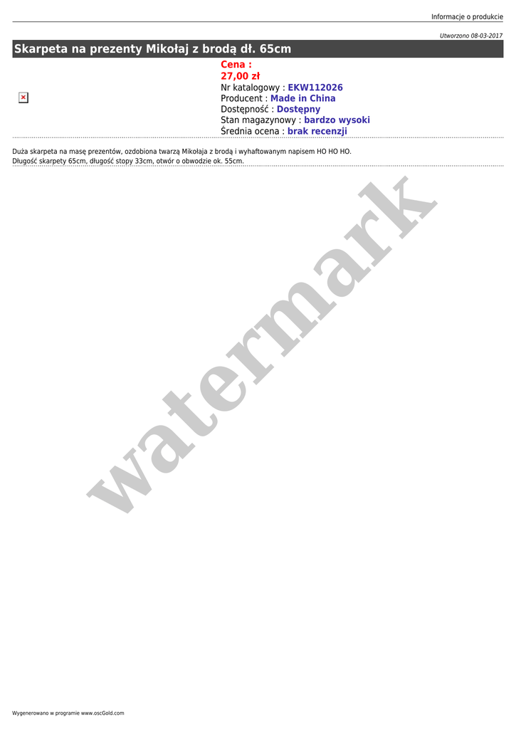 Informacje o produkcie Utworzono 08-03-2017 Skarpeta na prezenty Mikołaj z brodą dł. 65cm Cena : 27,00 zł Nr katalogowy : EKW112026 Producent : Made in China Dostępność : Dostępny Stan magazynowy : bardzo wysoki Średnia ocena : brak recenzji w at er m ar k Duża skarpeta na masę prezentów, ozdobiona twarzą Mikołaja z brodą i wyhaftowanym napisem HO HO HO. Długość skarpety 65cm, długość stopy 33cm, otwór o obwodzie ok. 55cm. Wygenerowano w programie www.oscGold.com