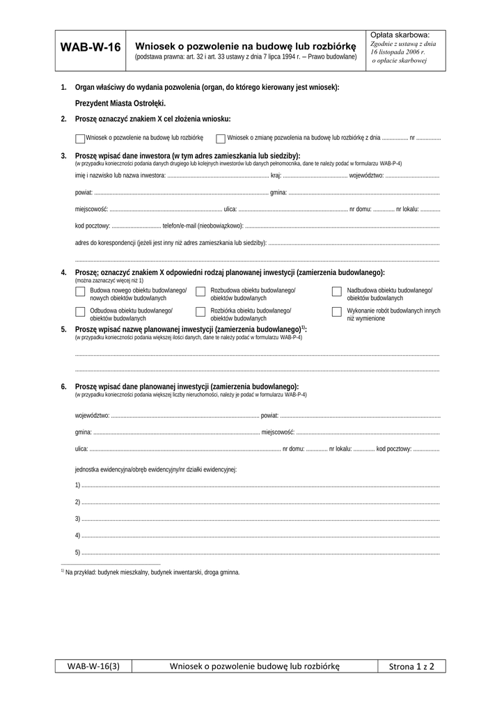 Opłata skarbowa: WAB-W-16 1. Wniosek o pozwolenie na budowę lub rozbiórkę (podstawa prawna: art. 32 i art. 33 ustawy z dnia 7 lipca 1994 r. ‒ Prawo budowlane) Zgodnie z ustawą z dnia 16 listopada 2006 r. o opłacie skarbowej Organ właściwy do wydania pozwolenia (organ, do którego kierowany jest wniosek): Prezydent Miasta Ostrołęki. 2. Proszę oznaczyć znakiem X cel złożenia wniosku: Wniosek o pozwolenie na budowę lub rozbiórkę 3. Wniosek o zmianę pozwolenia na budowę lub rozbiórkę z dnia ................. nr ................ Proszę wpisać dane inwestora (w tym adres zamieszkania lub siedziby): (w przypadku konieczności podania danych drugiego lub kolejnych inwestorów lub danych pełnomocnika, dane te należy podać w formularzu WAB-P-4) imię i nazwisko lub nazwa inwestora: .................................................................. kraj: .......................................... województwo: ................................... powiat: ................................................................................................................. gmina: .................................................................................................. miejscowość: ......................................................................... ulica: ....................................................................... nr domu: .............. nr lokalu: ............. kod pocztowy: ................................ telefon/e-mail (nieobowiązkowo): .............................................................................................................................. adres do korespondencji (jeżeli jest inny niż adres zamieszkania lub siedziby): ............................................................................................................... ............................................................................................................................................................................................................................................ 4. Proszę; oznaczyć znakiem X odpowiedni rodzaj planowanej inwestycji (zamierzenia budowlanego): (można zaznaczyć więcej niż 1) 5. Budowa nowego obiektu budowlanego/ nowych obiektów budowlanych Rozbudowa obiektu budowlanego/ obiektów budowlanych Nadbudowa obiektu budowlanego/ obiektów budowlanych Odbudowa obiektu budowlanego/ obiektów budowlanych Rozbiórka obiektu budowlanego/ obiektów budowlanych Wykonanie robót budowlanych innych niż wymienione Proszę wpisać nazwę planowanej inwestycji (zamierzenia budowlanego)1): (w przypadku konieczności podania większej ilości danych, dane te należy podać w formularzu WAB-P-4) ............................................................................................................................................................................................................................................ ............................................................................................................................................................................................................................................ 6. Proszę wpisać dane planowanej inwestycji (zamierzenia budowlanego): (w przypadku konieczności podania większej liczby nieruchomości, należy je podać w formularzu WAB-P-4) województwo: ................................................................................................ powiat: ........................................................................................................ gmina: ............................................................................................................ miejscowość: ............................................................................................. ulica: ............................................................................................................................ nr domu: .............. nr lokalu: .............. kod pocztowy: ................. jednostka ewidencyjna/obręb ewidencyjny/nr działki ewidencyjnej: 1) ........................................................................................................................................................................................................................................ 2) ........................................................................................................................................................................................................................................ 3) ........................................................................................................................................................................................................................................ 4) ........................................................................................................................................................................................................................................ 5) ........................................................................................................................................................................................................................................ ________________________________________________________ 1) Na przykład: budynek mieszkalny, budynek inwentarski, droga gminna. WAB-W-16(3) Wniosek o pozwolenie budowę lub rozbiórkę Strona 1 z 2 7. Proszę wskazać załączniki do wniosku: (w przypadku konieczności wskazania większej liczby załączników, dane te należy podać w formularzu WAB-P-4) 1) ................................................................................................................................................................................................................................... 2) ........................................................................................................................................