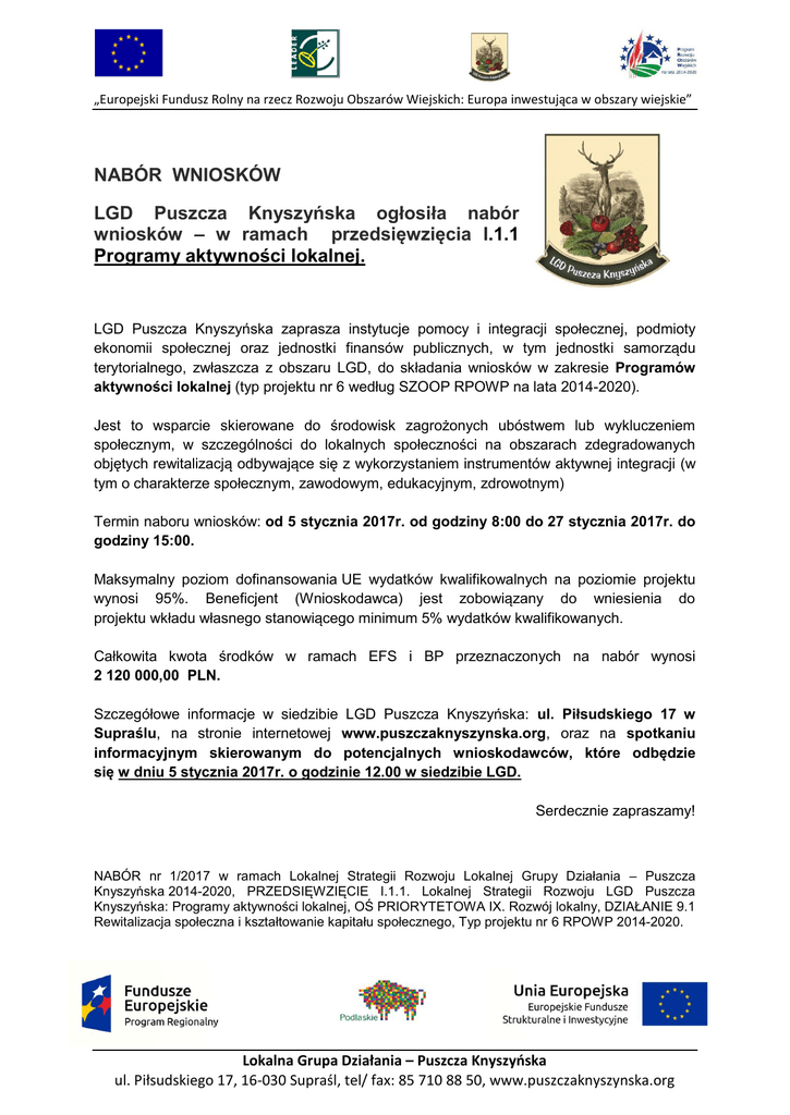 „Europejski Fundusz Rolny na rzecz Rozwoju Obszarów Wiejskich: Europa inwestująca w obszary wiejskie” NABÓR WNIOSKÓW LGD Puszcza Knyszyńska ogłosiła nabór wniosków – w ramach przedsięwzięcia I.1.1 Programy aktywności lokalnej. LGD Puszcza Knyszyńska zaprasza instytucje pomocy i integracji społecznej, podmioty ekonomii społecznej oraz jednostki finansów publicznych, w tym jednostki samorządu terytorialnego, zwłaszcza z obszaru LGD, do składania wniosków w zakresie Programów aktywności lokalnej (typ projektu nr 6 według SZOOP RPOWP na lata 2014-2020). Jest to wsparcie skierowane do środowisk zagrożonych ubóstwem lub wykluczeniem społecznym, w szczególności do lokalnych społeczności na obszarach zdegradowanych objętych rewitalizacją odbywające się z wykorzystaniem instrumentów aktywnej integracji (w tym o charakterze społecznym, zawodowym, edukacyjnym, zdrowotnym) Termin naboru wniosków: od 5 stycznia 2017r. od godziny 8:00 do 27 stycznia 2017r. do godziny 15:00. Maksymalny poziom dofinansowania UE wydatków kwalifikowalnych na poziomie projektu wynosi 95%. Beneficjent (Wnioskodawca) jest zobowiązany do wniesienia do projektu wkładu własnego stanowiącego minimum 5% wydatków kwalifikowanych. Całkowita kwota środków w ramach EFS i BP przeznaczonych na nabór wynosi 2 120 000,00 PLN. Szczegółowe informacje w siedzibie LGD Puszcza Knyszyńska: ul. Piłsudskiego 17 w Supraślu, na stronie internetowej www.puszczaknyszynska.org, oraz na spotkaniu informacyjnym skierowanym do potencjalnych wnioskodawców, które odbędzie się w dniu 5 stycznia 2017r. o godzinie 12.00 w siedzibie LGD. Serdecznie zapraszamy! NABÓR nr 1/2017 w ramach Lokalnej Strategii Rozwoju Lokalnej Grupy Działania – Puszcza Knyszyńska 2014-2020, PRZEDSIĘWZIĘCIE I.1.1. Lokalnej Strategii Rozwoju LGD Puszcza Knyszyńska: Programy aktywności lokalnej, OŚ PRIORYTETOWA IX. Rozwój lokalny, DZIAŁANIE 9.1 Rewitalizacja społeczna i kształtowanie kapitału społecznego, Typ projektu nr 6 RPOWP 2014-2020. Lokalna Grupa Działania – Puszcza Knyszyńska ul. Piłsudskiego 17, 16-030 Supraśl, tel/ fax: 85 710 88 50, www.puszczaknyszynska.org