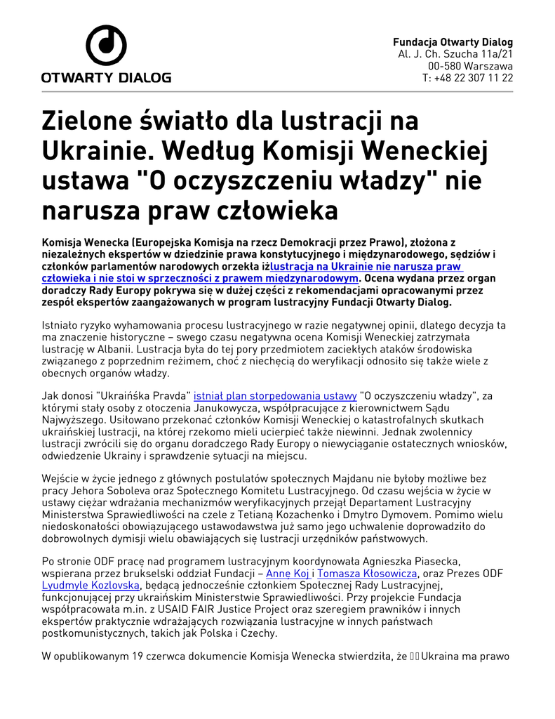 Fundacja Otwarty Dialog Al. J. Ch. Szucha 11a/21 00-580 Warszawa T: +48 22 307 11 22 Zielone światło dla lustracji na Ukrainie. Według Komisji Weneckiej ustawa "O oczyszczeniu władzy" nie narusza praw człowieka Komisja Wenecka (Europejska Komisja na rzecz Demokracji przez Prawo), złożona z niezależnych ekspertów w dziedzinie prawa konstytucyjnego i międzynarodowego, sędziów i członków parlamentów narodowych orzekła iżlustracja na Ukrainie nie narusza praw człowieka i nie stoi w sprzeczności z prawem międzynarodowym. Ocena wydana przez organ doradczy Rady Europy pokrywa się w dużej części z rekomendacjami opracowanymi przez zespół ekspertów zaangażowanych w program lustracyjny Fundacji Otwarty Dialog. Istniało ryzyko wyhamowania procesu lustracyjnego w razie negatywnej opinii, dlatego decyzja ta ma znaczenie historyczne – swego czasu negatywna ocena Komisji Weneckiej zatrzymała lustrację w Albanii. Lustracja była do tej pory przedmiotem zaciekłych ataków środowiska związanego z poprzednim reżimem, choć z niechęcią do weryfikacji odnosiło się także wiele z obecnych organów władzy. Jak donosi "Ukraińśka Pravda" istniał plan storpedowania ustawy "O oczyszczeniu władzy", za którymi stały osoby z otoczenia Janukowycza, współpracujące z kierownictwem Sądu Najwyższego. Usiłowano przekonać członków Komisji Weneckiej o katastrofalnych skutkach ukraińskiej lustracji, na której rzekomo mieli ucierpieć także niewinni. Jednak zwolennicy lustracji zwrócili się do organu doradczego Rady Europy o niewyciąganie ostatecznych wniosków, odwiedzenie Ukrainy i sprawdzenie sytuacji na miejscu. Wejście w życie jednego z głównych postulatów społecznych Majdanu nie byłoby możliwe bez pracy Jehora Soboleva oraz Społecznego Komitetu Lustracyjnego. Od czasu wejścia w życie w ustawy ciężar wdrażania mechanizmów weryfikacyjnych przejął Departament Lustracyjny Ministerstwa Sprawiedliwości na czele z Tetianą Kozachenko i Dmytro Dymovem. Pomimo wielu niedoskonałości obowiązującego ustawodawstwa już samo jego uchwalenie doprowadziło do dobrowolnych dymisji wielu obawiających się lustracji urzędników państwowych. Po stronie ODF pracę nad programem lustracyjnym koordynowała Agnieszka Piasecka, wspierana przez brukselski oddział Fundacji – Annę Koj i Tomasza Kłosowicza, oraz Prezes ODF Lyudmylę Kozlovską, będącą jednocześnie członkiem Społecznej Rady Lustracyjnej, funkcjonującej przy ukraińskim Ministerstwie Sprawiedliwości. Przy projekcie Fundacja współpracowała m.in. z USAID FAIR Justice Project oraz szeregiem prawników i innych ekspertów praktycznie wdrażających rozwiązania lustracyjne w innych państwach postkomunistycznych, takich jak Polska i Czechy. W opublikowanym 19 czerwca dokumencie Komisja Wenecka stwierdziła, że Ukraina ma prawo do wykorzystywania tzw. "automatycznych" kryteriów uchwały, które nakazują zwolnienia urzędników reżimu Janukowycza oraz tych, sprawujących swoje stanowiska w czasie wydania rozkazu spacyfikowania protestu na Majdanie. Jednocześnie stwierdzono, że lustracja nie narusza praw człowieka, gdyż państwo demokratyczne ma prawo wymagać od urzędników, aby ci byli lojalni wobec konstytucyjnych zasad, na których ono się opiera. Uznano też, że dokument różni się od przepisów lustracyjnych przyjętych w innych krajach Europy Środkowo-Wschodniej szerszym zakresem zastosowania ustawy i ma dwa różne cele. Pierwszy – ochrona społeczeństwa przed osobami, które ze względu na swoje wcześniejsze działania mogą zaszkodzić nowopowstałemu systemowi demokratycznemu. Drugi – oczyszczenie organów państwowych z osób, które brały udział w korupcji na wielką skalę. Termin "lustracja" w tradycyjnym znaczeniu obejmuje tylko ten pierwszy proces. Komisja Wenecka uznała przy tym, że dwa cele, realizowane przez ustawę "O oczyszczeniu władzy", są zgodne z prawem. Co więcej członkowie Komisji przyznali ukraińskim władzom prawo wymagania od kandydatów na stanowiska państwowe poinformowania wyborców, czy odpowiadają oni "oczyszczającym" kryteriom. Podczas rozmów z władzami Ukrainy i społeczeństwem obywatelskim Komisja Wenecka dowiedziała się także o problemie odwlekania wielu spraw sądowych w czasie. Na tej podstawie w dokumencie postanowiono umieścić zapis o tym, że sędziowie, którzy hamują postępowanie sądowe dotyczące lustracji, utrudniają skuteczną realizację ustawy, a Trybunał Konstytucyjny również musi przechodzić weryfikację. Jednakże Komisja nadal zwraca uwagę na szereg niedoskonałości w ustawie, które szczegółowo wymienia we wnioskach końcowych. Zaleca m.in. wyodrębnienie sędziów sądów powszechnych i przekazanie ich weryfikacji w całości w kompetencje ustawy "O odnowieniu zaufania do wymiaru sprawiedliwości", a także uszczegółowienie kryteriów i procedur lustracji majątkowej, co miałoby zapobiec nadużyciom. Zobacz dokument końcowy wydany przez Komisję Wenecką facebook.com/OpenDialogFoundation | [email protected] | www.odfoundation.eu