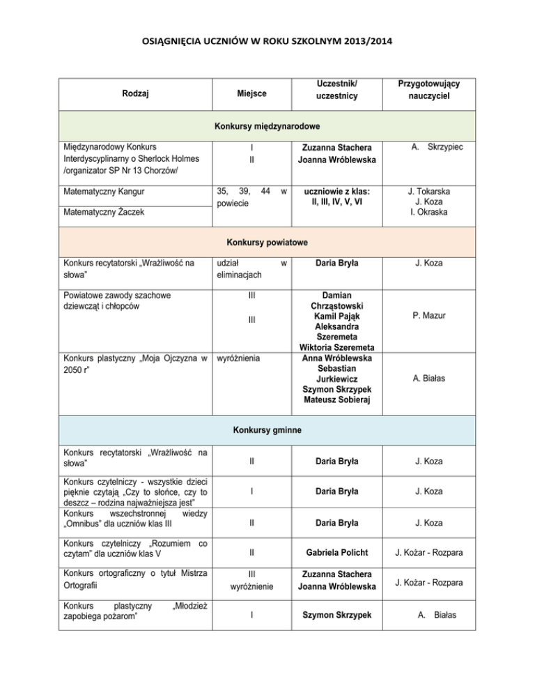 OSIĄGNIĘCIA UCZNIÓW W ROKU SZKOLNYM 2013/2014 Rodzaj Uczestnik/ uczestnicy Miejsce Przygotowujący nauczyciel Konkursy międzynarodowe Międzynarodowy Konkurs Interdyscyplinarny o Sherlock Holmes /organizator SP Nr 13 Chorzów/ I II 35, 39, powiecie Matematyczny Kangur Matematyczny Żaczek Zuzanna Stachera Joanna Wróblewska 44 w uczniowie z klas: II, III, IV, V, VI A. Skrzypiec J. Tokarska J. Koza I. Okraska Konkursy powiatowe Konkurs recytatorski „Wrażliwość na słowa” Powiatowe zawody szachowe dziewcząt i chłopców udział eliminacjach III III Konkurs plastyczny „Moja Ojczyzna w wyróżnienia 2050 r” w Daria Bryła Damian Chrząstowski Kamil Pająk Aleksandra Szeremeta Wiktoria Szeremeta Anna Wróblewska Sebastian Jurkiewicz Szymon Skrzypek Mateusz Sobieraj J. Koza P. Mazur A. Białas Konkursy gminne Konkurs recytatorski „Wrażliwość na słowa” II Daria Bryła J. Koza Konkurs czytelniczy - wszystkie dzieci pięknie czytają „Czy to słońce, czy to deszcz – rodzina najważniejsza jest” Konkurs wszechstronnej wiedzy „Omnibus” dla uczniów klas III I Daria Bryła J. Koza II Daria Bryła J. Koza Konkurs czytelniczy „Rozumiem co czytam” dla uczniów klas V II Gabriela Policht J. Kożar - Rozpara Konkurs ortograficzny o tytuł Mistrza Ortografii III wyróżnienie Zuzanna Stachera Joanna Wróblewska J. Kożar - Rozpara I Szymon Skrzypek Konkurs plastyczny zapobiega pożarom” „Młodzież A. Białas XIII Przegląd Kolęd i Pastorałek II Zawody szachowe dziewcząt i chłopców I I Zawody w koszykówce kat. chłopcy I Sandra Kamińska Julia Jaworska Aleksandra Szeremeta Julia Gołębiowska Martyna Kiciak Maja Łakomy Julia Olawa Natalia Olawa Daria Rybak Julia Szkleniarz Joanna Wróblewska Wiktoria Szeremeta Wiktoria Klećko Damian Chrząstowski Kamil Pająk Aleksandra Szeremeta Wiktoria Szeremeta Damian Chrząstowski Kamil Pająk Adam Pajor Przemysław Matera E. Gocyla-Dusza A. Białas P. Mazur P. Mazur Konkursy, przeglądy, zawody szkolne Konkurs czytelniczy o życiu i twórczości Juliana Tuwima Konkurs poetycki SU „Dla Ciebie mamo” Turniej wiedzy o Unii Europejskiej Konkurs Samorządu Uczniowskiego „Kolorowy Dzień” Konkurs na najciekawszy kostium halloweenowy I II III I Joanna Wróblewska Weronika Czubała Gabriela Policht Julia Szkleniarz wyróżnienia Sandra Kamińska Patrycja Bartnik Aleksandra Szeremeta Wiktoria Szeremeta Daria Rybak Klaudia Szwed Justyna Olawa drużyna klasy V I I II III Konkurs na najciekawszy kostium karnawałowy Konkurs plastyczny – Rzeźba z dyni I I II III klasa V Martyna Gaweł Maja Łakomy Bartek Konieczniak Gabriela Policht Łukasz Matera Julia Jaworska Daria Bryła Szymon Skrzypek Marta Dziechciarz Kamil Pająk Nadia Lange Ola i Wika Szeremeta A. Słuja-Kropiewnicka E. Gocyla-Dusza A. Skrzypiec E. Gocyla-Dusza A. Skrzypiec A. Białas J. Koza A. Skrzypiec Mateusz Sobieraj Julia Szkleniarz Konkurs plastyczny Pluszowego Misia” „Portret Konkurs plastyczny „Papież Jan Paweł II w oczach dzieci” I II III wyróżnienia wyróżnieni wszyscy uczestnicy Roksana Niedopad Adam Fiodorow Karol Olawa Edyta Łętowska Daria Bryła Nadia Lange Patrycja Bartnik Maja Łakomy Wiktoria Szeremeta Aleksandra Szeremeta Klaudia Szwed Joanna Wróblewska Sandra Kamińska Konkurs plastycznym „Piękno przyrody polskiej” I II III wyróżnienie Marta Dziechciarz Dominika Markowicz Sebastian Jurkiewicz Anna Wróblewska Roksana Niedopad Konkurs plastyczny SU „Na świętego Mikołaja czeka dzieci cała zgraja” wyróżnieni wszyscy uczestnicy Szymon Skrzypek Daria Rybak Roksana Niedopad Nadia Lange Anna Wróblewska Igor Kiciak Szymon Skrzypek Jurkiewicz Sebastian Anna Wróblewska Nadia Lange Dominika Markowicz Konkurs plastyczny barwach narodowych” „Kotylion w wyróżnienia A. Słuja-Kropiewnicka B. Luraniec J. Tokarska J. Koza ks. Marek Cuda A. Słuja-Kropiewnicka A. Białas J. Tokarska J. Koza E. Gocyla-Dusza J. Kozar-Rozpara A.Białas J.Koza Udział w wojewódzkim konkursie przedmiotowym z języka polskiego z elementami historii Weronika Czubała - 20 pkt. Przemysław Matera -17 pkt. Zuzanna Stachera - 17 pkt. Wiktoria Szeremeta - 13 pkt. Udział w wojewódzkim konkursie przedmiotowym z matematyki z elementami przyrody Przemysław Matera - 25 pkt. Gabriela Policht - 18 pkt. Joanna Wróblewska - 17 pkt. Julia Szkleniarz - 16 pkt. Zuzanna Stachera - 15 pkt. Wiktoria Szeremeta - 13 pkt. Martyna Kiciak - 8 pkt.