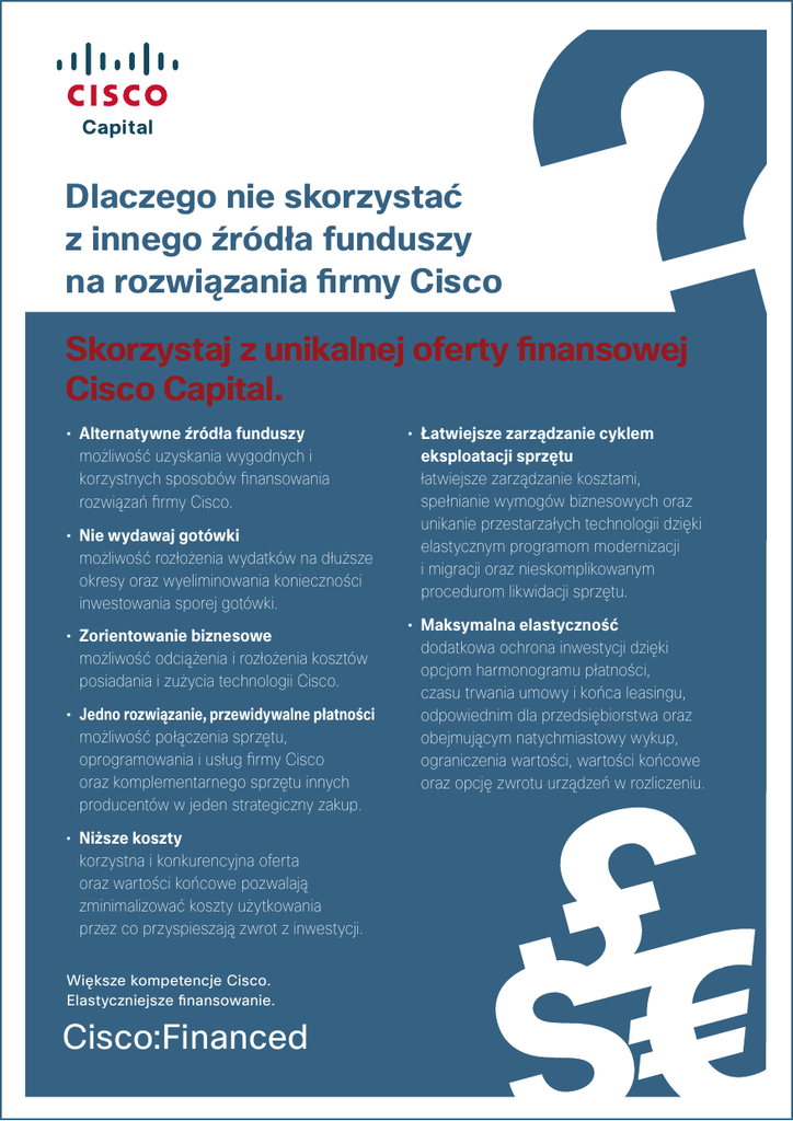 Dlaczego nie skorzystać z innego źródła funduszy na rozwiązania firmy Cisco ? Skorzystaj z unikalnej oferty finansowej Cisco Capital. • Alternatywne źródła funduszy możliwość uzyskania wygodnych i korzystnych sposobów finansowania rozwiązań firmy Cisco. • Nie wydawaj gotówki możliwość rozłożenia wydatków na dłuższe okresy oraz wyeliminowania konieczności inwestowania sporej gotówki. • Zorientowanie biznesowe możliwość odciążenia i rozłożenia kosztów posiadania i zużycia technologii Cisco. • Jedno rozwiązanie, przewidywalne płatności możliwość połączenia sprzętu, oprogramowania i usług firmy Cisco oraz komplementarnego sprzętu innych producentów w jeden strategiczny zakup. • Niższe koszty korzystna i konkurencyjna oferta oraz wartości końcowe pozwalają zminimalizować koszty użytkowania przez co przyspieszają zwrot z inwestycji. Większe kompetencje Cisco. Elastyczniejsze finansowanie. Cisco:Financed • Łatwiejsze zarządzanie cyklem eksploatacji sprzętu łatwiejsze zarządzanie kosztami, spełnianie wymogów biznesowych oraz unikanie przestarzałych technologii dzięki elastycznym programom modernizacji i migracji oraz nieskomplikowanym procedurom likwidacji sprzętu. • Maksymalna elastyczność dodatkowa ochrona inwestycji dzięki opcjom harmonogramu płatności, czasu trwania umowy i końca leasingu, odpowiednim dla przedsiębiorstwa oraz obejmującym natychmiastowy wykup, ograniczenia wartości, wartości końcowe oraz opcję zwrotu urządzeń w rozliczeniu. Dodatkowe korzyści Fachowa wiedza Cisco • korzyści z bezpośredniego dostępu do zasobów technicznych i kadrowych firmy Cisco. • korzyści z pozyskiwania technologii powiązanych z cyklami eksploatacji rozwiązań Cisco. • dostępność na całym świecie, dla wszystkich rozwiązań Cisco. Bardziej elastyczne opcje finansowania • skorzystaj z całej gamy elastycznych programów finansowania, w sam raz na Twoją kieszeń. • chroń swoje inwestycje dzięki elastycznym warunkom, strukturom płatności, migracji, odnawianiu sprzętu i warunkom zakończenia okresu leasingu. • wszystko dzięki elastyczności, która pozwala nabywać rozwiązania Cisco na warunkach dogodnych dla Twojej firmy. Strategiczne podejście do zakupów • naucz się wykorzystywać aktualny budżet oraz przyszłe, aby skutecznie osiągać cele biznesowe. • korzystaj z użytkowania technologii, a nie z faktu jej posiadania. • nasza wiedza z zakresu technologii Cisco oraz sposobów finansowania pozwoli Ci opracować strategię dotyczącą aktualnych oraz przyszłych inwestycji technologicznych. Wykorzystaj możliwości zespołu, który będzie pracować na Twój sukces www.cisco.com/go/ciscofinanced_europe Centrala dla krajów obu Ameryk Cisco Systems, Inc. 170 West Tasman Drive San Jose, CA95134-1706 USA www.cisco.com Tel: 408 526-4000 B00553-NETS(6387) Faks: 408 627-0883 Centrala dla krajów Azji i Pacyfiku Cisco Systems, Inc. 166 Robinson Road #28-01 Capitol Tower Singapur 068912 www.cisco.com Tel.: +85 6317 7777 Faks: +65 6317 7799 Centrala europejska Cisco Systems, International BV Haarierbergpark Haarierbergweg 13-19 1101CH Amsterdam Holandia www-eurape.cisco.com Tel.:+31 08000200791 Faks: +31 0 20 3671100 Firma Cisco ma ponad 200 biur na całym świecie. Pełną listę adresów, numerów telefonów oraz faksów można znaleźć w witrynie firmy Cisco pod adresem: www.cisco.com/go/offices. © 2008 Cisco Systems, Inc. Wszystkie prawa zastrzeżone. Nazwy i logotypy CCVP, Cisco i Cisco Square Bridge stanowią zastrzeżone znaki towarowe firmy Cisco Systems, lnc; Changing the Way We Work, Live, Play, and Learn stanowi znak usługowi firmy Cisco Systems, Inc.; Access Registrar, Aisronet, BPX, Catalyst, CCDA, CCDP, CCIE, CCIP, CCNA, CCNP, CCSP, Cisco, logo Cisco Certified Internetwork Expert, Cisco IOS, Cisco Systems, Cisco Systems Capital, logo Cisco Systems logo, Cisco Unity, Enterprise/Solver, EtherChannel, Etherfast, EtherSwitch, Fast Step, Follow Me Browsing, FormShare, GigaDrive, GigaStack, HomeLink, Internet Quotient, I0S, IP/TV, iQ Expertise, iQ Net Readiness Scorecard, iQuick Study, LightStream, Linksys, MeetingPlace, MGX, Networking Academy, Network Registrar, Packet, PIX, ProConnect, RateMUX, Scriptshare, SlideCast, SMARTnet, StackWise, The Fastest Way to Increase Your lnternet Quotient oraz TransPath stanowią zastrzeżone znaki towarowe firmy Cisco Systems. Inc. lub jej oddziałów na terenie USA i w części innych krajów. Wszelkie inne znaki towarowe wymienione w tym dokumencie lub na stronie internetowej są własnością ich prawnych właścicieli. Użycie słowa „partner” nie oznacza stosunku partnerstwa między firmą Cisco a jakąkolwiek inną firmą. (0609R) Obowiązują warunki i postanowienia. Obowiązuje regulamin przyznawania kredytów.
