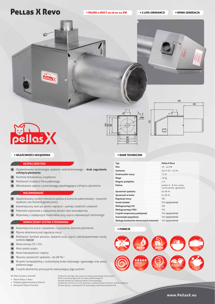 Pellas X Revo Î PALNIK o MOCY od 10 do 44 KW Î3 LATA GWARANCJI Î NOWA GENERACJA 619 250 9 248 215 185 323 Ø169 185 215 247 Î WŁAŚCIWOŚCI URZĄDZENIA Î DANE TECHNICZNE Typ: Pellas X Revo Moc: 10 - 44 kW Zasilanie: 230 V AC / 50 Hz Średni pobór mocy: 75 W Waga: 19 kg Î Możliwość instalacji filtra pyłkowego Długość podajnika: 2m Î Wbudowana zapora z przeciwwagą zapobiegająca cofnięciu płomienia Paliwa: pellets 6 - 8 mm, owies, sucha pestka, agropellet Sprawność spalania: do 99 % Sprawność w kotle: do 96 % Regulacja mocy: TAK Sonda lambda: TAK (opcjonalnie) Î Automatyczny start po zaniku napięcia – pamięć ostatnich ustawień Obsługa pompy CO: TAK Î Palenisko wykonane z najwyższej jakości stali żaroodpornej Obsługa pompy CWU: TAK Czujnik temperatury pokojowej: TAK (opcjonalnie) Automatyka pogodowa: TAK (opcjonalnie) Obsługa kolektorów słonecznych (solarów): TAK (opcjonalnie) BEZPIECZEŃSTWO Î Opatentowana technologia spalania nadciśnieniowego – brak zagrożenia cofnięcia płomienia Î Kontrola temperatury urządzenia NIEZAWODNOŚĆ Î Opatentowany system mieszania paliwa w komorze paleniskowej – znacznie wydłuża czas bezobsługowej pracy Î Wykonany z najlepszych materiałów przy użyciu najnowszych technologii NOWOCZESNY SYSTEM STEROWANIA Î Automatyczna praca: rozpalanie, czyszczenie, kontrola płomienia Î Płynna (elektroniczna) regulacja mocy Î FUNKCJE Î Możliwość kontroli procesu spalania przy użyciu szerokopasmowej sondy lambda (opcja) Î Niska emisja CO i CO2 Î Niski pobór prądu Î Niska bezwładność cieplna Î Wysoka sprawność spalania – do 99 % ! Î W pełni kompatybilny z automatyką kotła olejowego i gazowego oraz pieca piekarniczego Î Czujnik płomienia, precyzyjnie wykrywający jego poziom W skład zestawu wchodzi: y Palnik Pellas X Revo y Podajnik galwanizowany Pellas X y Sterownik Pellas R.Control 3 years CO CO2 < 75W Producent zastrzega sobie prawo do zmiany parametrów technicznych. Palnik z obudową zgłoszony do Urzędu Patentowego RP. Posiada Świadectwo Rejestracji Wzoru Przemysłowego. Świadectwo ochronne na znak towarowy i uzyskane prawo ochronne na Wzór Użytkowy. Produkt zgodny z dyrektywami UE, posiadający znak bezpieczeństwa . www.PellasX.eu
