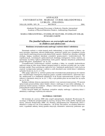 ANNALES UNIVERSITATIS MARIAE CURIE-SKŁODOWSKA LUBLIN - POLONIA VOL.LIX, SUPPL. XIV, 58 SECTIO D 2004 Akademia Wychowania Fizycznego w Krakowie, Katedra Antropologii Academy of Physical Education, Krakow, Anthropology Department MARIA CHRZANOWSKA, STANISŁAW MATUSIK, STANISŁAW GOŁĄB, RYSZARD ŻARÓW The familial influence on overweight and obesity in children and adolescents Rodzinne uwarunkowania nadwagi i otyłości dzieci i młodzieży Narastanie otyłości w wielu krajach strefy industrialnej, w tym również w Polsce, stanowi poważne zagrożenie zdrowia publicznego, ponieważ otyłość jest czynnikiem ryzyka wielu chorób stanowiących przyczynę dużej liczby zgonów. Otyłość jest chorobą o złożonej etiologii, będącą wynikiem interakcji czynników genetycznych i środowiskowych. We współczesnych, rozwiniętych społeczeństwach dominują wielogenowe formy otyłości, na ujawnienie się której wpływa polimorfizm wielu genów. Opisano dotychczas polimorfizm ponad 100 genów „kandydatów” (m. in. [5]). Uwarunkowania środowiskowe otyłości wynikają z faktu, że czynniki środowiskowe wpływać mogą na obie strony bilansu energetycznego tj. zarówno na pobór jak i na wydatkowanie energii. Prace poświęcone wpływowi tzw. zmiennych społecznych i stylu życia na częstość występowania nadwagi i otyłości u osób dorosłych oraz wśród dzieci i młodzieży są bardzo liczne (m. in. [1, 2, 3, 9]). Obie grupy wpływów tj. zarówno genetycznie uwarunkowane predyspozycje do otyłości jak i umożliwiające fenotypową ekspresję genów czynniki środowiskowe, ujmowane łącznie, analizowane są w badaniach rodzinnych. O ile licznie reprezentowane są prace z tego zakresu w literaturze obcej (m. in. [6, 7, 10]), o tyle polskie prace na ten temat nie są częste (m. in. [3, 8]). Badania rodzinne dotyczą najczęściej otyłości w jej zaawansowanej postaci. W naszym opracowaniu poszerzyliśmy zakres badań o dzieci z nadwagą (w tym otyłe) zakładając, że ponieważ otyłość narasta z wiekiem - chłopcy i dziewczęta z nadwagą w okresie rozwoju, są potencjalnymi otyłymi dorosłymi. Celem naszych badań jest określenie związków między nadwagą i otyłością dzieci i młodzieży a nadwagą i otyłością ich rodziców. MATERIAŁ I METODY Od kwietnia do czerwca 2000 roku zespół antropologów Akademii Wychowania Fizycznego w Krakowie przeprowadził na losowej, liczącej 4523 osoby próbie, badania pod nazwą „Dziecko Krakowskie 2000” [4]. Pomiary antropometryczne obejmowały dzieci i młodzież w wieku od 3 do 19 lat (chłopców – do 20 lat). Ich rodzice, na zasadzie dobrowolności, wypełniali ankietę, której pytania dotyczyły elementów samooceny położenia spo302 łecznego obojga rodziców, budowy ciała (masy i wysokości), stylu życia, w tym m. in. sposobu odżywiania dzieci, stanu zdrowia oraz deklarowanej aktywności fizycznej. Kryterium oceny nadwagi i otyłości stanowiła wartość wskaźnika BMI (Body Mass Index). Nadwagę u synów i córek określono dla każdej płci osobno na podstawie pozycji centylowej ich wskaźnika BMI [4]: do frakcji z nadwagą i otyłością zaliczono dziewczęta i chłopców, których wskaźnik masy ciała znajdował się powyżej trzeciego kwartyla (Q3) rozkładu BMI właściwej grupy wiekowej. Dla rodziców przyjęto klasyfikację wg WHO: BMI równe lub większe od 25 oznaczało występowanie nadwagi lub otyłości, co w przybliżeniu odpowiadało kryterium 75 centyla rozkładu BMI. W obu przypadkach – dzieci i ich rodziców – kryteria oceny występowania nadwagi i otyłości były więc zbliżone. Biorąc pod uwagę dychotomiczny podział: nadwaga lub otyłość występuje – nie występuje, utworzono tablice czteropolowe: synowie – ojcowie, synowie – matki, synowie – oboje rodzice oraz córki – ojcowie, córki – matki oraz córki – oboje rodzice. Analizę zależności występowania nadwagi i otyłości u dzieci w zależności od proporcji wagowowzrostowych ich rodziców przeprowadzono korzystając z testu χ2 a siłę tych związków oceniono przy pomocy współczynnika γ. WYNIKI Średni wiek matek badanych dzieci wynosi 39 lat (zakres od 22 do 65 lat) a ojców 41 lat (zakres od 23 do 72 lat). Charakterystykę wskaźnika masy ciała (BMI) ojców i matek zawiera tab. 1. Analizy rodzinnego występowania nadwagi i otyłości dokonano badając współwystępowanie kategorii: nadwaga (otyłość) – brak nadwagi (otyłości) u ojców, matek, obojga rodziców oraz ich synów i córek. Na ryc. 1. pokazano z jaką częstością występuje nadwaga (otyłość) u synów i córek kiedy ich ojcowie, matki lub oboje rodzice wykazują nadwagę (otyłość), a także w przypadku, kiedy u ojców, matek lub któregokolwiek z rodziców nadwaga (otyłość) nie występuje. Tab. 1. Podstawowe parametry statystyczne wskaźnika BMI w grupie ojców i matek Parametr Ojcowie Matki N 1500 1584 x 26,1 23,5 s 3,2 3,6 Mediana 25,8 22,9 Minimum 18,7 16,0 Maksimum 41,5 39,1 Wśród wszystkich synów, których ojcowie mają nadwagę lub są otyli, 27% cechuje nadwaga lub otyłość; nadwaga lub otyłość synów, których ojcowie nie wykazują nadwagi, występuje z częstością 22%. Odsetek synów matek z nadwagą, którzy też mają nadwagę, wynosi 31,2%, podczas gdy nadwaga synów, których matki nie są otyłe i nie mają nadwagi, występuje w 21,9% (zależność istotna statystycznie na poziomie p = 0,01, tab 2). Tab. 2. Wartości testu χ2 oraz siły związku (współczynnik γ) dla zależności występowania nadwagi i otyłości w relacji dzieci – rodzice Parametr Kombinacja synowie – ojcowie synowie – matki synowie – oboje rodzice córki – ojcowie córki – matki córki – oboje rodzice N χ2 (poziom istotności) Współczynnik γ 730 774 716 770 810 761 2,35 (0,13) 7,44 (0,01) 7,57 (0,01) 6,61 (0,01) 5,57 (0,05) 8,94 (0,01) 0,135 0,237 0,269 0,219 0,197 0,281 303 Stosunkowo najczęściej (3