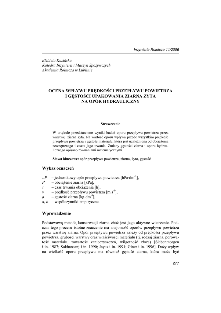 ¦InŜynieria Rolnicza 11/2006 ElŜbieta Kusińska Katedra InŜynierii i Maszyn SpoŜywczych Akademia Rolnicza w Lublinie OCENA WPŁYWU PRĘDKOŚCI PRZEPŁYWU POWIETRZA I GĘSTOŚCI UPAKOWANIA ZIARNA śYTA NA OPÓR HYDRAULICZNY Streszczenie W artykule przedstawiono wyniki badań oporu przepływu powietrza przez warstwę ziarna Ŝyta. Na wartość oporu wpływa przede wszystkim prędkość przepływu powietrza i gęstość materiału, która jest uzaleŜniona od obciąŜenia zewnętrznego i czasu jego trwania. Zmiany gęstości ziarna i oporu hydraulicznego opisano równaniami matematycznymi. Słowa kluczowe: opór przepływu powietrza, ziarno, Ŝyto, gęstość Wykaz oznaczeń ∆P P τ v ρ a, b – jednostkowy opór przepływu powietrza [hPa·dm-1], – obciąŜenie ziarna [kPa], – czas trwania obciąŜenia [h], – prędkość przepływu powietrza [m·s-1], – gęstość ziarna [kgּdm-3], – współczynniki empiryczne. Wprowadzenie Podstawową metodą konserwacji ziarna zbóŜ jest jego aktywne wietrzenie. Podczas tego procesu istotne znaczenie ma znajomość oporów przepływu powietrza przez warstwę ziarna. Opór przepływu powietrza zaleŜy od prędkości przepływu powietrza, grubości warstwy oraz właściwości materiału (tj. rodzaj ziarna, porowatość materiału, zawartość zanieczyszczeń, wilgotność złoŜa) [Siebenmorgen i in. 1987; Sokhansanj i in. 1990; Jayas i in. 1991; Giner i in. 1996]. DuŜy wpływ na wielkość oporu przepływu ma równieŜ gęstość ziarna, która moŜe być %**¦ 8_ÑU\XgT¦>hf\Åf^T¦¦ ¦ uzaleŜniona od jego wilgotności lub od sposobu napełniania zbiornika [Molenda i in. 2005a; Molenda i in. 2005b]. Do matematycznego opisu oporu przepływu powietrza przez ziarna i nasiona najczęściej stosowane są równania Erguna [1952], Shedda [1953] oraz Hukilla i Ivesa [1955]. W literaturze wyraźnie brakuje wyników badań oporów przepływu powietrza przez ziarno zboŜa upakowanego pod wpływem działania wysokich ciśnień. W silosach metalowych często wysokość napełnienia ziarnem wynosi ponad kilkanaście metrów, co powoduje jego zagęszczenie i znaczne napory na dolne warstwy ziarna. Cel pracy Celem przeprowadzonych badań było wyznaczenie oporu przepływu powietrza przez warstwę Ŝyta w zaleŜności od prędkości przepływu powietrza i gęstości ziarna. Gęstość Ŝyta zmieniała się w wyniku zewnętrznego obciąŜania o zmiennym czasie trwania. Metodyka badań Badania zostały przeprowadzone na ziarnie Ŝyta odmiany „Wibro” o wilgotności 15%. Pomiar oporu przepływu powietrza przez warstwę ziarna przeprowadzono na stanowisku pomiarowym (rys. 1), którego podstawowym elementem był wymienny zbiornik cylindryczny 1 o średnicy wewnętrznej 76 mm i wysokości od 280 do 560 mm (moŜna było umieszczać w nim próbę ziarna o grubości 120-400 mm). Zbiornik napełniano ziarnem stosując maksymalną wysokość napełnienia (400 mm). Pomiary oporu przepływu przeprowadzano przy pozornych prędkościach przepływu powietrza: 0,15; 0,3; 0,4 i 0,5 m·s-1. Przepływ powietrza przez próbę wywoływał promieniowy wentylator ssąco-tłoczący 2, którego wydajność była regulowana za pomocą autotransformatora 3. NatęŜenie przepływu powietrza mierzono za pomocą rotametru gazowego 4. Spadek ciśnienia statycznego przepływającego powietrza mierzono cieczowym mikromanometrem róŜnicowym 5. Kolejne próby ziarna poddano pionowemu obciąŜeniu zewnętrznemu o wartościach 17,5 kPa, 35 kPa, 52,5 kPa i 70 kPa. Maksymalna wartość obciąŜenia odpowiadała około 10-metrowej wysokości napełnienia materiałem silosu. Czas trwania obciąŜenia wynosił 2, 4, 12 i 24 godziny. Przed kaŜdym pomiarem oporu przepływu próbę waŜono i określano jej wysokość w celu wyznaczenia gęstości. Wszystkie pomiary przeprowadzono trzykrotnie. Konstrukcja stanowiska badawczego wykluczała powstawanie zawirowań powietrza przed i za badaną próbą dzięki zastosowaniu stoŜków doprowadzających i odprowadzających powietrze o małym kącie rozwarcia (12o). Równomierność rozkładu prędkości sprawdzano za pomocą pomiaru ciśnienia dynamicznego w określonych punktach na wejściu i wyjściu z kolumny pomiarowej. %*+¦ BVXaT¦jcÄljh¦ce~W^bÉV\!!!¦ Rys. 1. Fig. 1. Schemat stanowiska badawczego: 1 - zbiornik cylindryczny, 2 - wentylator ssąco-tłoczący, 3 – autotransformator, 4 – rotametr powietrzny, 5 – mikromanometr cieczowy Scheme of exploratory stand: 1 – cylindrical container, 2 – suctionpiston fan, 3 – autotransformer, 4 –air rotameter, 5 – liquid micromanometer Wyniki badań i ich analiza Wyniki pomiaru gęstości ziarna Ŝyta w zaleŜności od wielkości i czasu trwania obciąŜenia przedstawiono na rys. 2. Najmniejszą wartość gęstości uzyskano dla ziarna nie poddanego obciąŜeniu zewnętrznemu (0,656 kg.dm-3). ObciąŜenie próby przez dwie godziny naporem zewnętrznym o wartości od 17,5 do 70 kPa powodowało wzrost gęstości ziarna odpowiednio do 0,740 i 0,834 kg·dm-3. Największe wzrosty gęstości zaobserwowano w ciągu pierwszych czterech godzin obciąŜania próby. Po tym czasie obciąŜeniom 17,5 i 70 kPa odpowiadały gęstości 0,776 i 0,874 kg·dm-3. Największe wartości gęstości uzyskano po 24 godzinach działania obciąŜenia. W tym przypadku obciąŜenie 70 kPa wywołało wzrost gęstości do 0,886 kg·dm-3. Wzrost czasu działania obciąŜenia od 4 do 24 godzin w małym stopniu wpływał na wzrost gęstości. Analiza wariancji nie wykazała istotnych róŜnic między uzyskanymi wynikami. %*,¦ 8_ÑU\XgT¦>hf\Åf^T¦¦ ¦ 0,9 0,85 P [kPa] ρ [kg . dm-3] 0,8 17,5 35 0,75 52,5 70 0,7 0,65 0,6 0 2 4 12 24 τ [h] Rys. 2. Fig. 2. ZaleŜność gęstości ziarna Ŝyta od obciąŜenia zewnętrznego i czasu jego trwania Dependence of rye grain density on external load and time of its duration ZaleŜność gęstości Ŝyta od wartości i czasu trwania obciąŜenia moŜna opisać za pomocą następ