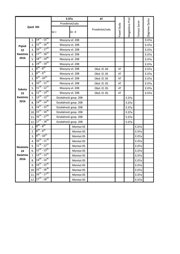 Piątek 22 Kwietnia 2016 55 40 1. 14 - 15 55 30 2. 15 - 16 35 20 3. 16 - 17 25 10 4. 17 - 18 15 00 5. 18 - 19 05 50 6 19 - 19 00 45 1. 8 - 8 50 35 2. 8 - 9 40 25 3. 9 - 10 35 20 4. 10 - 11 Sobota 23 Kwietnia 2016 30 15 10 55 55 40 35 20 5. 11 - 12 20 05 6. 12 - 13 7. 13 - 13 00 45 8. 14 - 14 9. 14 - 15 55 30 10. 15 - 16 11. 16 - 17 25 10 12. 17 - 18 00 45 1. 8 - 8 50 35 2. 8 - 9 40 25 3. 9 - 10 35 20 4. 10 - 11 Niedziela 24 Kwietnia 2016 30 15 10 55 55 40 35 20 5. 11 - 12 20 05 6. 12 - 13 7. 13 - 13 00 45 8. 14 - 14 9. 14 - 15 55 30 10. 15 - 16 11. 16 - 17 25 10 12. 17 - 18 Gr. II Przedmiot/sala Zbigniew Dyrka Gr.I Tomasz Saran Przedmiot/sala Zjazd XIII Magdalena Proć 4T Paweł Duda E.07a Maszyny el. 208 E.07a Maszyny el. 208 E.07a Maszyny el. 208 E.07a Maszyny el. 208 E.07a Maszyny el. 208 E.07a Maszyny el. 208 E.07a Maszyny el. 208 Obsł. El. 04 4T E.07a Maszyny el. 208 Obsł. El. 05 4T E.07a Maszyny el. 208 Obsł. El. 05 4T E.07a Maszyny el. 208 Obsł. El. 05 4T E.07a Maszyny el. 208 Obsł. El. 05 4T E.07a Maszyny el. 208 Obsł. El. 05 4T E.07a Działalność gosp. 208 E.07a Działalność gosp. 208 E.07a Działalność gosp. 208 E.07a Działalność gosp. 208 E.07a Działalność gosp. 208 E.07a Działalność gosp. 208 E.07a Montaż 05 E.07a Montaż 05 E.07a Montaż 05 E.07a Montaż 05 E.07a Montaż 05 E.07a Montaż 05 E.07a Montaż 05 E.07a Montaż 05 E.07a Montaż 05 E.07a Montaż 05 E.07a Montaż 05 E.07a Montaż 05 E.07a