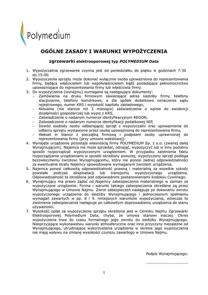 OGÓLNE ZASADY I WARUNKI WYPOŻYCZENIA zgrzewarki elektrooporowej typ POLYMEDIUM Data 1. Wypożyczalnia zgrzewarek czynna jest od poniedziałku do piątku w godzinach 7:30 do 15:00. 2. Wypożyczenia sprzętu może dokonać wyłącznie osoba upoważniona do reprezentowania firmy, będąca właścicielem lub współwłaścicielem bądź posiadająca pełnomocnictwo upoważniające do reprezentowania firmy lub właściciela firmy. 3. Do wypożyczenia (wynajmu) wymagane są następujące dokumenty: − Zamówienia na druku firmowym zawierające adres siedziby firmy, telefony stacjonarne, telefony komórkowe, a dla spółek dodatkowo oznaczenie sądu rejestrowego, numer KRS i wysokość kapitału zakładowego, − Aktualne (nie starsze niż 3 miesiące) zaświadczenie o wpisie do ewidencji działalności gospodarczej lub wypis z KRS, − Zaświadczenie o nadanym numerze identyfikacyjnym REGON, − Zaświadczenie o nadanym numerze identyfikacji podatkowej NIP, − Dowód osobisty osoby odbierającej sprzęt z wypożyczalni oraz upoważnienie do odbioru sprzętu wystawione przez osobę upoważnioną do reprezentowania firmy, − Weksel in blanco z pieczątką firmową i podpisem osoby uprawnionej do reprezentowania firmy (przy umowie wekslowej). 4. Wynajęte urządzenie pozostaje własnością firmy POLYMEDIUM Sp. z o.o. (zwanej dalej Wynajmującym). Najemca nie może sprzedać, odnająć, wypożyczyć lub w inny podobny sposób rozporządzać wypożyczonym urządzeniem. W przypadku zaistnienia faktu rozporządzania urządzeniami w sposób określony powyżej, wypożyczony sprzęt podlega bezzwłocznemu zwrotowi Wynajmującemu, który nie ponosi żadnej odpowiedzialności za ewentualne straty Najemcy spowodowane wymaganym zwrotem urządzenia. 5. Najemca ponosi całkowitą odpowiedzialność prawną i materialną za wszelkie szkody powstałe podczas eksploatacji lub transportu wypożyczonego urządzenia. Odpowiedzialność ta określona jest odpowiednimi postanowieniami Kodeksu Cywilnego. 6. Wynajmujący ma prawo żądać od Najemcy zabezpieczenia materialnego w zamian za wypożyczone urządzenie. Forma i warunki takiego zabezpieczenia określane są przez Wynajmującego w Umowie Najmu. Zwrot zabezpieczeń następuje po dokonaniu zwrotu wypożyczonego urządzenia do siedziby Wynajmującego i jednoczesnym spełnieniu wymagań zawartych w pp. 8 i 9. niniejszych warunków wypożyczania, wówczas to zwolnienie zabezpieczenia następuje po całkowitym doprowadzeniu urządzenia do stanu używalności. 7. Wysokość opłat za wypożyczenie sprzętu określona jest w Cenniku Najmu Zgrzewarki Elektrooporowej Polymedium Data, chyba, że umowa stanowi inaczej. Okres wypożyczenia trwa do czasu formalnego jego zwrotu do siedziby Wynajmującego. Niesprzyjające wykonawstwu warunki atmosferyczne oraz inne przyczyny niezależne od Wynajmującego, utrudniające wykorzystanie urządzenia w okresie jego wypożyczenia nie mają wpływu na zmianę wysokości czynszu zawartego w Umowie Najmu. Podpis Wynajmującego: ................................. 1 8. Zwracane urządzenia muszą być w pełni sprawne z punktu widzenia ich przeznaczenia i nie mogą posiadać uszkodzeń świadczących o niewłaściwym ich użytkowaniu. Sprzęt musi być zwrócony Wynajmującemu w takim stanie w jakim został wynajęty (wyjątek stanowi zużycie podczas normalnej eksploatacji), w innym przypadku Najemca zostanie obciążony kosztami czyszczenia, remontu, odnowienia lub wymiany części. Za niezwrócone elementy sprzętu Najemca zostanie obciążony kosztami ich uzupełnienia. 9. Po zakończeniu okresu wypożyczenia Najemca zobowiązany jest do zwrotu wypożyczonego sprzętu do siedziby Wynajmującego. Przekazanie Wynajmującemu wypożyczonego sprzętu może nastąpić tylko w obecności pracownika Działu Serwisu i Wypożyczalni wynajmującego. 10. POLYMEDIUM Sp. z o.o. zachowuje nieograniczone prawo dostępu do miejsca, w którym będzie znajdował się wypożyczony sprzęt, aby zapewnić sobie możliwość odzyskania go w przypadku gdyby Najemca naruszył którykolwiek z ww. warunków. Koszty związane z odzyskaniem sprzętu obciążać będą Najemcę. 11. O fakcie zaistnienia wszelkich uszkodzeń lub niezadowalającej pracy urządzenia należy bezzwłocznie, w formie pisemnej informować Wynajmującego, 12. Najemca jest zobowiązany do pokrycia kosztów awarii, uszkodzenia lub zagubienia urządzenia, spowodowanych przez Najemcę lub jego pracowników, według cen obowiązujących u Wynajmującego (wartość urządzenia Polymedium Data - 10.000 PLN + VAT). O fakcie zaistnienia wymienionych zdarzeń należy bezzwłocznie poinformować Wynajmującego w formie pisemnej. 13. Najemca nie może usuwać, zmazywać lub zakrywać tabliczki z nazwą lub znakiem POLYMEDIUM Sp. z o.o., lub umieszczać na urządzeniu oznaczeń wskazujących na to, że jest jego właścicielem. 14. Do wykonywania wszelkich napraw wypożyczonych urządzeń upoważniony jest tylko i wyłącznie Wynajmujący. 15. Organizacja i koszt transportu urządzenia z siedziby i do siedziby Wynajmującego spoczywa na Najemcy. 16. Ubezpieczenie przedmiotu najmu od wszelkich ryzyk obciąża Najemcę. W przypadku ubezpieczenia wypożyczonego sprzętu, ewentualne odszkodowania muszą być scedowane na Wynajmującego. 17. Za zwrot niewyczyszczonej maszyny pobierana będzie opłata w wysokości 100 zł do 500 zł. 18. Przy płatnościach za wynajem, których wartość nie przekracza 500 zł, zapłata możliwa jest jedynie gotówką. POLYMEDIUM Sp. z o.o. 44-200 Rybnik, ul. Wodzisławska 6/3 NIP: 6423032499 REGON 240845527 Kapitał zakładowy 500.000 PLN Sąd Rejonowy w Gliwicach X Wydział Gospodarczy Krajowego Rejestru Sądowego Numer KRS 0000298830 Biuro Handlowe: 44-240 Żory ul. Boczna 8 ( Żorski Park Przemysłowy, Budynek nr 5 ) tel./fax. (32) 42-46-411, (32) 42-46-412 e-mail: [email protected] Podpis pracownika Serwisu i Wypożyczalni: ......................................
