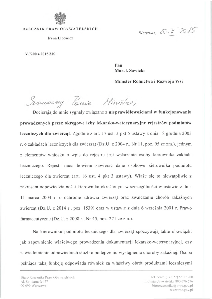 RZECZNI K PRAW OBYWATELSKICH Warszawa, ¿O Jf . Irena Lipowicz Y.7200.4.2015.ŁK Pan Marek Sawicki Minister Rolnictwa i Rozwoju Wsi Docierają do mnie sygnały związane z nieprawidłowościami w funkcjonowaniu prowadzonych przez okręgowe izby lekarsko-weterynaryjne rejestrów podmiotów leczniczych dla zwierząt. Zgodnie z art. 17 ust. 3 pkt 5 ustawy z dnia 18 grudnia 2003 r. o zakładach leczniczych dla zwierząt (Dz.U. z 2004 r., Nr 11, poz. 95 ze zm.), jednym z elementów wniosku o wpis do rejestru jest wskazanie osoby kierownika zakładu leczniczego. Rejestr musi bowiem zawierać dane osobowe kierownika podmiotu leczniczego dla zwierząt (art. 16 ust. 4 pkt 3 ustawy). Wiąże się to niewątpliwie z zakresem odpowiedzialności kierownika określonym w szczególności w ustawie z dnia 11 marca 2004 r. o ochronie zdrowia zwierząt oraz zwalczaniu chorób zakaźnych zwierząt (Dz.U. z 2014 r., poz. 1539) oraz w ustawie z dnia 6 września 2001 r. Prawo farmaceutyczne (Dz.U. z 2008 r., Nr 45, poz. 271 ze zm.). Na kierowniku podmiotu leczniczego dla zwierząt spoczywają takie obowiązki jak zapewnienie właściwego prowadzenia dokumentacji lekarsko-weterynaryjnej, czy zawiadomienie odpowiednich służb o podejrzeniu wystąpienia choroby zakaźnej. Osoba pełniąca taką funkcję odpowiada również za właściwy obrót produktami leczniczymi Biuro Rzecznika Praw Obywatelskich Al. Solidarności 77 00-090 Warszawa Tel. centr. (+48 22) 55 17 700 Infolinia obywatelska 800 676 676 [email protected] www.rpo.gov.pl dla zwierząt. Nieprzestrzeganie odpowiedzialności karnej obowiązków na podstawie prowadzić przepisów natomiast wskazanych ustaw. może W do tym kontekście, dane znajdujące się w rejestrach zakładów leczniczych dla zwierząt, z uwagi na domniemanie ich zgodności ze stanem faktycznym, nabierają szczególnego znaczenia. Tymczasem, jak wskazują kierowane do mnie skargi, zdarza się, że właściciele podmiotów leczniczych dla zwierząt, wnioskując o wpis do rejestru zakładów leczniczych dla zwierząt, wskazują jako kierownika zakładu osobę, która nigdy takiej funkcji nie przyjęła i zatrudniła się jedynie jako „szeregowy” lekarz weterynarii. Taki, niezgodny ze stanem faktycznym wniosek o wpis do rejestru, nie jest w żaden sposób weryfikowany przez właściwą okręgową izbę lekarko-weterynaryjną. Wynika to z tej okoliczności, że do wniosku o wpis, wnioskodawca załącza oświadczenie o zgodności zawartych w nim danych z prawdą. Brak weryfikacji tego, czy osoby wskazane jako kierownik zakładu leczniczego dla zwierząt rzeczywiście pełnią taką funkcję narażać może wspomniane osoby na ryzyko poniesienia odpowiedzialności, w tym karnej, za wystąpienie ewentualnych nieprawidłowości w zakładzie leczniczym, którego są rzekomo kierownikami. Co istotne, sami zainteresowani lekarze weterynarii, nie są w stanie tego zagrożenia usunąć. W postępowaniu o wpis w rejestrze nie przysługują im bowiem prawa strony, toteż uchwała okręgowej izby lekarsko-weterynaryjnej o wpisie nie jest im doręczana, a nawet jeżeli powezmą o niej informację, i tak nie są legitymowani do jej zaskarżenia. W jednej z tego rodzaju spraw, sama zaskarżyłam uchwałę o wpisie zmian do ewidencji zakładów leczniczych dla zwierząt polegającą na wpisaniu jako kierownika zakładu lekarza, który nigdy takiej funkcji nie pełnił. Niewykluczone, że podobne interwencje będę musiała podjąć również w innych, podobnych sprawach. W związku z powyższym, działając na podstawie art. 13 ust. 1 pkt 2 ustawy z dnia 15 lipca 1987 r. o Rzeczniku Praw Obywatelskich (Dz.U. z 2014 r., poz. 1648), zwracam się do Pana Ministra o przedstawienie stanowiska w omawianej sprawie. W szczególności proszę o wskazanie, czy dostrzega Pan Minister konieczność nowelizacji regulacji dotyczących rejestrów zakładów leczniczych dla zwierząt poprzez umożliwienie okręgowym izbom lekarsko-weterynaryjnym weryfikacji prawdziwości danych zawartych we wniosku o wpis, np. poprzez wprowadzenie obowiązku dołączania do wniosku oświadczenia kierownika podmiotu leczniczego dla zwierząt o objęciu tej funkcji. f