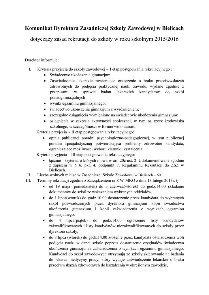 Komunikat Dyrektora Zasadniczej Szkoły Zawodowej w Bielicach dotyczący zasad rekrutacji do szkoły w roku szkolnym 2015/2016 Dyrektor informuje: I. II. III. Kryteria przyjęcia do szkoły zawodowej - I etap postępowania rekrutacyjnego : Świadectwo ukończenia gimnazjum Zaświadczenie lekarskie zawierające orzeczenie o braku przeciwwskazań zdrowotnych do podjęcia praktycznej nauki zawodu, wydane zgodnie z przepisami w sprawie badań lekarskich kandydatów do szkół ponadgimnazjalnych wyniki egzaminu gimnazjalnego; świadectwo ukończenia gimnazjum z wyróżnieniem; szczególne osiągnięcia wymienione na świadectwie ukończenia gimnazjum: osiągnięcia w zakresie aktywności społecznej, w tym na rzecz środowiska szkolnego, w szczególności w formie wolontariatu; Kryteria przyjęcia - II etap postępowania rekrutacyjnego: opinia publicznej poradni psychologiczno-pedagogicznej, w tym publicznej poradni specjalistycznej potwierdzająca problemy zdrowotne kandydata, ograniczające możliwości wyboru kierunku kształcenia. Kryteria przyjęcia – III etap postępowania rekrutacyjnego: łącznie kryteria, o których mowa w art. 20c ust. 2. Udokumentowane zgodnie z zapisem w § 6. pkt. 4, podpunkt 7. Regulaminu Rekrutacji do ZSZ w Bielicach. Liczba wolnych miejsc w Zasadniczej Szkole Zawodowej w Bielicach – 60 Terminy rekrutacji zgodnie z Zarządzeniem nr 8 W-MKO z dnia 13 lutego 2013r. tj. od 19 maja (poniedziałek) do 3 czerwca(wtorek) do godz.14.00 składanie dokumentów do szkół ze wskazaniem wybranych oddziałów, do 1 lipca(wtorek) do godz.10.00 dostarczenie przez kandydata do wybranych szkół poświadczonych przez dyrektora gimnazjum kopii świadectwa ukończenia gimnazjum i kopii zaświadczenia o wynikach egzaminu gimnazjalnego, do 4 lipca(piątek) do godz.14.00 ogłoszenie listy kandydatów zakwalifikowanych i listy kandydatów niezakwalifikowanych do szkoły przez dyrektora szkoły, do 8 lipca (wtorek) do godz.14.00 złożenie przez kandydata oświadczenia woli podjęcia nauki w danej szkole poprzez dostarczenie oryginałów świadectwa ukończenia gimnazjum i zaświadczenia o wynikach egzaminu gimnazjalnego. Kandydaci do szkół zawodowych otrzymują ze szkoły skierowanie na badania do lekarza medycyny pracy, który wydaje zaświadczenie lekarskie o braku przeciwwskazań zdrowotnych do kształcenia w określonym zawodzie, IV. V. do 10 lipca (czwartek) do godz.14.00 podanie do publicznej wiadomości listy kandydatów przyjętych i nieprzyjętych do szkoły, 11 lipca (piątek) do godz.14.00 przesłanie przez dyrektorów szkół do Kuratorium Oświaty w Olsztynie informacji o wolnych miejscach w oddziałach, 14 lipca (poniedziałek) do godz.14.00 umieszczenie na stronie internetowej KO informacji o liczbie wolnych miejsc w oddziałach, przeprowadzenie dodatkowego postępowania uzupełniającego w szkołach, które dysponują wolnymi miejscami: 11-14 sierpnia 2014 r. - I termin postępowania uzupełniającego: 25-29 sierpnia 2014 r. - II termin postępowania uzupełniającego: Wymagane dokumenty do rekrutacji: Kopia świadectwa ukończenia gimnazjum poświadczona za zgodność z oryginałem; Kopia zaświadczenia o wynikach egzaminu gimnazjalnego poświadczona za zgodność z oryginałem; Opinie lub orzeczenia poradni psychologiczno – pedagogicznej; Zaświadczenie lekarskie zawierające orzeczenie o braku przeciwwskazań zdrowotnych do podjęcia praktycznej nauki zawodu, wydane zgodnie z przepisami w sprawie badań lekarskich kandydatów do szkół ponadgimnazjalnych . Informacje o stanie zdrowia dziecka, chorobach przewlekłych, stosowanych dietach, alergiach itp.; Inne informacje ważne dla prawidłowego funkcjonowania dziecka w szkole. 2 zdjęcia legitymacyjne; Dokumenty dotyczące kryteriów zawartych w Art.20c Ustawy o systemie oświaty z dnia 6 grudnia 2013 r. tj.: oświadczenie o wielodzietności rodziny kandydata, dokument potwierdzający niepełnosprawność kandydata, jego rodziców lub rodzeństwa, oświadczenie o samotnym wychowywaniu kandydata w rodzinie lub dokument poświadczający objęcie go piecza zastępczą Dokumenty dostępne są na stronie www.bielice.com lub w Sekretariacie szkoły. Szczegółowe zasady rekrutacji dostępne są w Regulaminie Rekrutacji do Zasadniczej Szkoły Zawodowej w Bielicach dostępnym na stronie www.bielice.com w zakładce Rekrutacja lub w Sekretariacie szkoły. p.o. Dyrektora Marzena Gapska