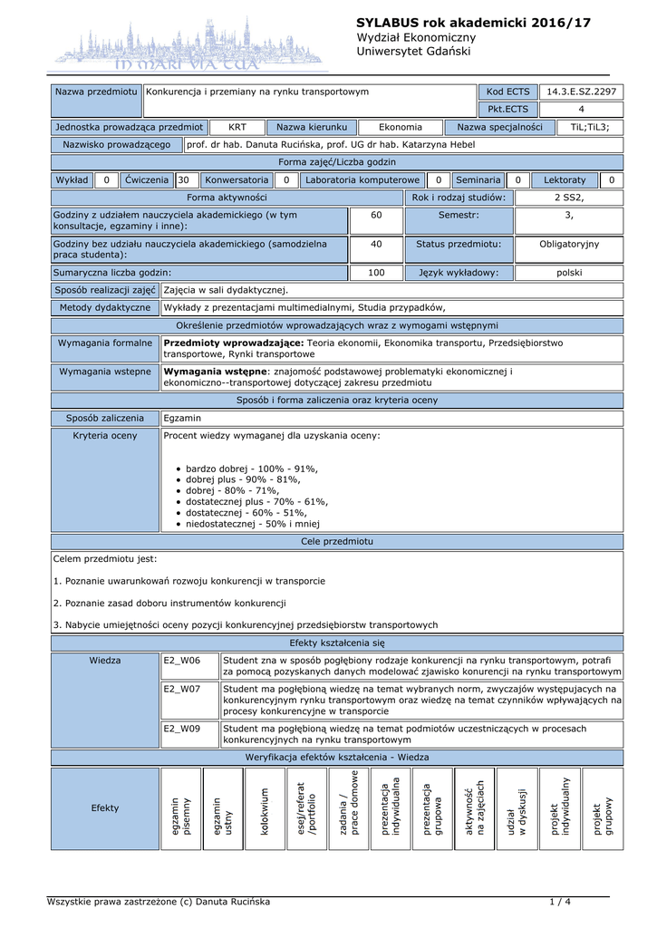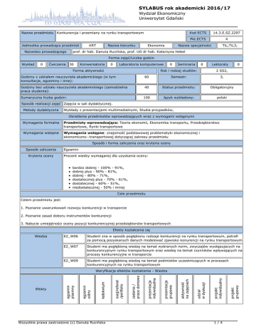 SYLABUS rok akademicki 2016/17 Wydział Ekonomiczny Uniwersytet Gdański Nazwa przedmiotu Konkurencja i przemiany na rynku transportowym Jednostka prowadząca przedmiot Nazwisko prowadzącego KRT Nazwa kierunku Ekonomia Kod ECTS 14.3.E.SZ.2297 Pkt.ECTS 4 Nazwa specjalności TiL;TiL3; prof. dr hab. Danuta Rucińska, prof. UG dr hab. Katarzyna Hebel Forma zajęć/Liczba godzin Wykład 0 Ćwiczenia 30 Konwersatoria 0 Laboratoria komputerowe Forma aktywności 0 Seminaria 0 Lektoraty Rok i rodzaj studiów: 2 SS2, Godziny z udziałem nauczyciela akademickiego (w tym konsultacje, egzaminy i inne): 60 Semestr: 3, Godziny bez udziału nauczyciela akademickiego (samodzielna praca studenta): 40 Status przedmiotu: Obligatoryjny 100 Język wykładowy: polski Sumaryczna liczba godzin: 0 Sposób realizacji zajęć Zajęcia w sali dydaktycznej. Metody dydaktyczne Wykłady z prezentacjami multimedialnymi, Studia przypadków, Określenie przedmiotów wprowadzających wraz z wymogami wstępnymi Wymagania formalne Przedmioty wprowadzające: Teoria ekonomii, Ekonomika transportu, Przedsiębiorstwo transportowe, Rynki transportowe Wymagania wstepne Wymagania wstępne: znajomość podstawowej problematyki ekonomicznej i ekonomiczno--transportowej dotyczącej zakresu przedmiotu Sposób i forma zaliczenia oraz kryteria oceny Sposób zaliczenia Kryteria oceny Egzamin Procent wiedzy wymaganej dla uzyskania oceny: bardzo dobrej - 100% - 91%, dobrej plus - 90% - 81%, dobrej - 80% - 71%, dostatecznej plus - 70% - 61%, dostatecznej - 60% - 51%, niedostatecznej - 50% i mniej Cele przedmiotu Celem przedmiotu jest: 1. Poznanie uwarunkowań rozwoju konkurencji w transporcie 2. Poznanie zasad doboru instrumentów konkurencji 3. Nabycie umiejętności oceny pozycji konkurencyjnej przedsiębiorstw transportowych Efekty kształcenia się Wiedza E2_W06 Student zna w sposób pogłębiony rodzaje konkurencji na rynku transportowym, potrafi za pomocą pozyskanych danych modelować zjawisko konurencji na rynku transportowym E2_W07 Student ma pogłębioną wiedzę na temat wybranych norm, zwyczajów występujacych na konkurencyjnym rynku transportowym oraz wiedzę na temat czynników wpływających na procesy konkurencyjne w transporcie E2_W09 Student ma pogłębioną wiedzę na temat podmiotów uczestniczących w procesach konkurencyjnych na rynku transportowym Weryfikacja efektów kształcenia - Wiedza Efekty Wszystkie prawa zastrzeżone (c) Danuta Rucińska 1/4 SYLABUS rok akademicki 2016/17 Wydział Ekonomiczny Uniwersytet Gdański E2_W06 X X X X E2_W07 X X X X E2_W09 X X X X Umiejętności E2_U01 Student potrafi analizować konkurencję i przemiany na rynku transportowym oraz prawidłowo obserwować, interpretować i wyjaśniać procesy konkurencyjne w transporcie E2_U02 Student potrafi wykorzystać teoretyczną i specjalistyczną wiedzę do opisu i analizy przyczyn oraz przebiegu prosesów konkurencyjnych w transporcie oraz formułować własne opinie na temat konkurencji w transporcie E2_U03 Student potrafi w oparciu o inforamcje pochodzące z rynku analizować przebieg i skutki konkurencji w transporcie E2_U08 Student posiada umiejetność samodzielnego analizowania konkurencji w transporcie oraz odpowiednio dokonać analizy tego rynku Weryfikacja efektów kształcenia - Umiejętności Efekty E2_U01 X X X E2_U02 X X X E2_U03 X X X E2_U08 X X X Kompetencje E2_K01 Student rozumie potrzebę uczenia się, weryfikauje stan swojej wiedzy E2_K04 Student prawidłowo identyfikuje, diagnozuje i rozstrzyga dylematy oraz różne warianty rozwiązań związane z prowadzeniem działalności w zakresie transportu E2_K07 Student potrafi działać w sposób przedsiębiorczy na konkurencyjnym rynku transportowym E2_K08 Student cechuje się wartościami osobistymi, etyką i społeczną odpowiedzialnością biznesu oraz lojalnością wobec innych Weryfikacja efektów kształcenia - Kompetencje Efekty E2_K01 X X E2_K04 X X E2_K06 X X E2_K08 X X Treści programowe 1. Tematyka zajęć: Uwarunkowania konkurencyjności przedsiębiorstw transportowych Uwarunkowania techniczne konkurencyjności przedsiębiorstw transportowych Uwarunkowania ekologiczne konkurencyjności przedsiębiorstw transportowych Uwarunkowania prawno-organizacyjne konkurencyjności przedsiębiorstw transportowych 2. Tematyka zajęć: Strategie cenowe kształtujące konkurencyjność przedsiębiorstwa transportowego Wszystkie prawa zastrzeżone (c) Danuta Rucińska 2/4 SYLABUS rok akademicki 2016/17 Wydział Ekonomiczny Uniwersytet Gdański Cena jako element strategii przedsiębiorstw transportowych Cena a przewaga nad konkurencją przedsiębiorstw transportowych Informacja o cenie a strategie konkurencji przedsiębiorstw transportowych 3. Tematyka zajęć: Formy konkurencji przedsiębiorstw transportowych Alianse a rozwój przedsiębiorstw transportowych Alianse jako element strategii przedsiębiorstw transportowych Alianse wspólnej integracji i pseudokoncentracji Pozostałe formy konkurencji 4. Tematyka zajęć: Podstawy analizy przeobrażeń rynku TSL Cele, cechy i zakres przeobrażeń rynku TSL Działania regulacyjne wobec rynku TSL - deregulacja, liberalizacja, systemowa integracja, swoboda przedsiębiorczości, wolny rynek i konkurencja Czynniki i bariery funkcjonowania oraz rozwoju rynku TSL Europejska polityka transportowa wobec rynku TSL 5. Tematyka zajęć: Efekty przeobrażeń rynkowych w sektorze TSL Struktura współczesnego rynku TSL Procesy konsolidacyjne na rynku TSL Transportowa integracja rynków transgranicznych Rynek TSL a koniunktura gospodarcza 6. Tematyka zajęć: Procesy i zachowania adaptacyjne podmiotów TSL w warunkach integracji oraz internacjonalizacji Mechanizmy adaptacji podmiotów TSL do rynkowych przeobrażeń i uwarunkowań Zdolność przedsiębiorstw TSL do transformacji - ujęcie gałęziowe Wzory rynkowych działań adaptacyjnych podmiotów na rynku TSL Ocena zachowań podmiotów na europejskim rynku TSL 7. Tematyka zajęć: Kierunki przeobra