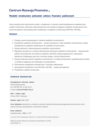 Wydatki strukturalne jednostek sektora finansów publicznych Celem szkolenia jest podniesienie wiedzy i umiejętności w zakresie zasad klasyfikowania wydatków jako wydatki strukturalne, obliczania, dokumentowania oraz ewidencji księgowej wydatków strukturalnych oraz zasad sporządzania sprawozdawczości budżetowej o wydatkach strukturalnych RB-WSa i RB-WSb. PROGRAM: 1. Przepisy prawne obowiązujące w zakresie wydatków strukturalnych. 2. Klasyfikacja wydatków strukturalnych – obszary tematyczne i kody wydatków strukturalnych, zasady klasyfikowania wydatków budżetowych do wydatków strukturalnych. 3. Zasady obliczania i dokumentowania wydatków strukturalnych. 4. Regulacje wewnętrzne w zakresie dokumentacji dotyczącej wydatków strukturalnych – dostosowanie polityki rachunkowości do ewidencji wydatków: jednolite zasady przygotowania i opisywania dokumentu źródłowego, plan kont, instrukcja obiegu i kontroli dokumentów. 5. Zasady ewidencjonowania wydatków strukturalnych: w ewidencji bilansowej i pozabilansowej; korekty w ewidencji księgowej roku bieżącego i lat poprzednich. 6. Eliminowanie przepływów wewnętrznych i wewnątrz sektorowych. 7. Sprawozdanie budżetowe roczne Rb-WSa i Rb-WSb – zasady sporządzania. 8. Przykładowe wydatki strukturalne. INFORMACJE ORGANIZACYJNE: Szczegółowych informacji udziela: Ewelina Rykaczewska tel.: 509 998 703, 22 664 56 32 E-mail: [email protected] Data i miejsce zajęć: 10 luty 2016r. Warszawa Godziny zajęć:10:00-15:00 Cena obejmuje:uczestnictwo w szkoleniu, autorskie materiały szkoleniowe przygotowane przez trenera, lunch, przerwy kawowe, zaświadczenie o ukończenie szkolenia Koszt szkolenia: od jednej osoby - 350 zł + VAT* * cena bez VAT dla opłacających szkolenie w co najmniej 70% ze środków publicznych Płatności prosimy dokonać po otrzymaniu potwierdzenia na konto: ALIOR BANK S.A. 98 2490 0005 0000 4500 6222 8867 Uprzejmie prosimy na przelewie umieścić temat, datę szkolenia oraz nazwiska uczestników. Zgłoszenia prosimy nadsyłać faksem na nr 22 203 62 18 lub mailem [email protected] Warunki rezygnacji:Rezygnację przyjmujemy najpóźniej na 7 dni przed szkoleniem w formie pisemnej. Rezygnacja w późniejszym terminie wiąże się z koniecznością pokrycia kosztów w 100%. Nieobecność na szkoleniu nie zwalnia z dokonania opłaty.