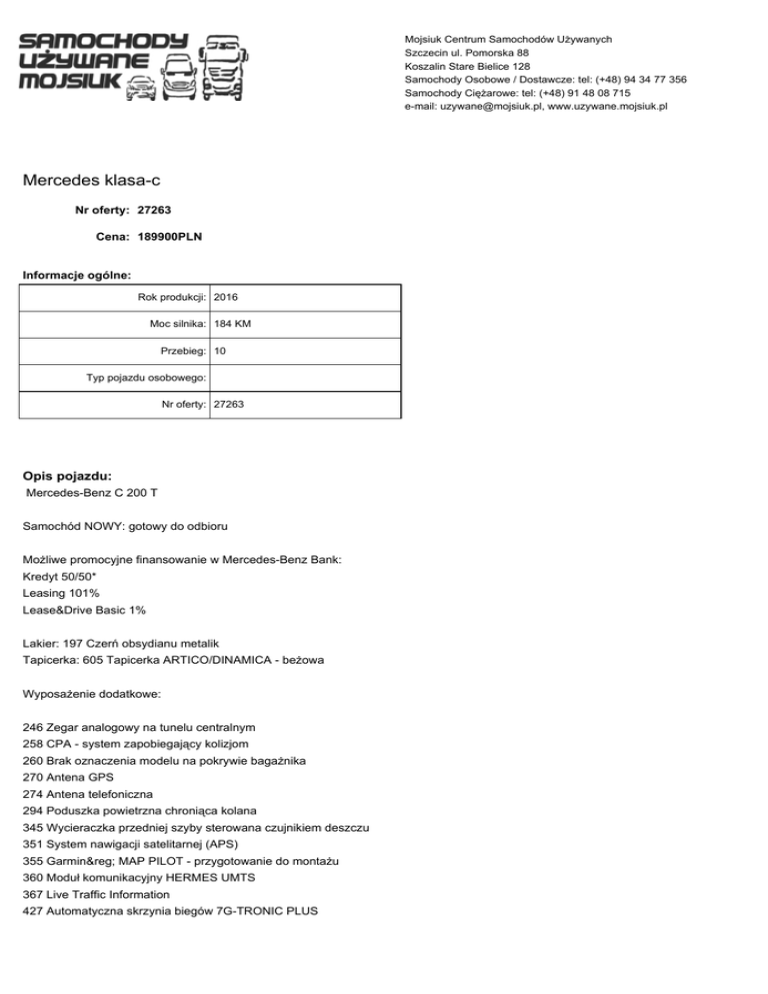 Mojsiuk Centrum Samochodów Używanych Szczecin ul. Pomorska 88 Koszalin Stare Bielice 128 Samochody Osobowe / Dostawcze: tel: (+48) 94 34 77 356 Samochody Ciężarowe: tel: (+48) 91 48 08 715 e-mail: [email protected], www.uzywane.mojsiuk.pl Mercedes klasa-c Nr oferty: 27263 Cena: 189900PLN Informacje ogólne: Rok produkcji: 2016 Moc silnika: 184 KM Przebieg: 10 Typ pojazdu osobowego: Nr oferty: 27263 Opis pojazdu: Mercedes-Benz C 200 T Samochód NOWY: gotowy do odbioru Możliwe promocyjne finansowanie w Mercedes-Benz Bank: Kredyt 50/50* Leasing 101% Lease&Drive Basic 1% Lakier: 197 Czerń obsydianu metalik Tapicerka: 605 Tapicerka ARTICO/DINAMICA - beżowa Wyposażenie dodatkowe: 246 Zegar analogowy na tunelu centralnym 258 CPA - system zapobiegający kolizjom 260 Brak oznaczenia modelu na pokrywie bagażnika 270 Antena GPS 274 Antena telefoniczna 294 Poduszka powietrzna chroniąca kolana 345 Wycieraczka przedniej szyby sterowana czujnikiem deszczu 351 System nawigacji satelitarnej (APS) 355 Garmin® MAP PILOT - przygotowanie do montażu 360 Moduł komunikacyjny HERMES UMTS 367 Live Traffic Information 427 Automatyczna skrzynia biegów 7G-TRONIC PLUS 440 Tempomat 448 Touchpad do sterowania systemem telemtycznym 475 Kontrola ciśnienia w oponach (RDK) 522 Audio 20 CD 55U Podsufitka materiałowa - porcelanowa 580 THERMATIC - klimatyzacja automatyczna 5U3 AIRPANEL 642 Reflektory LED ILS 682 Zamontowana gaśnica 818 Odtwarzacz CD 840 Przyciemniane szyby z funkcją termoizolacji 873 Podgrzewane fotele przednie 877 Oświetlenie ambient 890 EASY-PACK - elektrycznie sterowana tylna klapa 8U8 Mocowanie fotelików dziecięcych i-Size/ISOFIX 916 Zbiornik paliwa o zwiększonej pojemności (66l) 920 Bezpośredni wtrysk paliwa B03 Funkcja start/stop B51 TIREFIT – zestaw naprawczy B59 DYNAMIC SELECT D0A Gaśnica D0C Dokumentacja Mercedes-Benz D0D Transport do dealera K11 Adaptacyjne światła stopu P22 EXCLUSIVE – elementy wewnętrzne 287 Składana tylna kanapa 605 Tapicerka ARTICO/DINAMICA - beżowa 876 Pakiet oświetlenia wnętrza H07 Elementy wykończenia wnętrza - drewno lipy, wysoki połysk P23 EXCLUSIVE – elementy zewnętrzne 22R 18” obręcze z metali lekkich, 5 podwójnych ramion, szarość termolitu, P: 245/45 R 18, T: 275/40 R 18 485 Zawieszenie komfortowe 725 Aluminiowe relingi dachowe P44 Pakiet asystenta parkowania 218 Kamera cofania 235 PARKTRONIC z aktywnym asystentem parkowania P49 Pakiet lusterek 249 Fotochromatyczne lusterko wsteczne i boczne po stronie kierowcy 500 Elektrycznie składane lusterka zewnętrzne 611 Oświetlenie powitalne w lusterkach bocznych P54 Pakiet zabezpieczenia pojazdu 551 Alarm antywłamaniowy (EDW) 882 Zabezpieczenie wnętrza pojazdu R01 Opony letnie U09 Górna część deski rozdzielczej oraz wewnętrzny górny rant drzwi obszyte ekologiczną skórą ARTICO U10 automatyczna dezaktywacja przedniej poduszki powietrznej pasażera U25 Podświetlane listwy progowe U60 Ochrona pieszych Niniejsze ogłoszenie jest wyłącznie informacją handlową i nie stanowi oferty w myśl art. 66, § 1. Kodeksu Cywilnego. Sprzedający nie odpowiada za ewentualne błędy lub nie aktualność ogłoszenia. W celu uzyskania dodatkowych informacji prosimy o kontakt: TEL. +48 696 173 803 TEL. +48 608 668 621 TEL. +48 600 994 787 PRZYJMUJEMY W ROZLICZENIU INNE POJAZDY nr oferty: 06-07182 Jest to informacja handlowa nie stanowiąca oferty w rozumieniu prawa cywilnego, kolory na zdjęciach mogą być inne niż w rzeczywistości. Oferta nie przedstawia rzeczywistych stanów magazynowych
